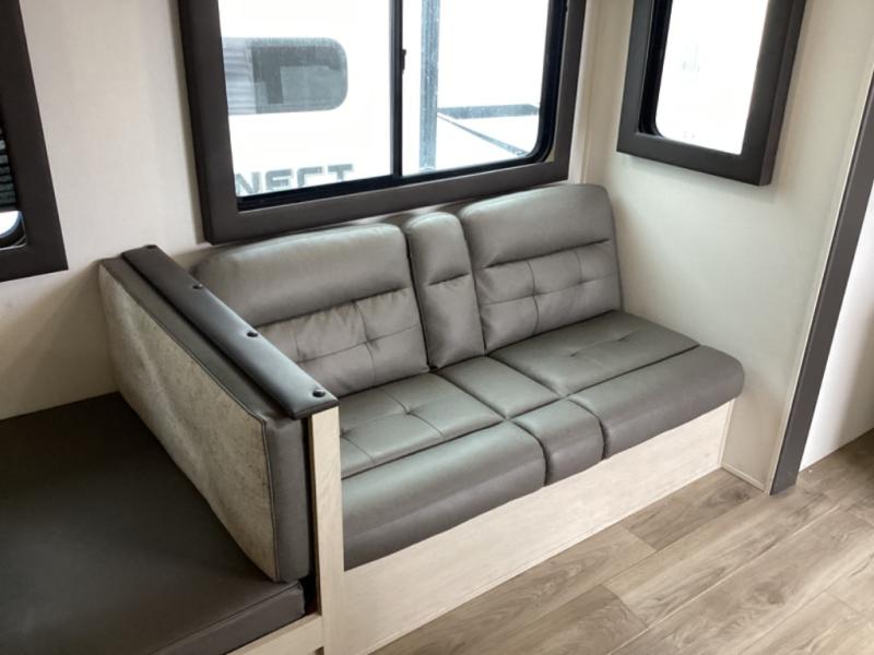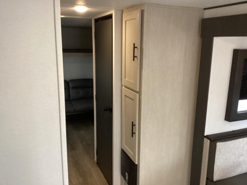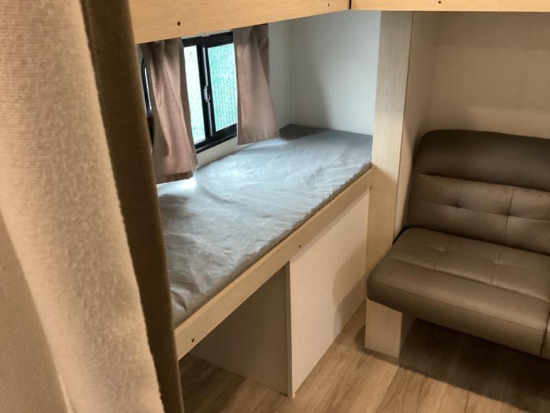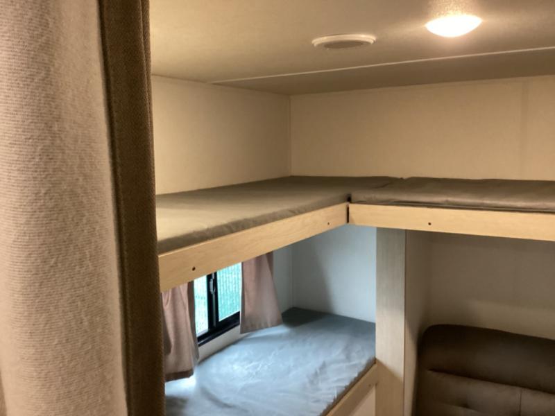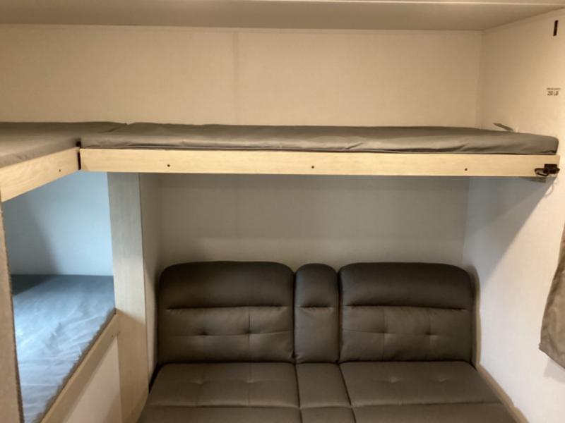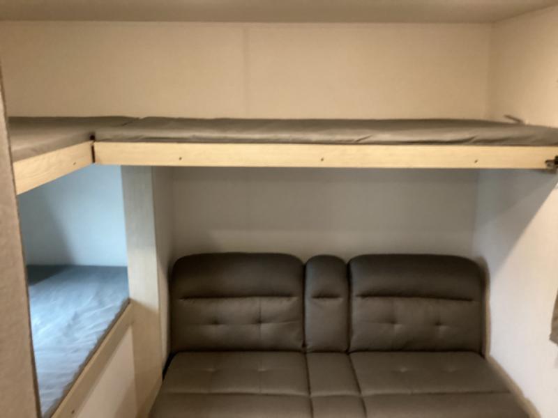 The little ones or your guests will love the bunkhouse in this spacious trailer. There area a set of 26" x 74" bunks, along with a flip-up bunk above a sofa they can sleep and relax. You'll find your own space in the front bedroom that includes a walk-around queen bed and dual wardrobes. Everyone can meet in the middle living area and kitchen to dine around the booth dinette or relax on the sofa. The chef will be able to create delicious meals each day on the three burner cooktop, and there is a residential style refrigerator for perishables. And the mid-coach full bath is sure to come in handy after a day of swimming or hiking!