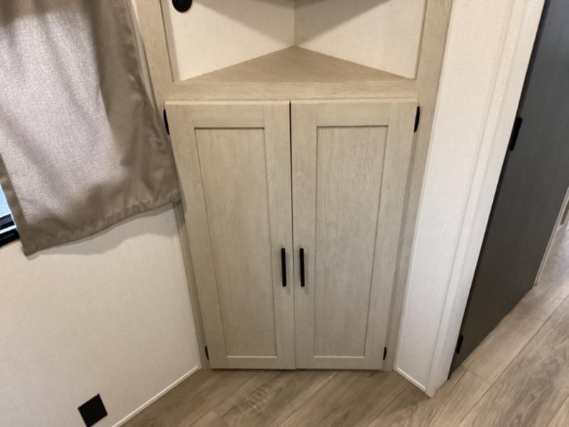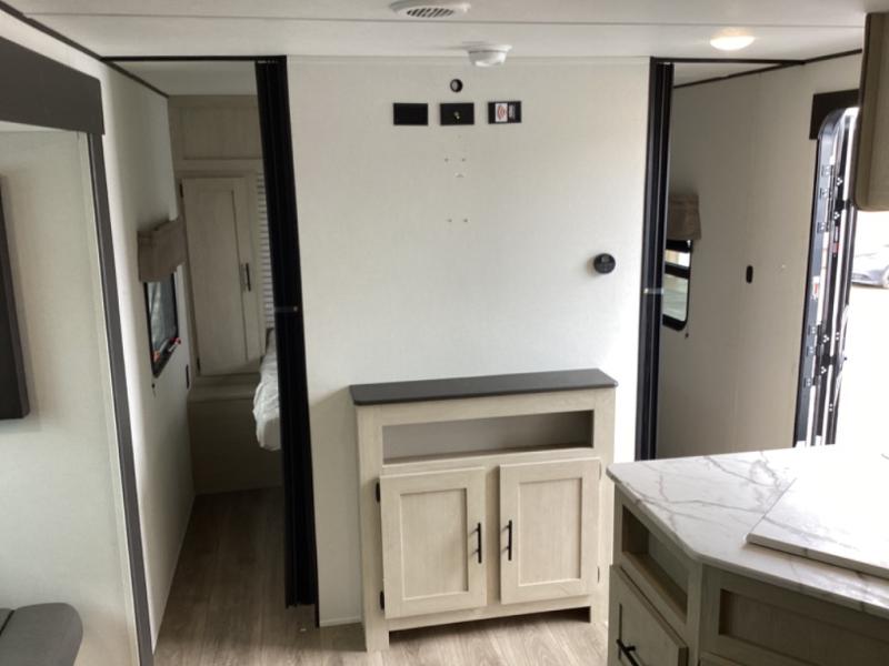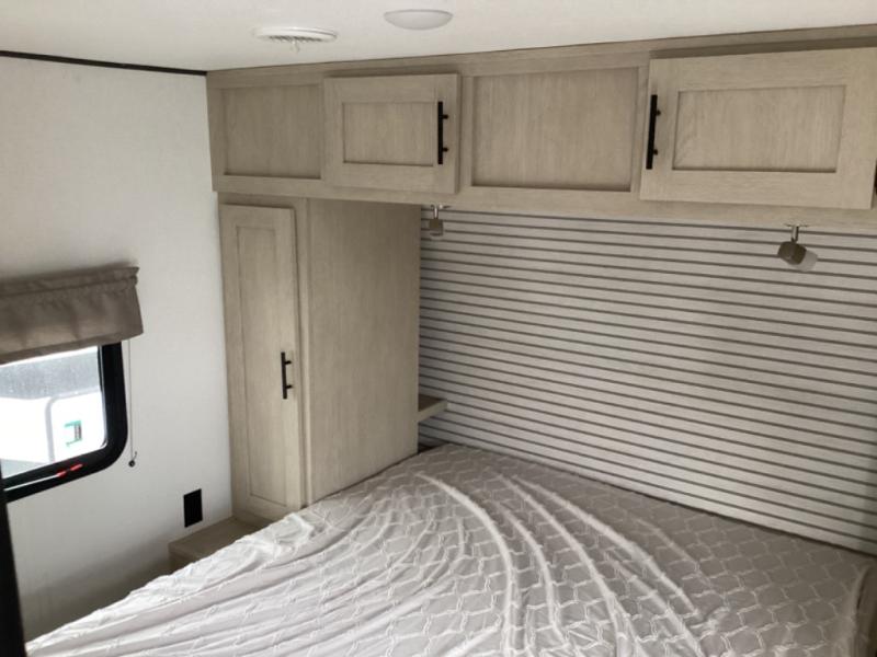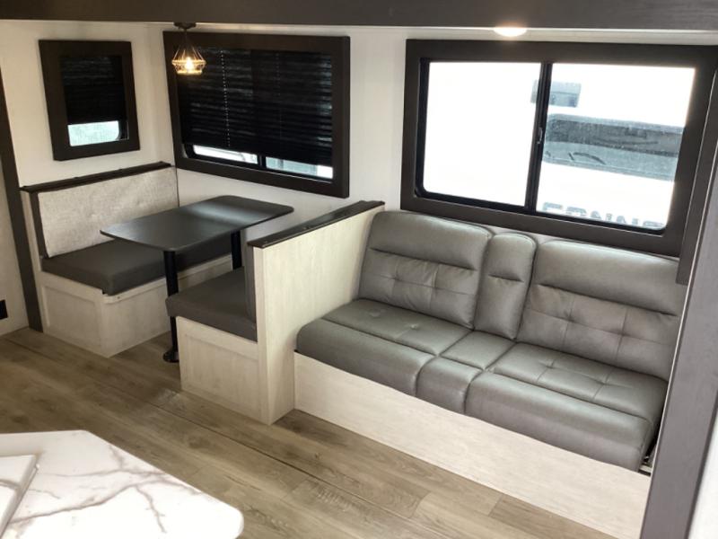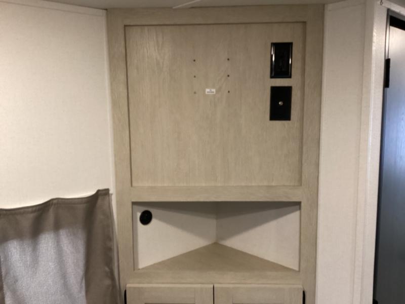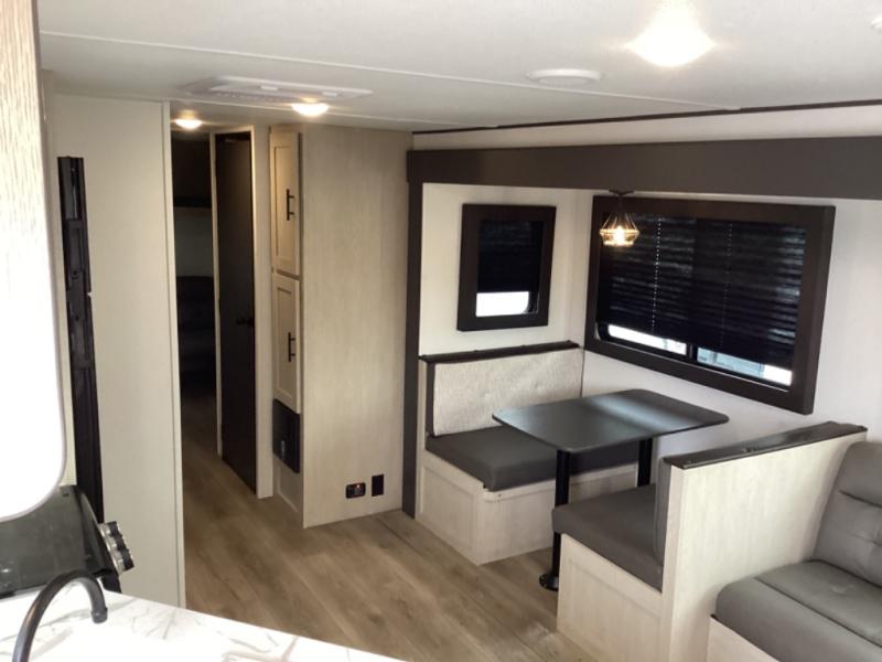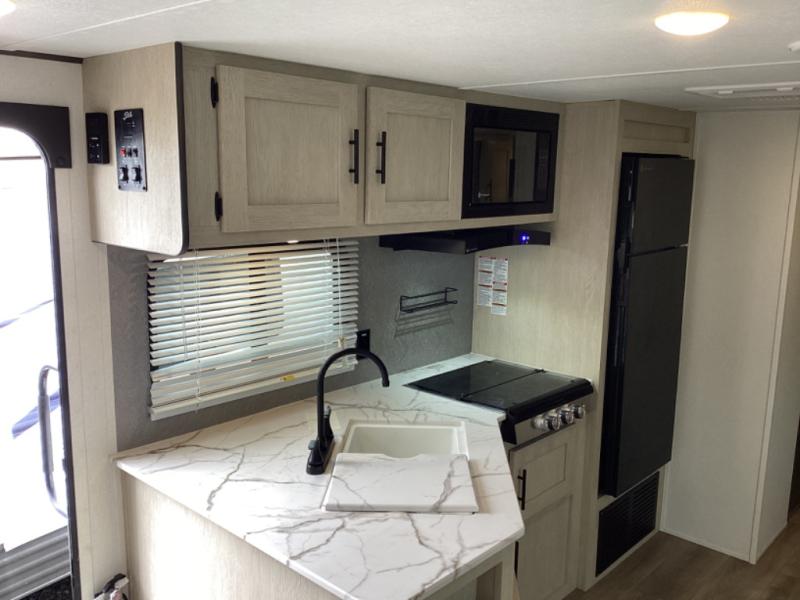 The little ones or your guests will love the bunkhouse in this spacious trailer. There area a set of 26" x 74" bunks, along with a flip-up bunk above a sofa they can sleep and relax. You'll find your own space in the front bedroom that includes a walk-around queen bed and dual wardrobes. Everyone can meet in the middle living area and kitchen to dine around the booth dinette or relax on the sofa. The chef will be able to create delicious meals each day on the three burner cooktop, and there is a residential style refrigerator for perishables. And the mid-coach full bath is sure to come in handy after a day of swimming or hiking!
