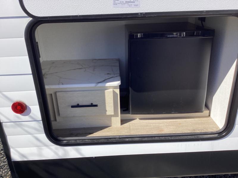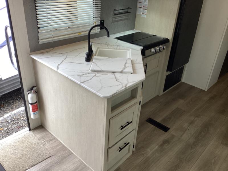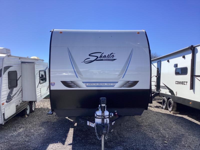In any Shasta i-5 Edition travel trailer, you will find quality craftsmanship along with an affordable price tag. These units each feature four stabilizer jacks to make setting up easier and an enclosed underbelly for added protection as you travel. The Base Camp Package provides each unit with black tank flush, a monitor panel for quick access to the functions of your unit, a 13.5K A/C unit, and a tankless water heater for added convenience. Inside, you'll find seamless countertops, sink covers, a portable Bluetooth speaker, and more comforts!