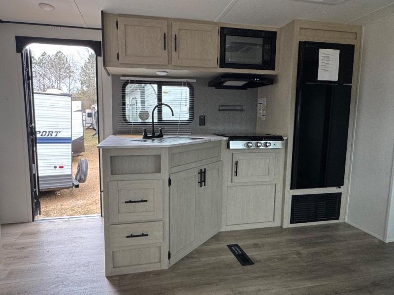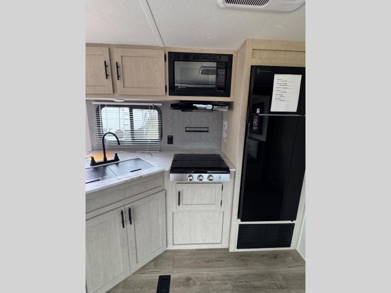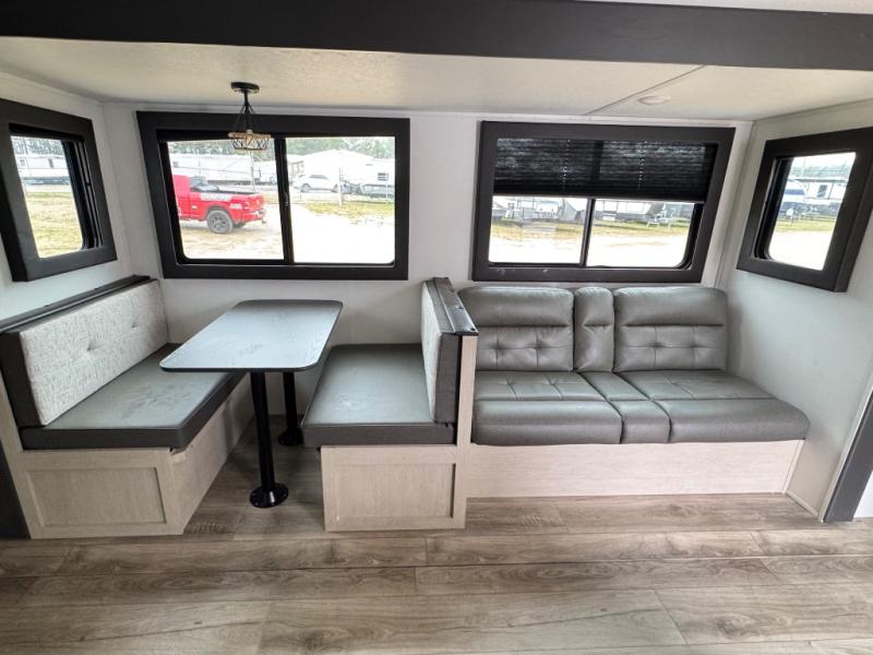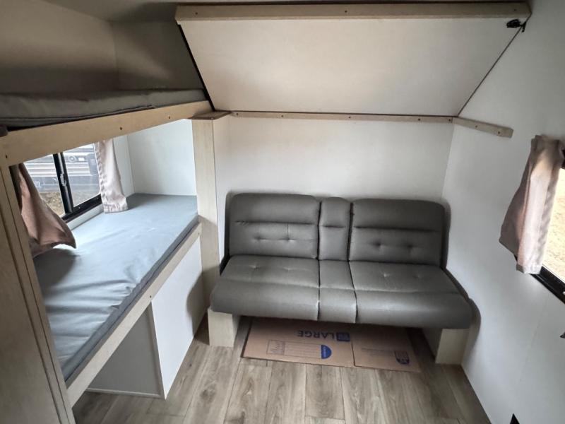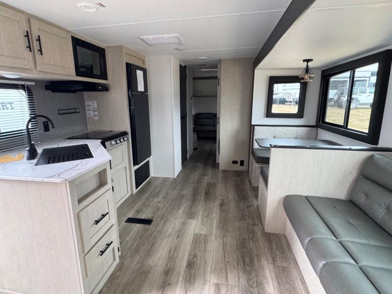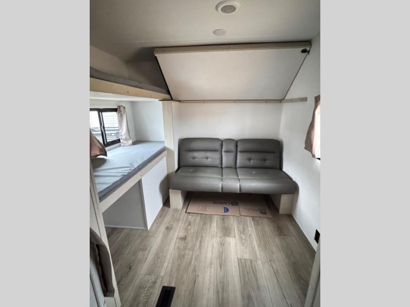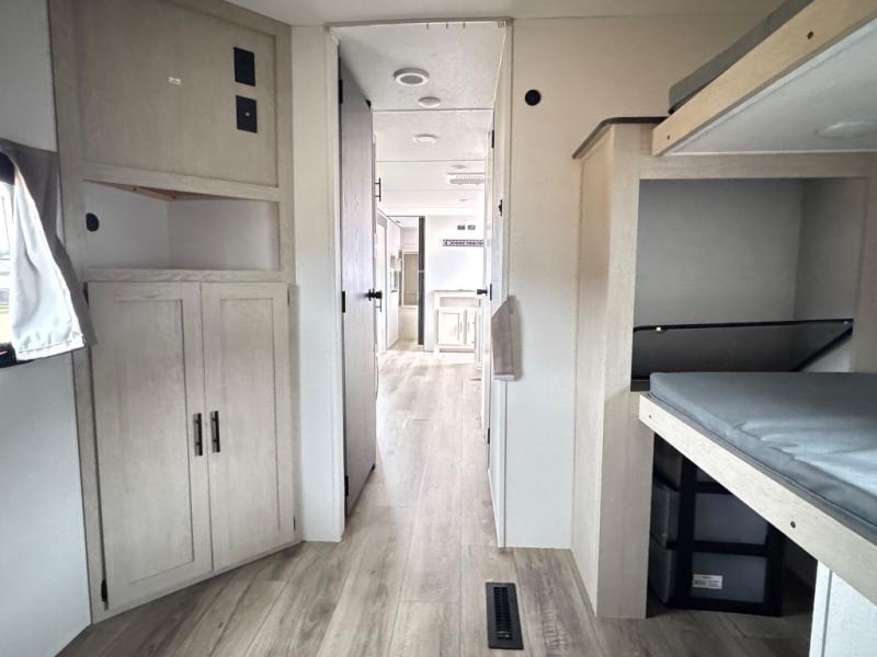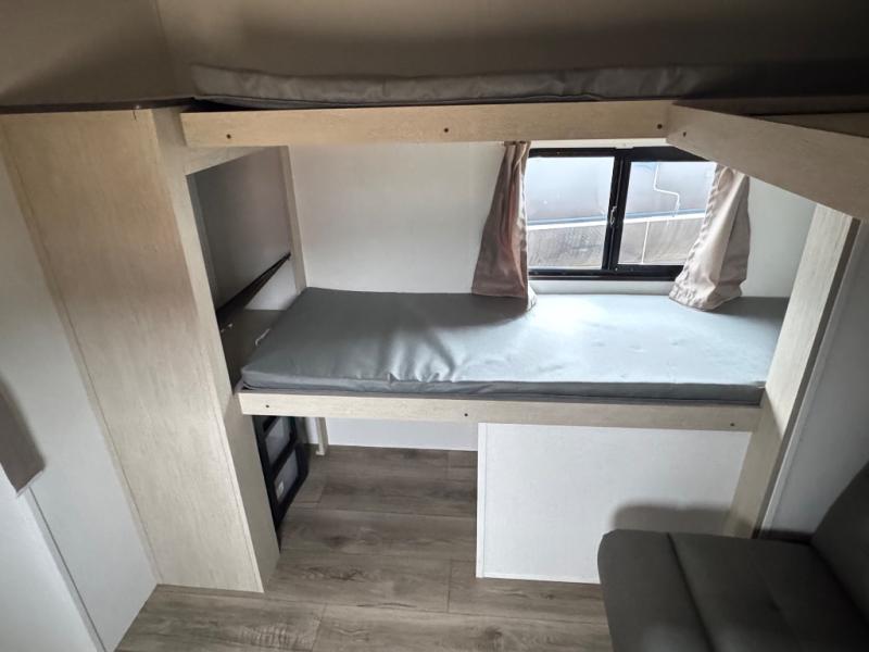 The little ones or your guests will love the bunkhouse in this spacious trailer. There area a set of 26" x 74" bunks, along with a flip-up bunk above a sofa they can sleep and relax. You'll find your own space in the front bedroom that includes a walk-around queen bed and dual wardrobes. Everyone can meet in the middle living area and kitchen to dine around the booth dinette or relax on the sofa. The chef will be able to create delicious meals each day on the three burner cooktop, and there is a residential style refrigerator for perishables. And the mid-coach full bath is sure to come in handy after a day of swimming or hiking!
