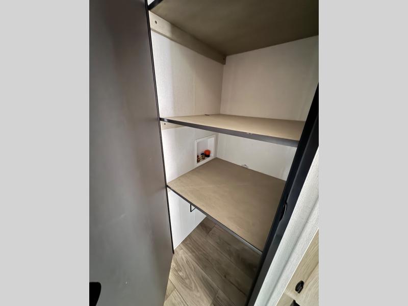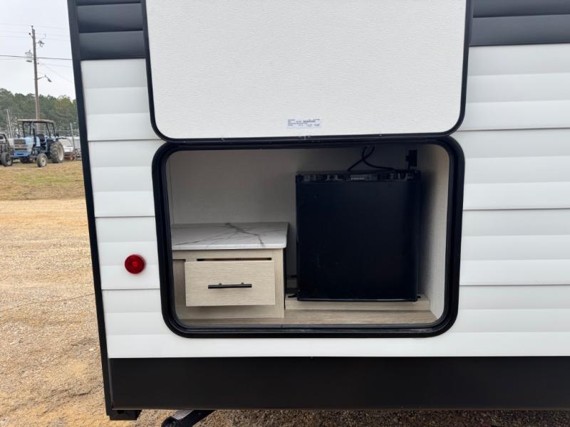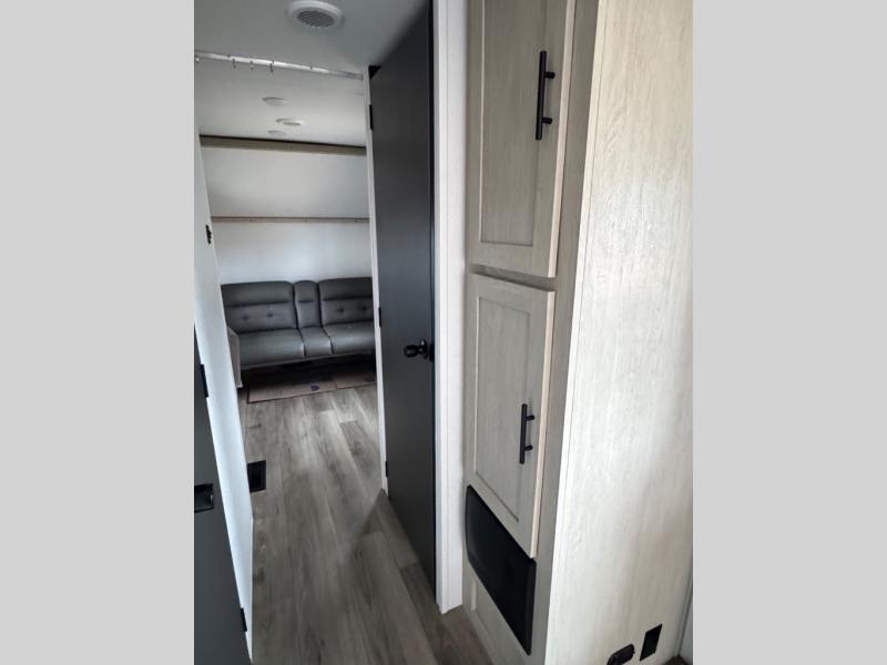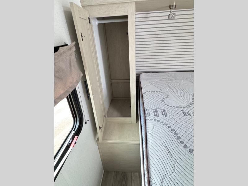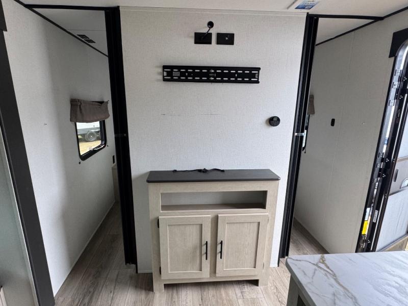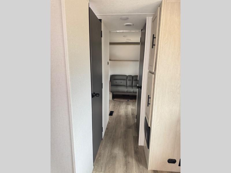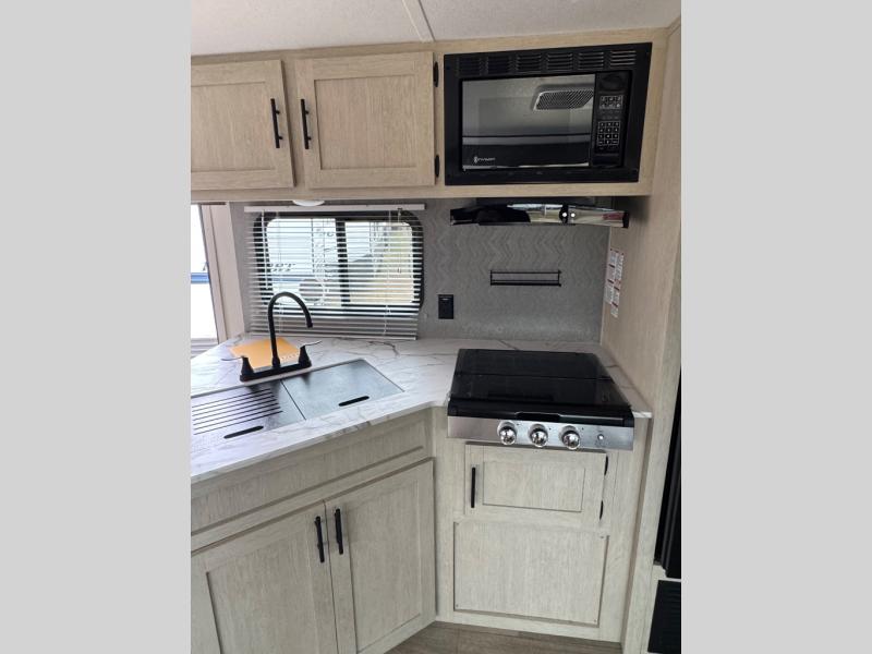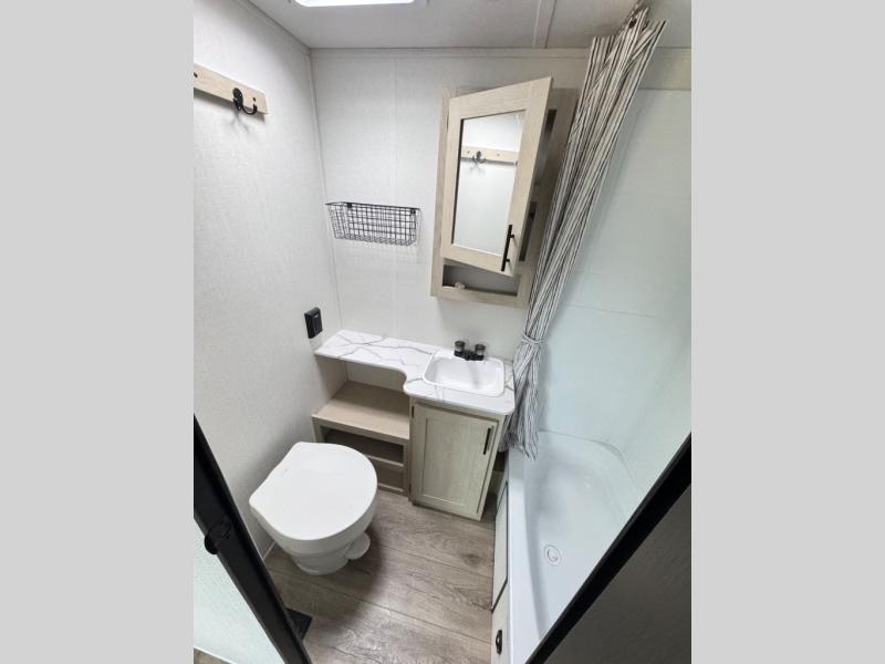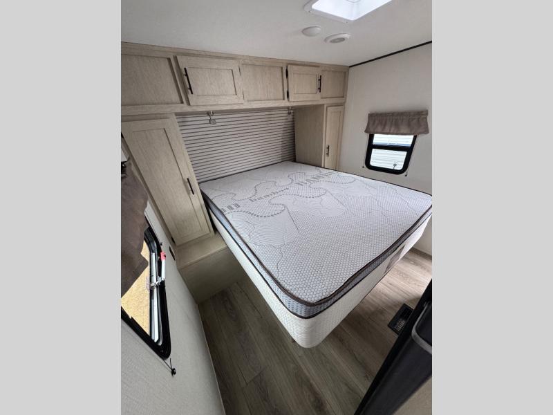 The little ones or your guests will love the bunkhouse in this spacious trailer. There area a set of 26" x 74" bunks, along with a flip-up bunk above a sofa they can sleep and relax. You'll find your own space in the front bedroom that includes a walk-around queen bed and dual wardrobes. Everyone can meet in the middle living area and kitchen to dine around the booth dinette or relax on the sofa. The chef will be able to create delicious meals each day on the three burner cooktop, and there is a residential style refrigerator for perishables. And the mid-coach full bath is sure to come in handy after a day of swimming or hiking!