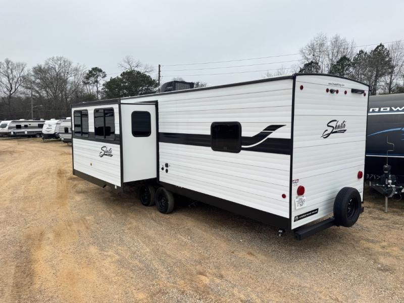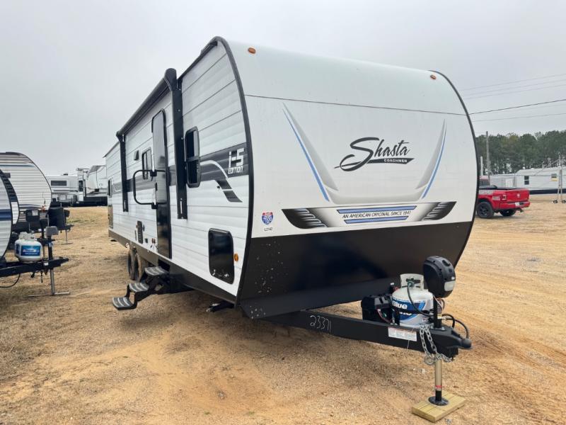 In any Shasta i-5 Edition travel trailer, you will find quality craftsmanship along with an affordable price tag. These units each feature four stabilizer jacks to make setting up easier and an enclosed underbelly for added protection as you travel. The Base Camp Package provides each unit with black tank flush, a monitor panel for quick access to the functions of your unit, a 13.5K A/C unit, and a tankless water heater for added convenience. Inside, you'll find seamless countertops, sink covers, a portable Bluetooth speaker, and more comforts!