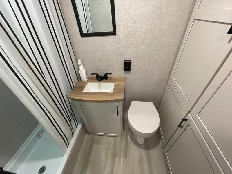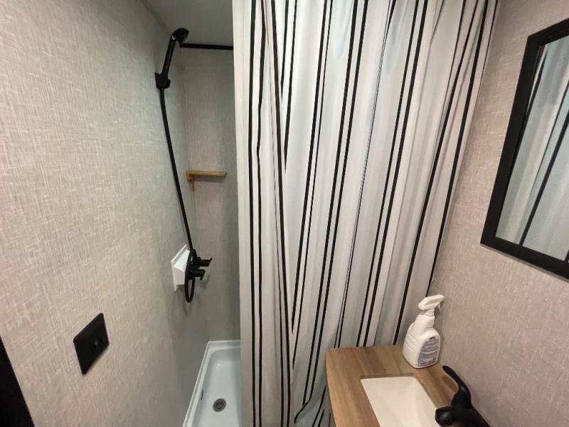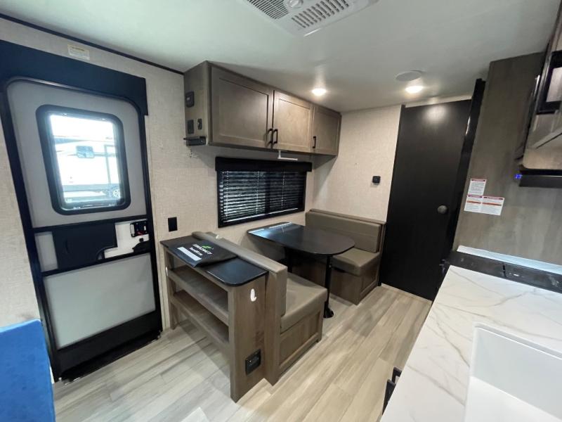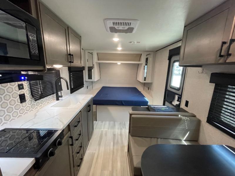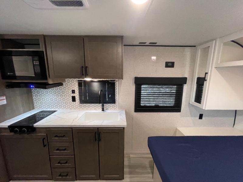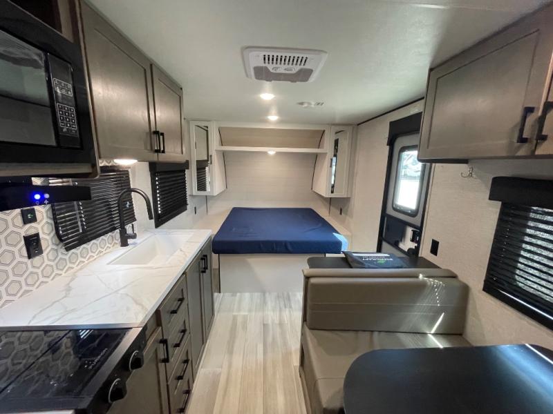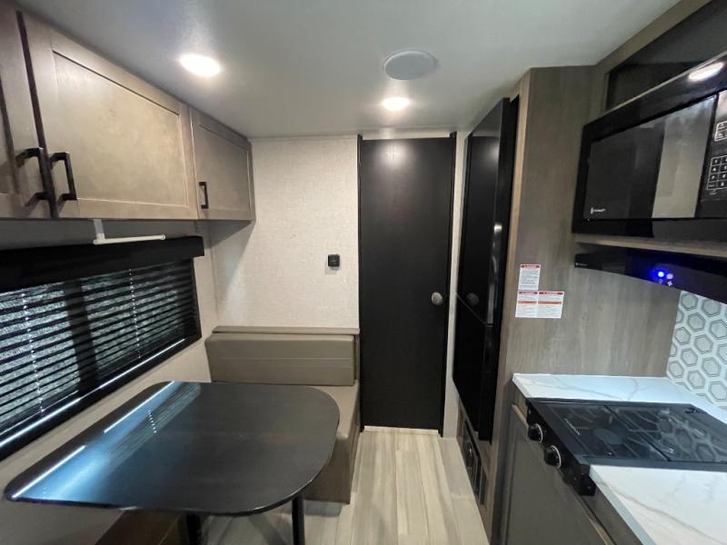 This cozy single axle travel trailer can sleep three people comfortably thanks to the front walk-around bed and the booth dinette. There is a full rear bath with a foot flush toilet, a powered bath vent, plus a bath wardrobe for clean towels and toiletries. The full kitchen is complete with a two burner cooktop, a microwave oven, and a refrigerator to keep your perishables fresh. Start camping today at your favorite campground!