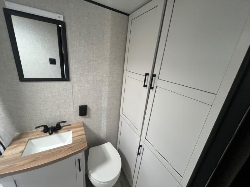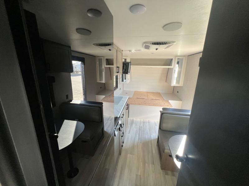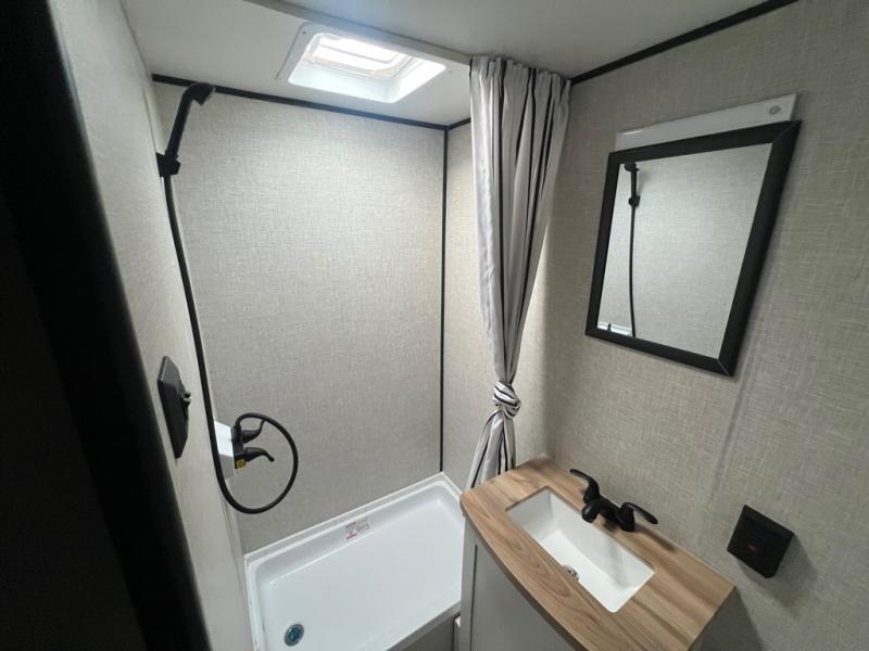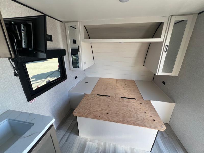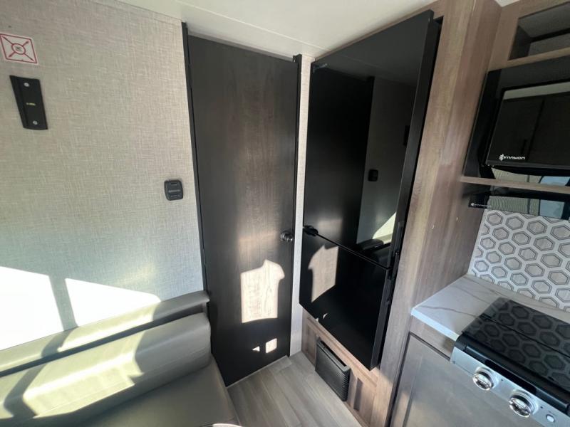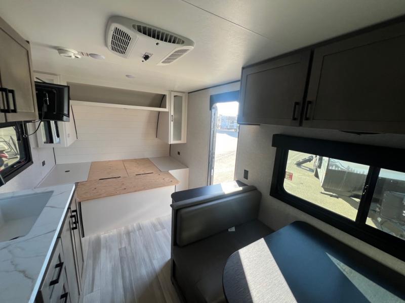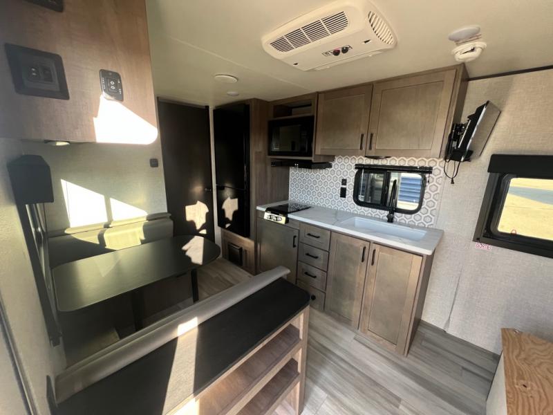 This cozy single axle travel trailer can sleep three people comfortably thanks to the front walk-around bed and the booth dinette. There is a full rear bath with a foot flush toilet, a powered bath vent, plus a bath wardrobe for clean towels and toiletries. The full kitchen is complete with a two burner cooktop, a microwave oven, and a refrigerator to keep your perishables fresh. Start camping today at your favorite campground!