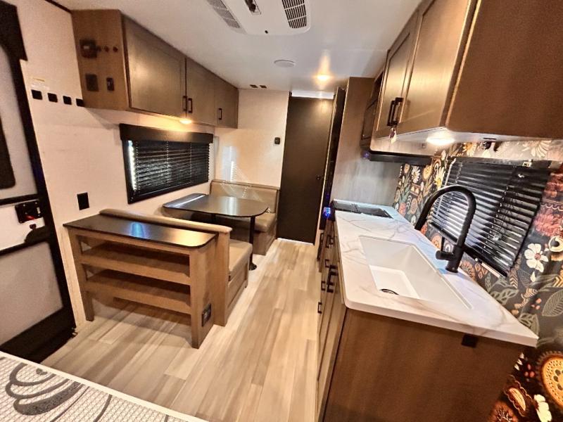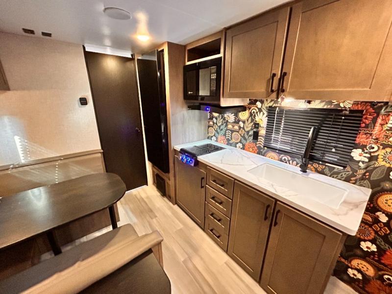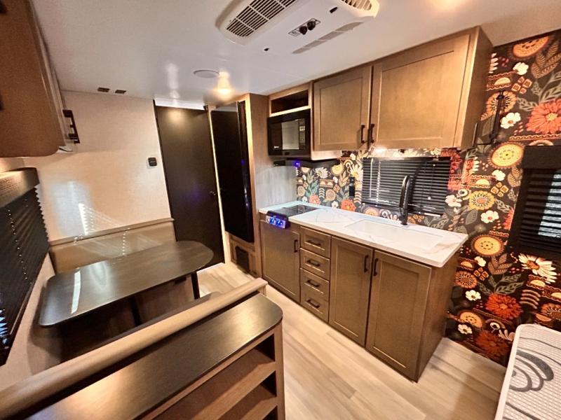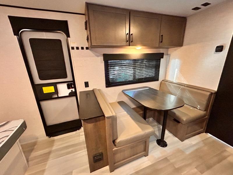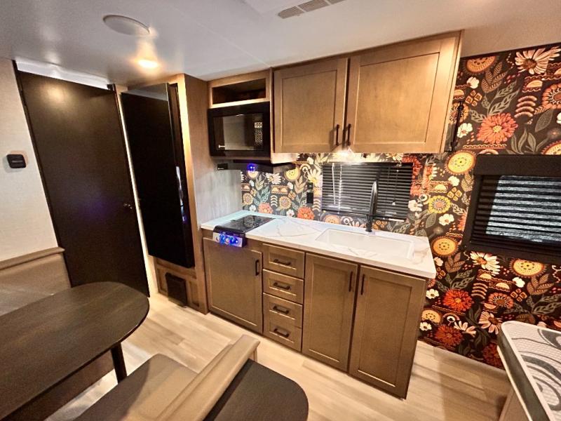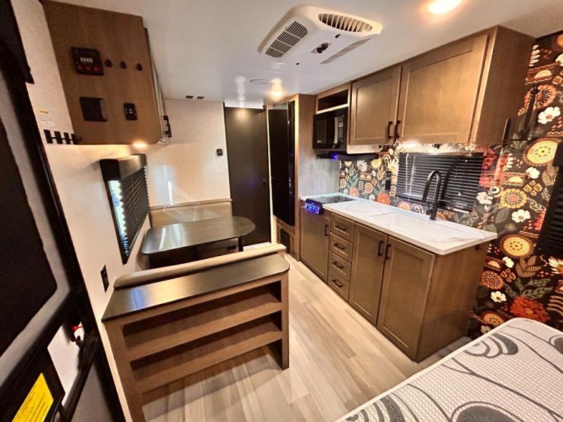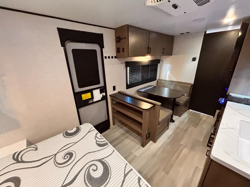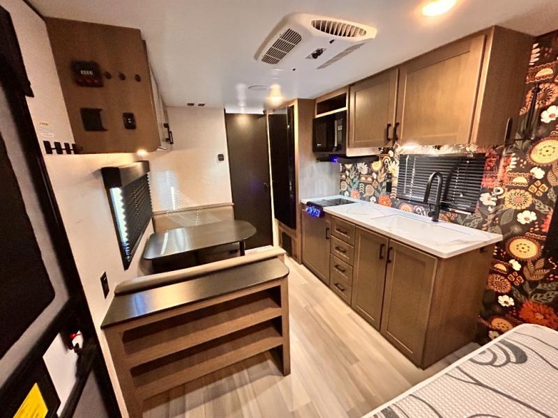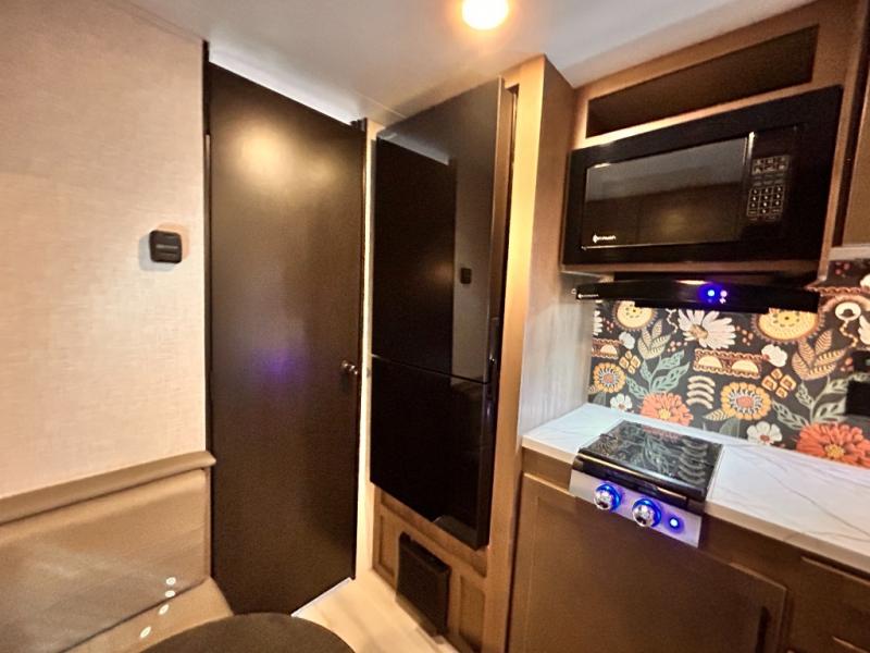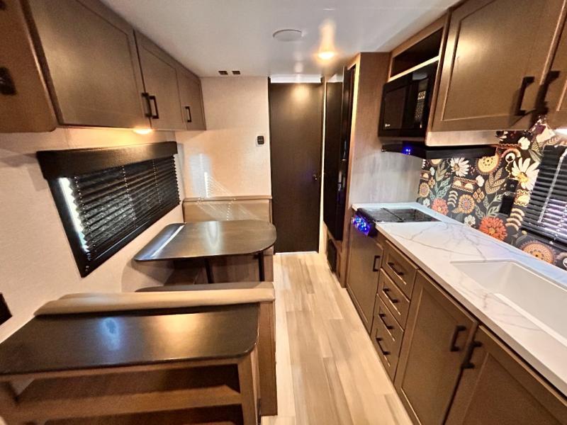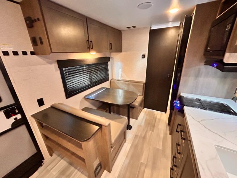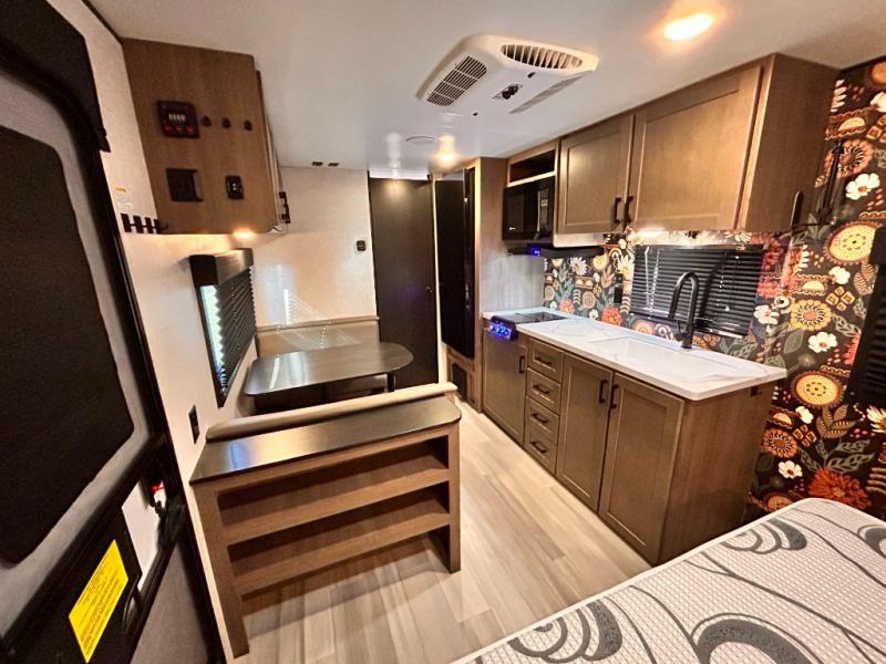 This cozy single axle travel trailer can sleep three people comfortably thanks to the front walk-around bed and the booth dinette. There is a full rear bath with a foot flush toilet, a powered bath vent, plus a bath wardrobe for clean towels and toiletries. The full kitchen is complete with a two burner cooktop, a microwave oven, and a refrigerator to keep your perishables fresh. Start camping today at your favorite campground!