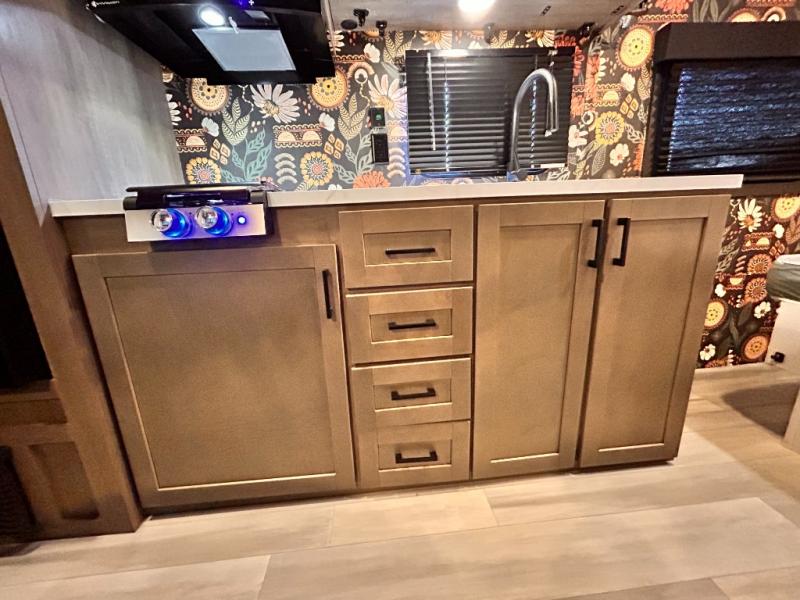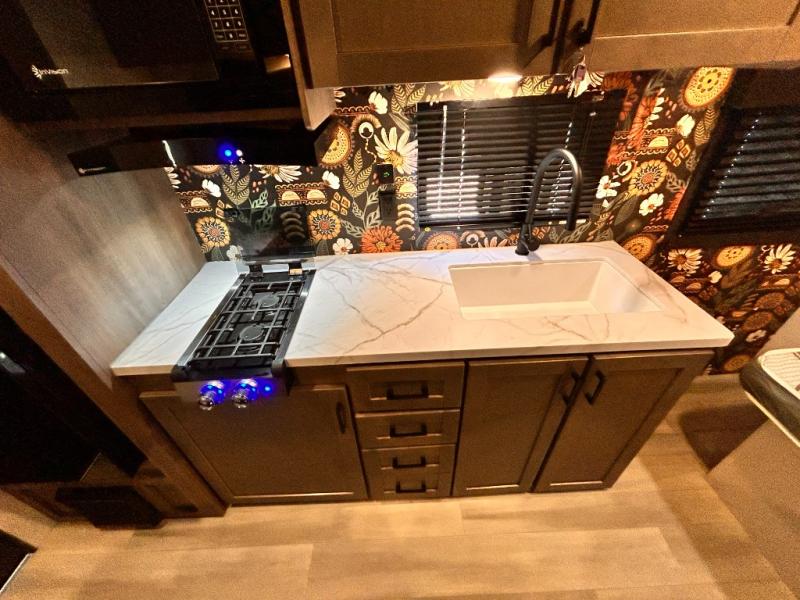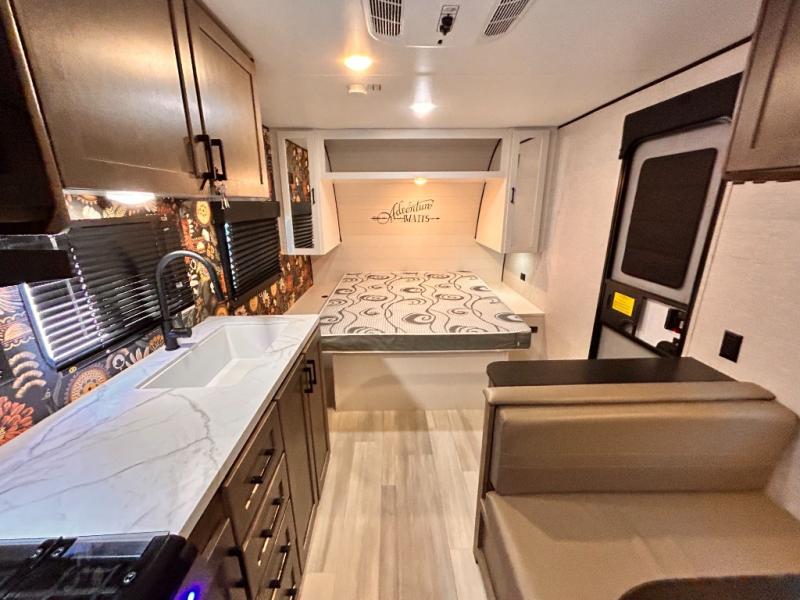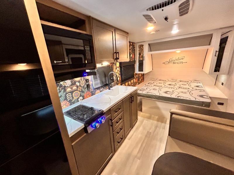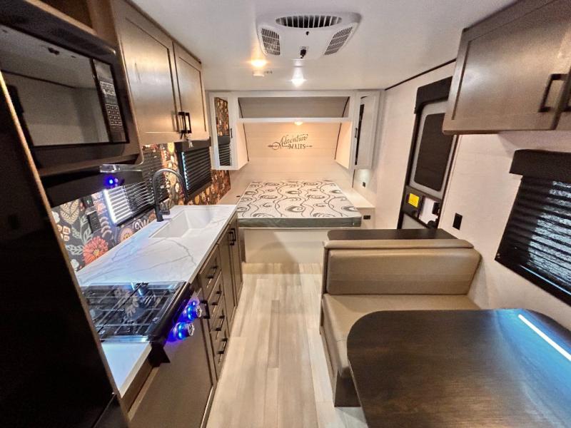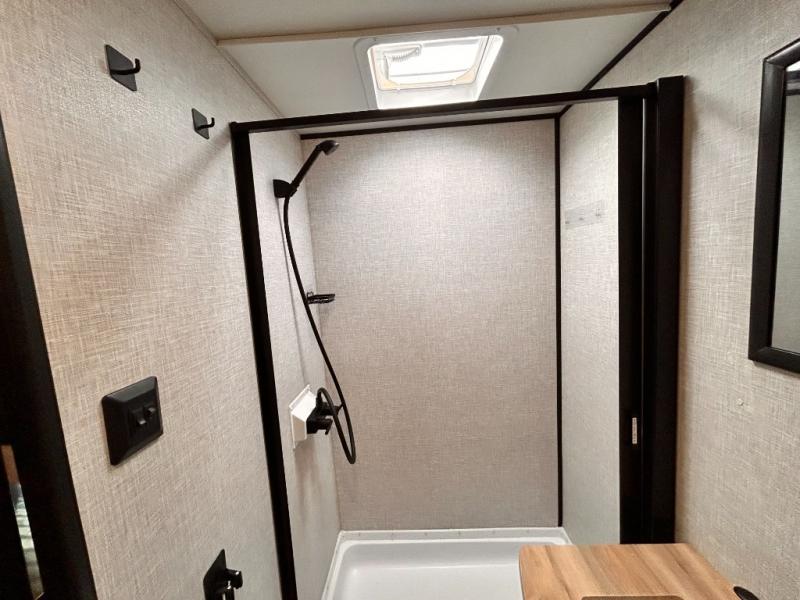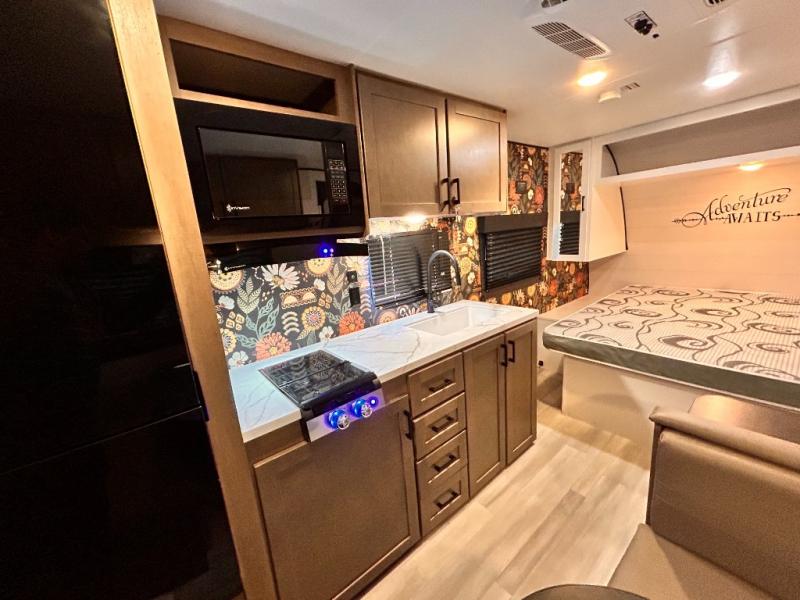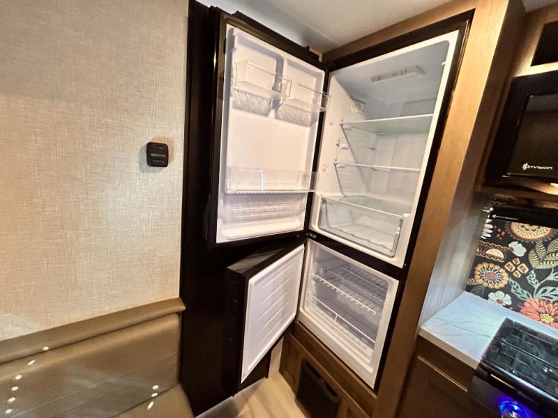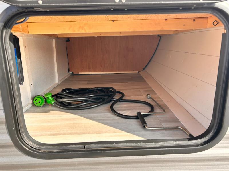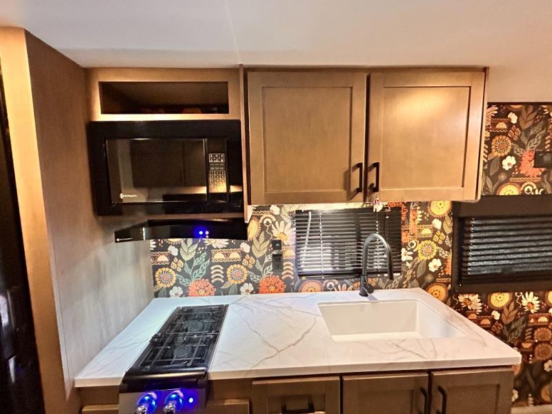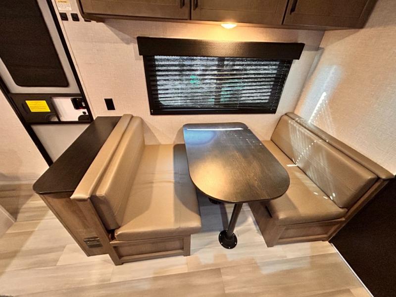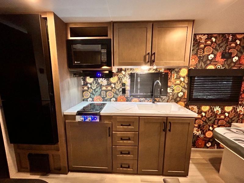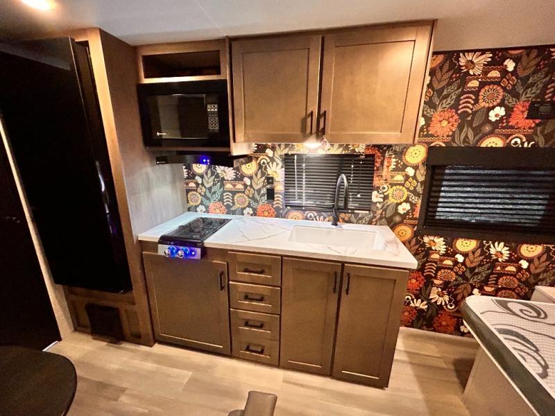This cozy single axle travel trailer can sleep three people comfortably thanks to the front walk-around bed and the booth dinette. There is a full rear bath with a foot flush toilet, a powered bath vent, plus a bath wardrobe for clean towels and toiletries. The full kitchen is complete with a two burner cooktop, a microwave oven, and a refrigerator to keep your perishables fresh. Start camping today at your favorite campground!