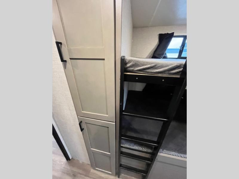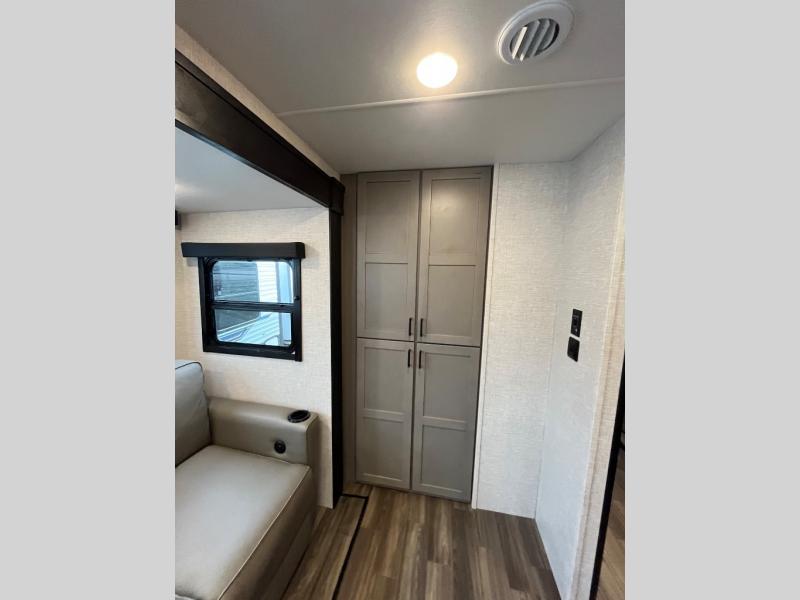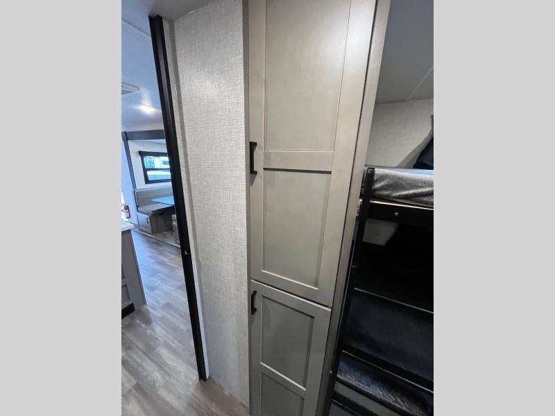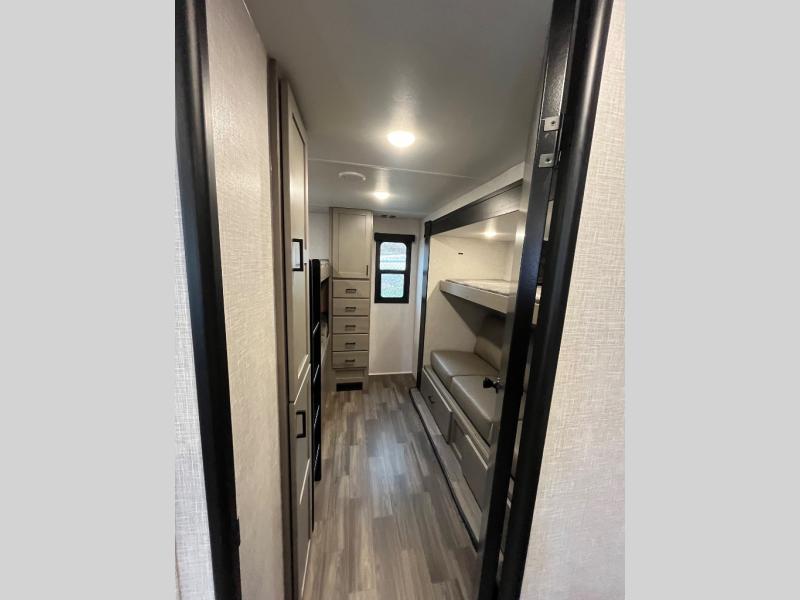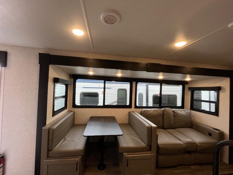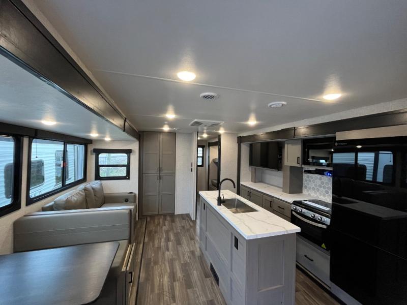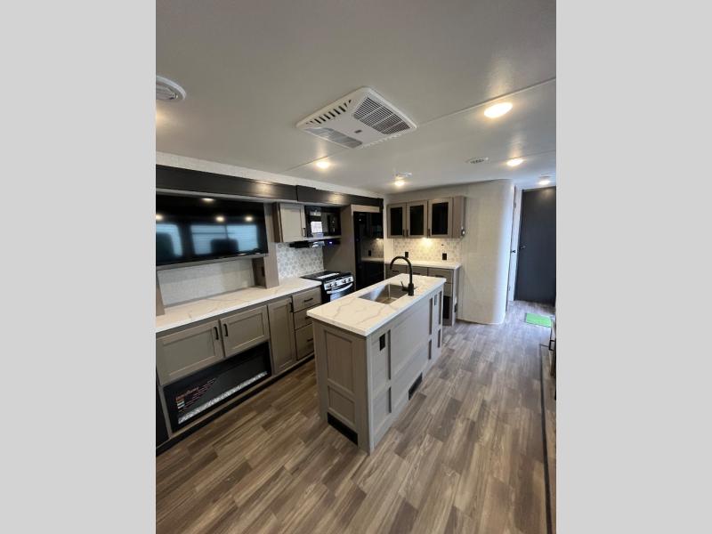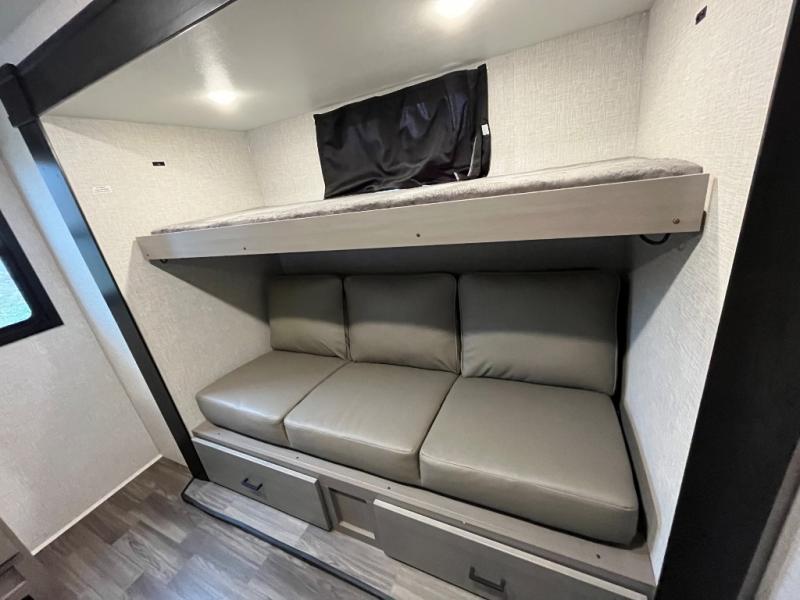 This travel trailer will have you feeling right at home! The rear private bunkhouse has plenty of space for the kiddos to move around, as well as a set of double-size bunks with a ladder and two wardrobes. There is also a slide with a flip-up bunk above a jackknife sofa for even more sleeping space. Everyone can gather together and either relax on the theater seating across from the entertainment center with a fireplace and Smart HDTV or play a game at the booth dinette. The kitchen island makes meal prepping easier and you can store your dishes in the hutch. You could even cook your meals while breathing in some fresh air with the outside kitchen which also has a refrigerator to keep your beverages cold. There's a full bathroom to stay clean and a closet in the front private bedroom with washer and dryer prep for the option to add these appliances.
