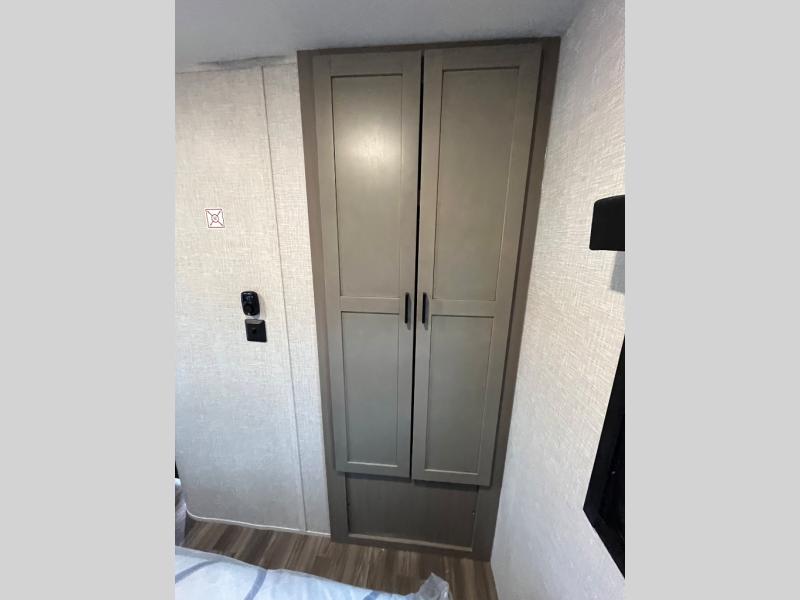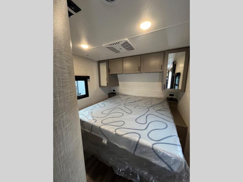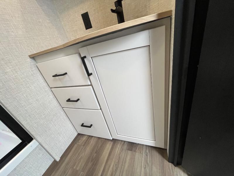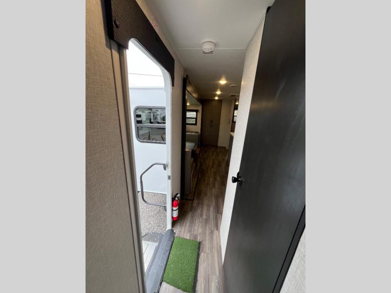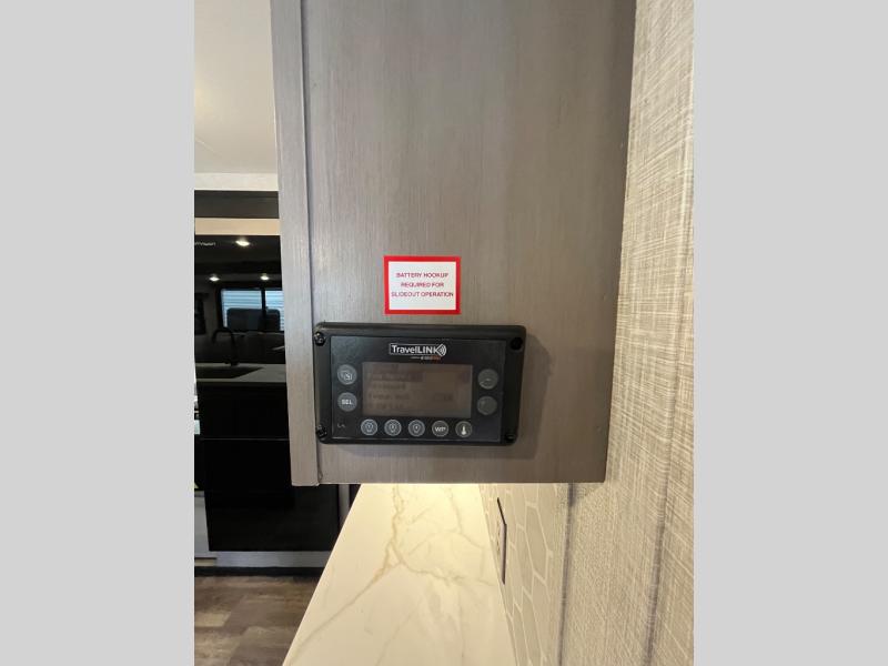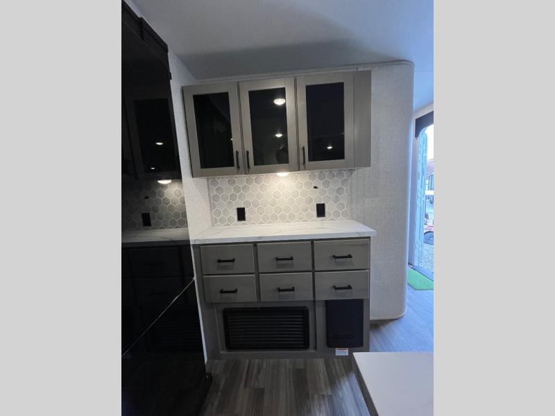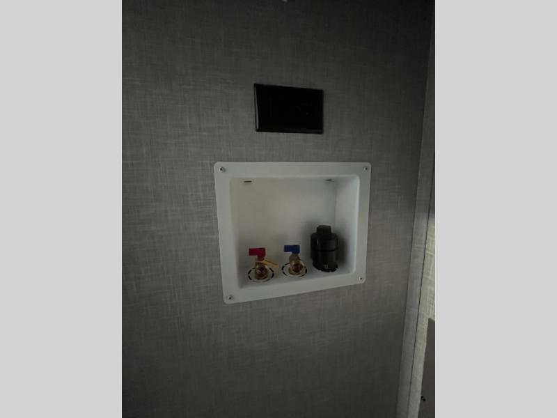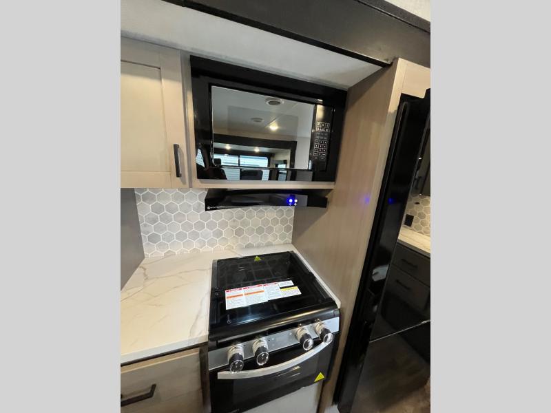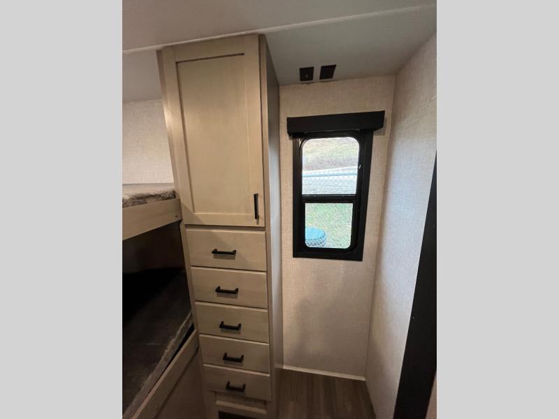 This travel trailer will have you feeling right at home! The rear private bunkhouse has plenty of space for the kiddos to move around, as well as a set of double-size bunks with a ladder and two wardrobes. There is also a slide with a flip-up bunk above a jackknife sofa for even more sleeping space. Everyone can gather together and either relax on the theater seating across from the entertainment center with a fireplace and Smart HDTV or play a game at the booth dinette. The kitchen island makes meal prepping easier and you can store your dishes in the hutch. You could even cook your meals while breathing in some fresh air with the outside kitchen which also has a refrigerator to keep your beverages cold. There's a full bathroom to stay clean and a closet in the front private bedroom with washer and dryer prep for the option to add these appliances.