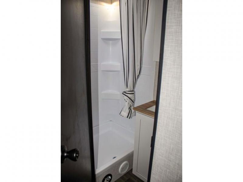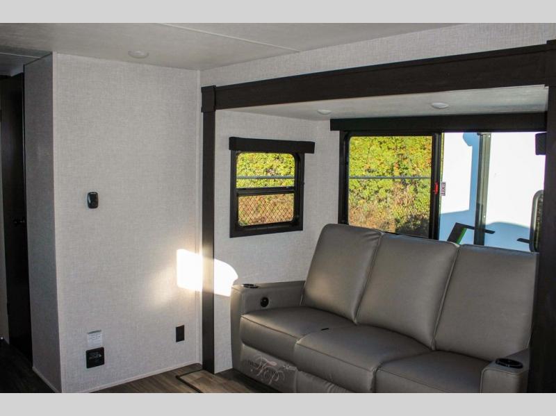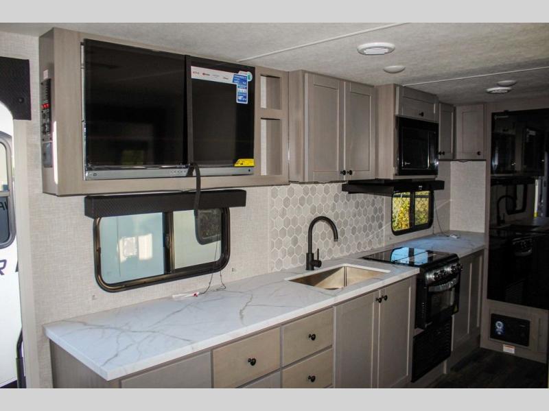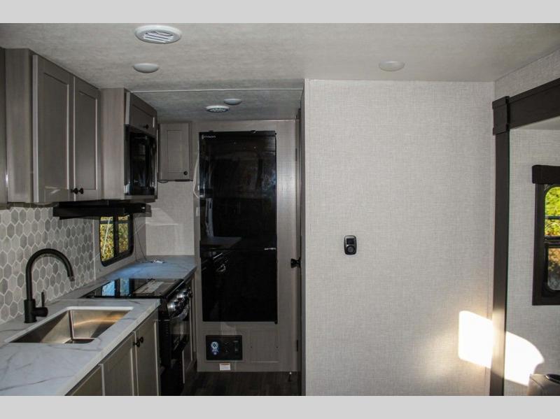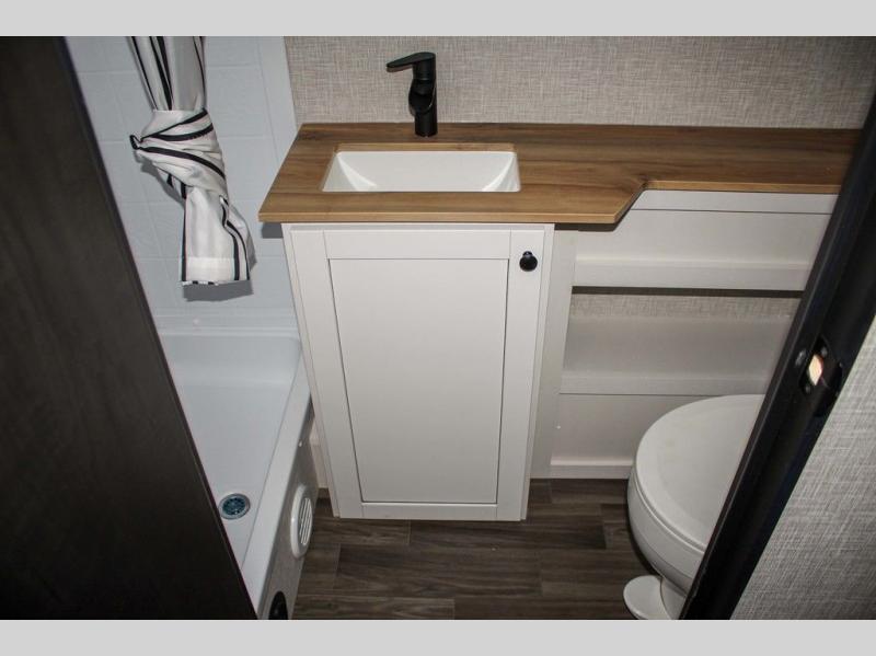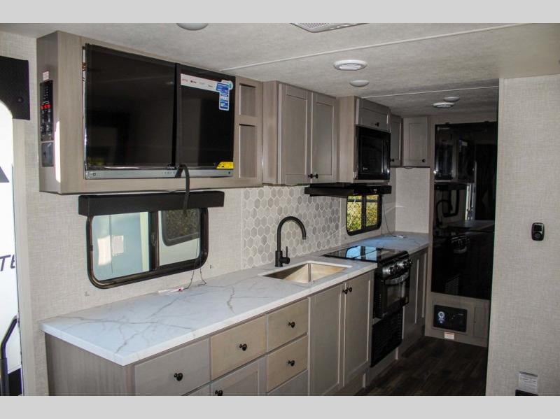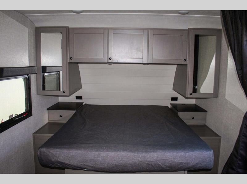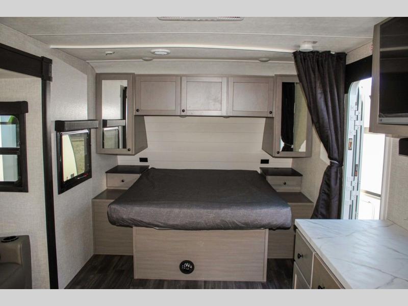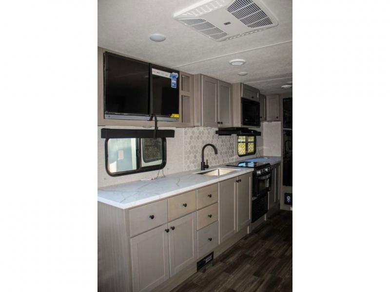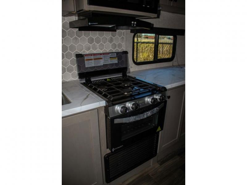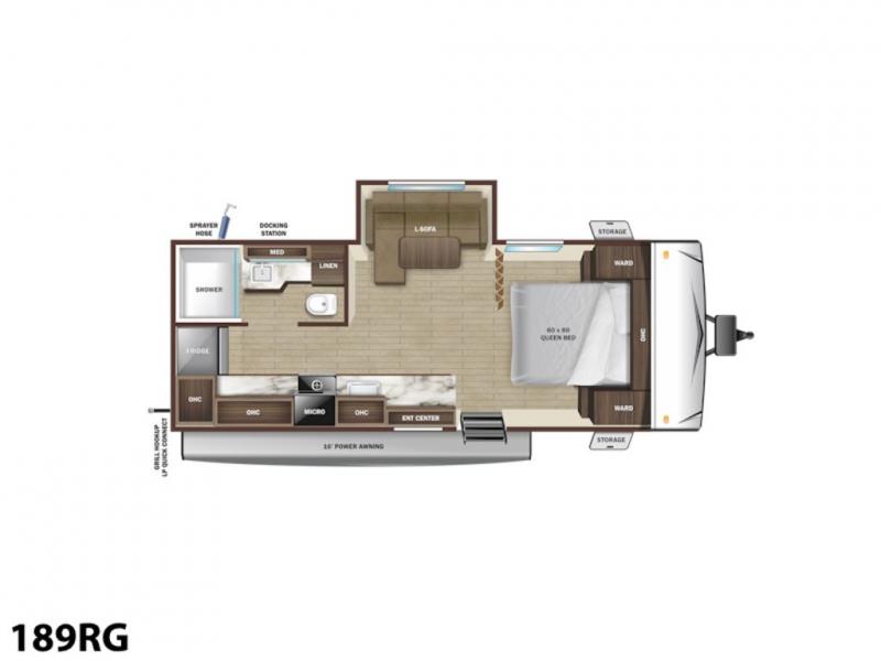 You and your spouse will enjoy camping in this travel trailer! The L-sofa slide out provides more space to stretch out and relax, and there is a table with it to enjoy your meals. This model includes a rear corner kitchen with plenty of counter space, a 10 cu. ft. 12V refrigerator, plus a three burner range with a 17" oven. Get a good night's rest each night on the front queen queen bed with wardrobes on either side and a privacy curtain to draw for added privacy. You will find a grill hookup LP quick connect outdoors plus an exterior docking station and a sprayer hose, and a pass-through storage for hiking and fishing gear!