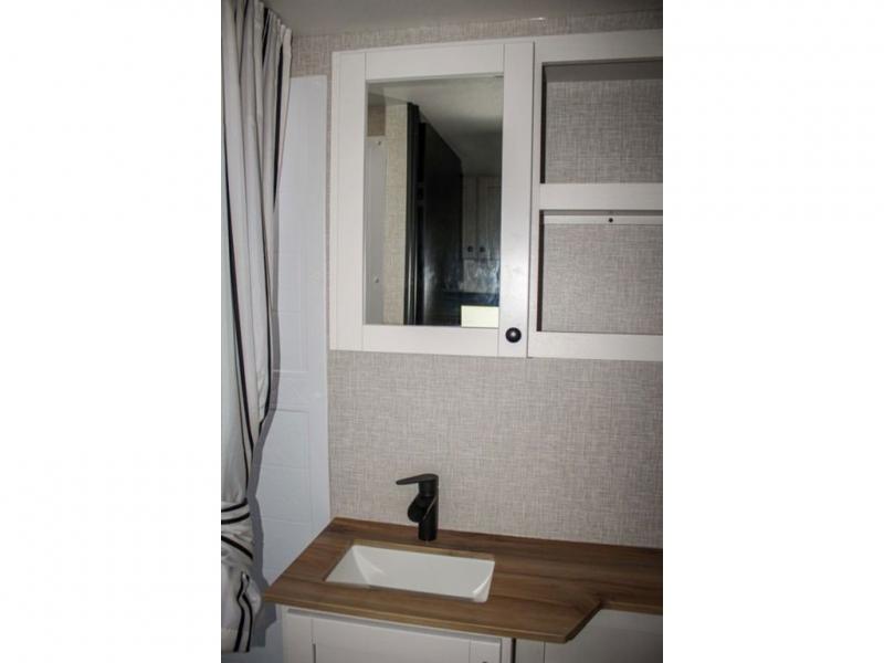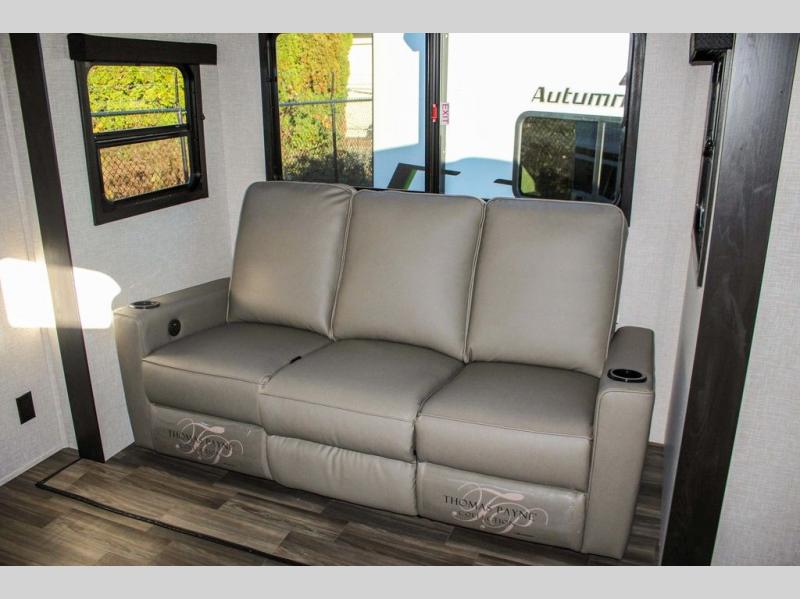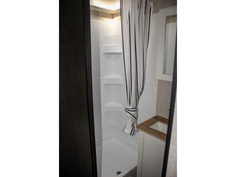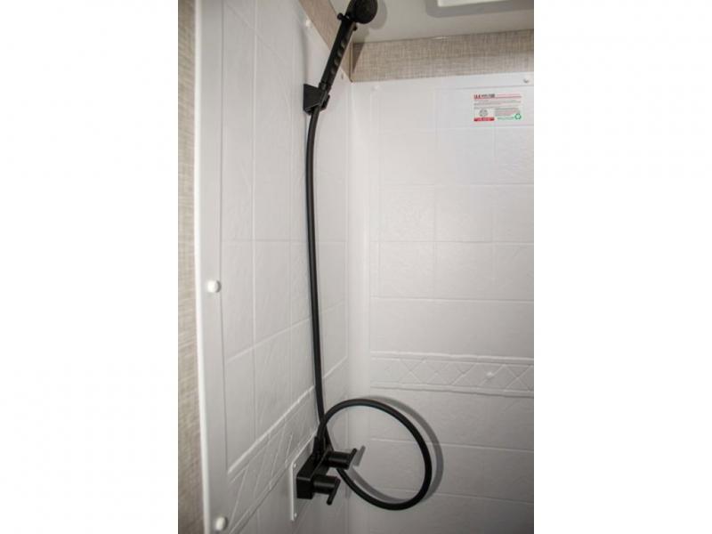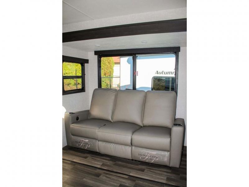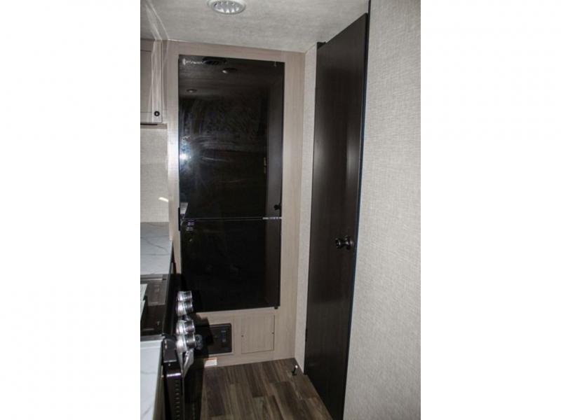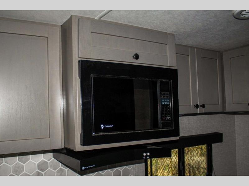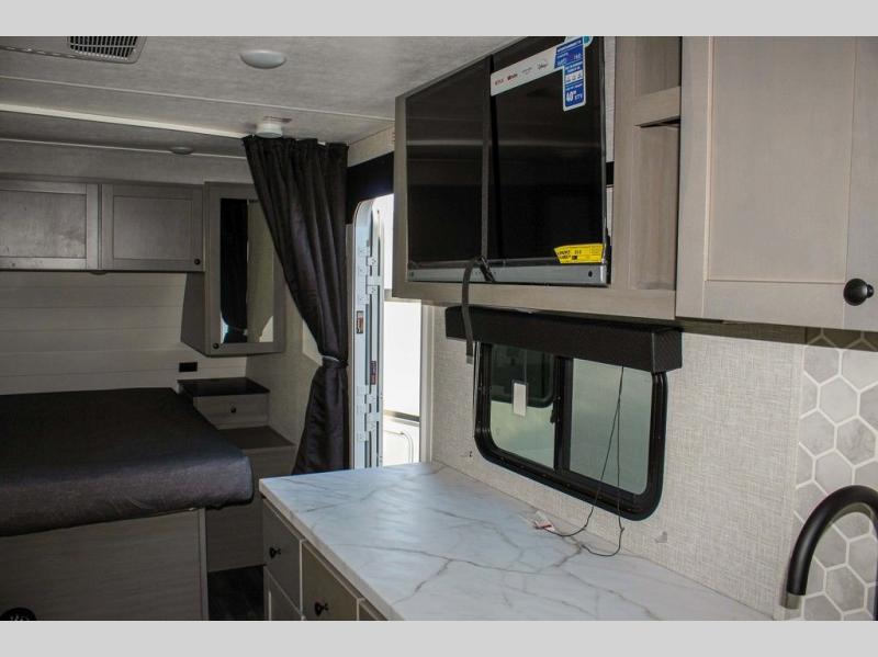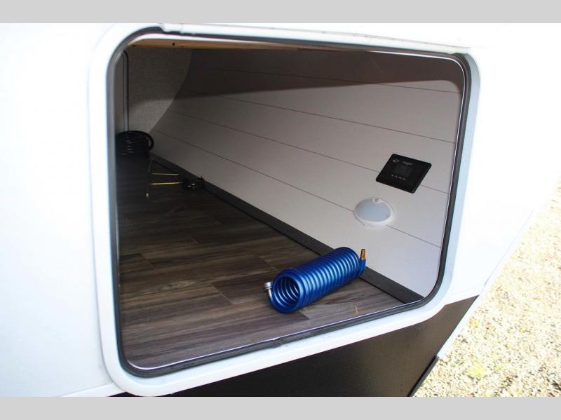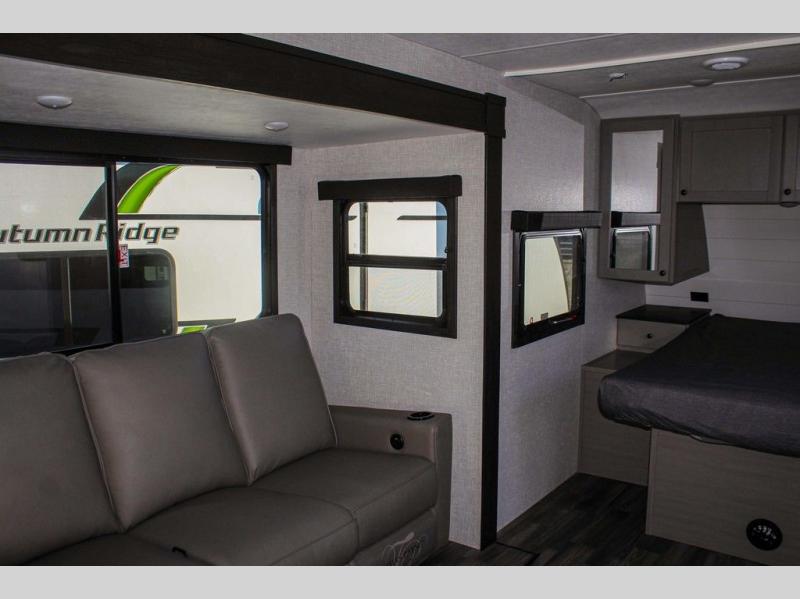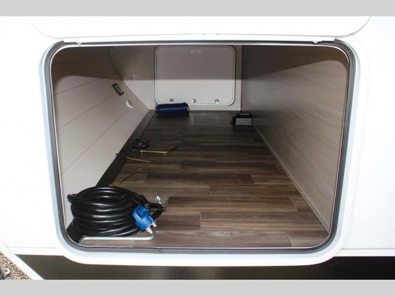 You and your spouse will enjoy camping in this travel trailer! The L-sofa slide out provides more space to stretch out and relax, and there is a table with it to enjoy your meals. This model includes a rear corner kitchen with plenty of counter space, a 10 cu. ft. 12V refrigerator, plus a three burner range with a 17" oven. Get a good night's rest each night on the front queen queen bed with wardrobes on either side and a privacy curtain to draw for added privacy. You will find a grill hookup LP quick connect outdoors plus an exterior docking station and a sprayer hose, and a pass-through storage for hiking and fishing gear!