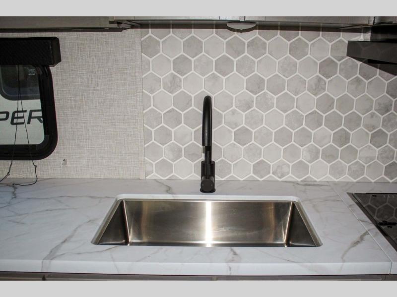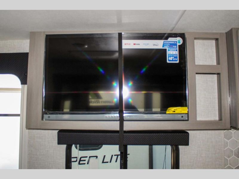 With any Starcraft Super Lite travel trailer, the solid and lightweight construction includes a fully walkable roof with a PVC roofing membrane that easily reflects solar heat and UV rays and TuffShell vacuum bonded laminated construction, reinforced with heavy-duty fiberglass and welded aluminum frames. There is also a molded front cap with LED lighting to protect against elements, a power tongue jack for easy towing, plus a power awning with LED lighting. The interior is spacious with an 81" living room ceiling height, hardwood cabinet doors, and flush floor slides with residential vinyl flooring and pressed membrane countertops for easy cleanup. Don't wait for your next adventure, take a Super Lite with you today!