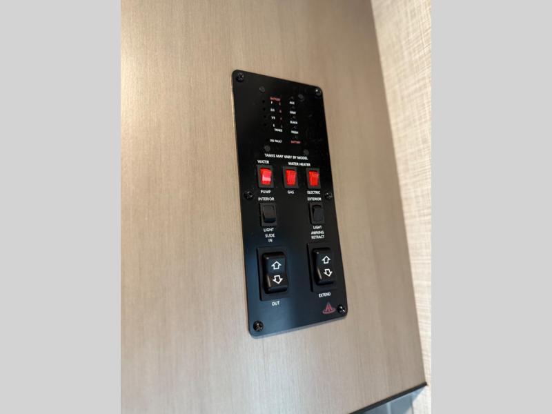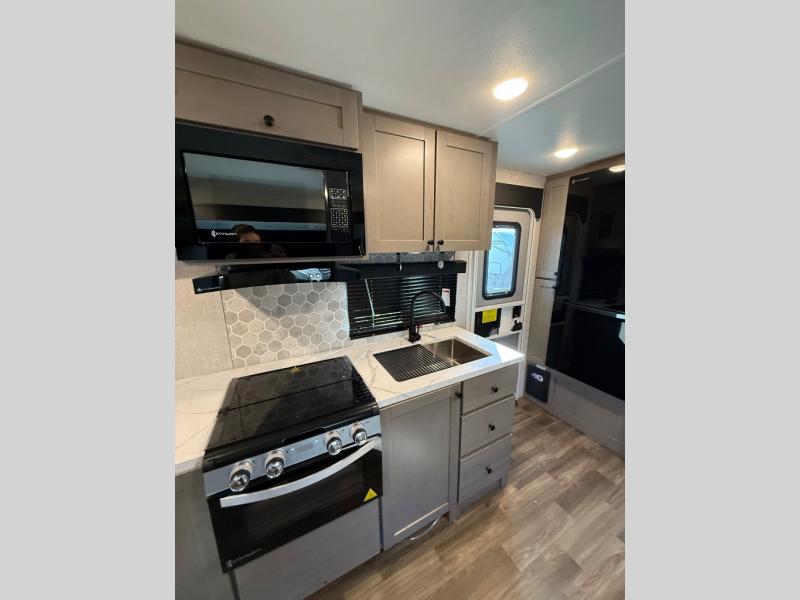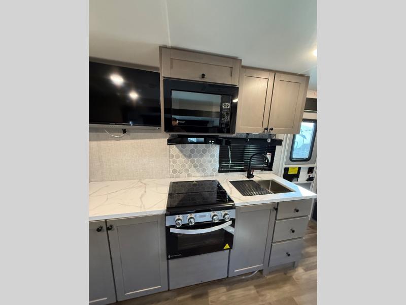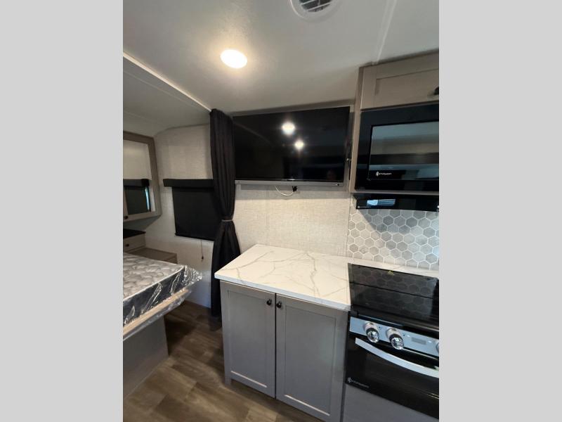 Get ready for some fun and relaxation with this trailer setup at your favorite campground! After enjoying the outdoors and everything it has to offer, you can whip up a meal in the galley kitchen with full amenities and clean the dishes with a single basin stainless steel under-mount kitchen sink with a residential high-rise faucet. The smart HDTV will provide inside entertainment as you relax on the L-shaped sofa with a table to dine at, and this space doubles as a sleeping area at night. The front bedroom offers a privacy curtain, a queen bed, dual wardrobes, and electric outlets and USB ports. And everyone can take turns getting cleaned up in the rear corner bathroom which offers linen storage after hanging out under the 12' power awning.
