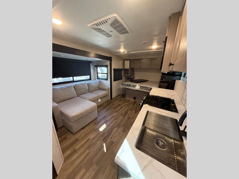 With any Starcraft Super Lite travel trailer, the solid and lightweight construction includes a fully walkable roof with a PVC roofing membrane that easily reflects solar heat and UV rays and TuffShell vacuum bonded laminated construction, reinforced with heavy-duty fiberglass and welded aluminum frames. There is also a molded front cap with LED lighting to protect against elements, a power tongue jack for easy towing, plus a power awning with LED lighting. The interior is spacious with an 81" living room ceiling height, hardwood cabinet doors, and flush floor slides with residential vinyl flooring and pressed membrane countertops for easy cleanup. Don't wait for your next adventure, take a Super Lite with you today!