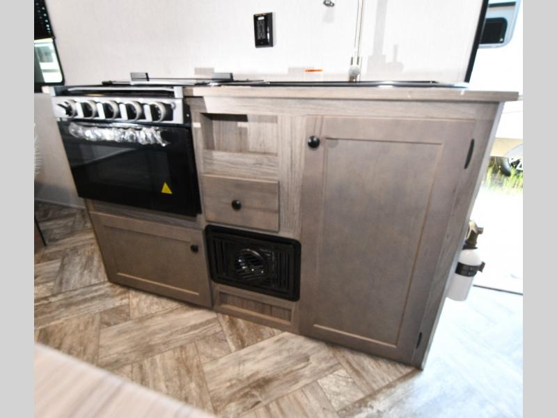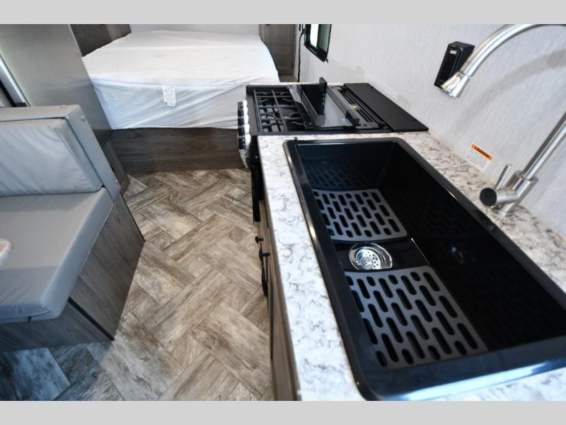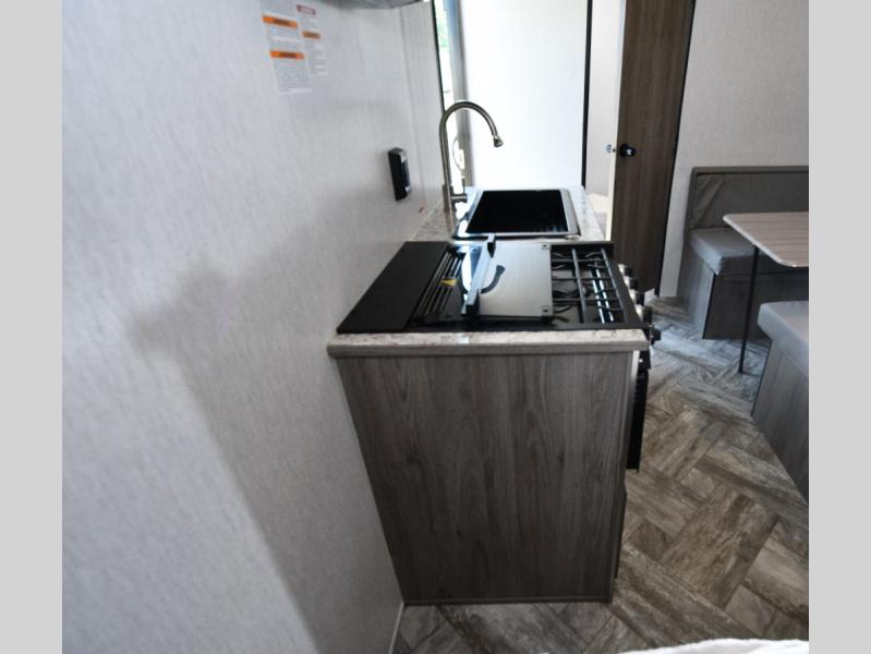 Kitchen with two-burner stove, double sink, and 4.3 cu. ft. 12V refrigerator