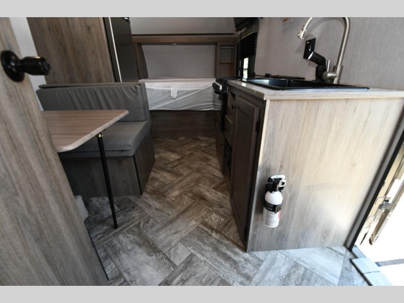 The kitchen is compact yet capable, featuring a two-burner stove, 4.3 cu. ft. 12V refrigerator, double sink, and plenty of storage for your essentials. With LED lighting, USB ports, and cable/satellite hookups, staying connected and comfortable is easy. Outside, the power awning extends at the touch of a button, providing shade and outdoor living space. Durable construction features include wood-framed sidewalls, aluminum siding, and a fully walkable roof deck — proof that this Sun Lite LTD is built to last.