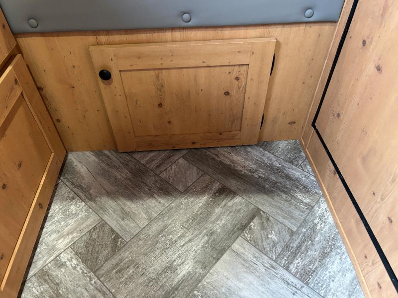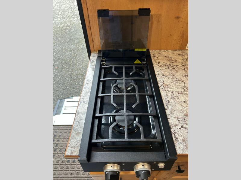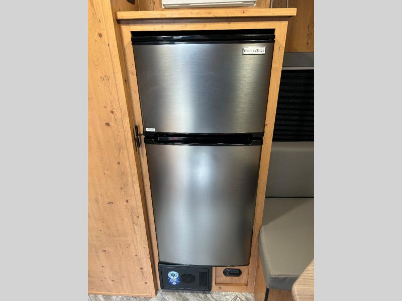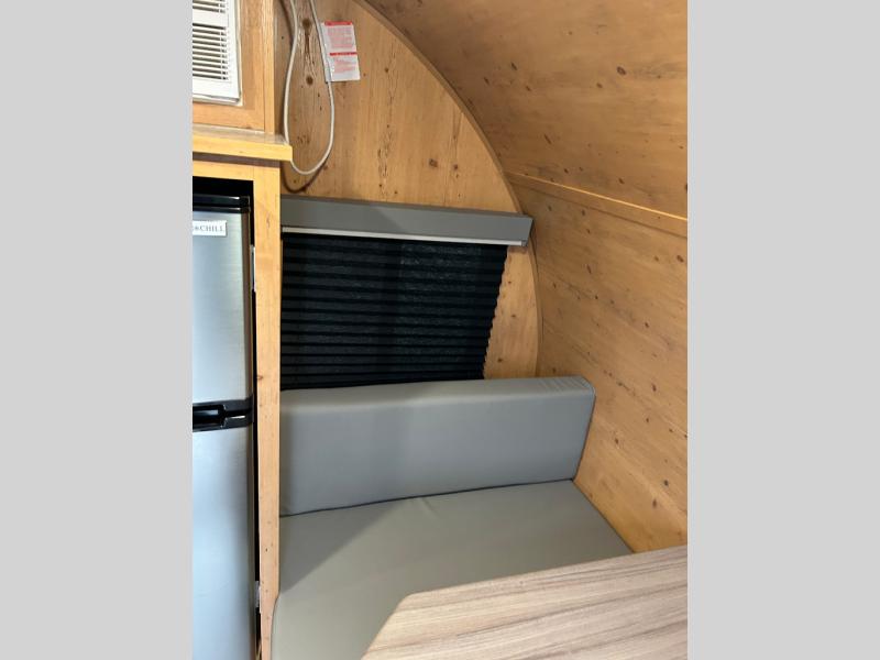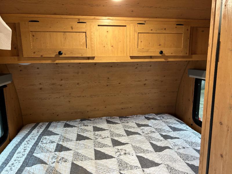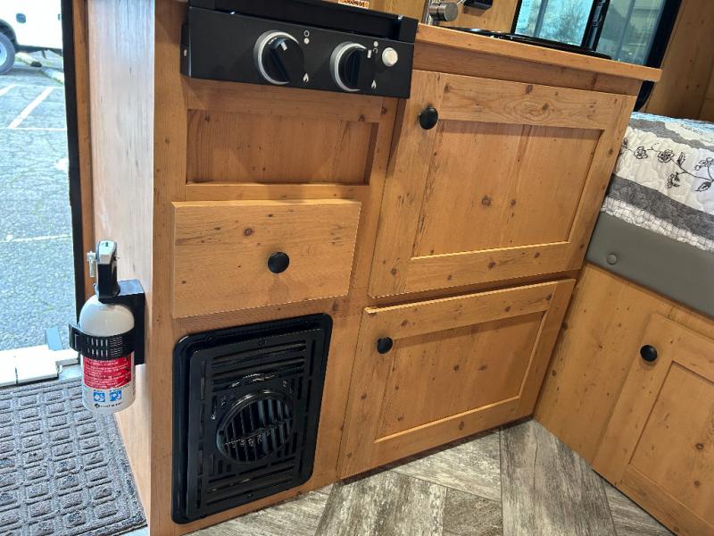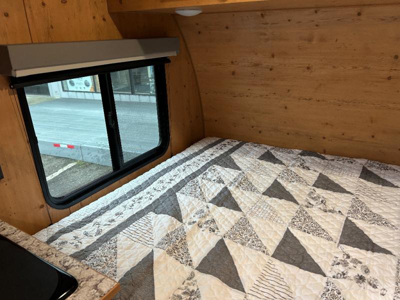 This Sunray travel trailer is the largest and most accommodating because it comes with a wet bath so that you can even take a shower in your trailer! There is a small kitchen on the interior that comes with a two-burner stove top, a refrigerator, and a microwave so that you can cook dinner without having to start a fire, and since it is indoors, you will be able to keep the bugs away while you prepare something delicious to eat. If you need to rinse off some gear, the outside shower will be especially useful, and if you need to charge your devices, use the USB ports. You will also find a Winegard HDTV antenna on this model. Add the available Classic option for 14" tires instead of the off-road version, color matching rims with Moon Caps, and Retro decor and Diner-Style countertops.