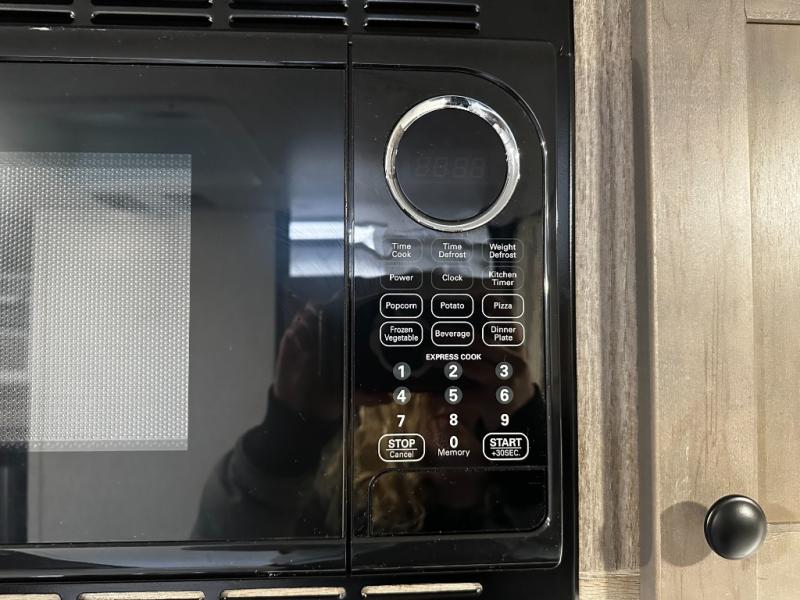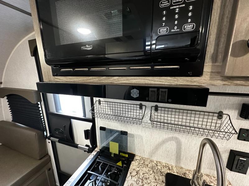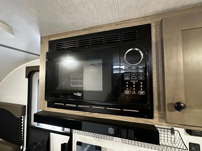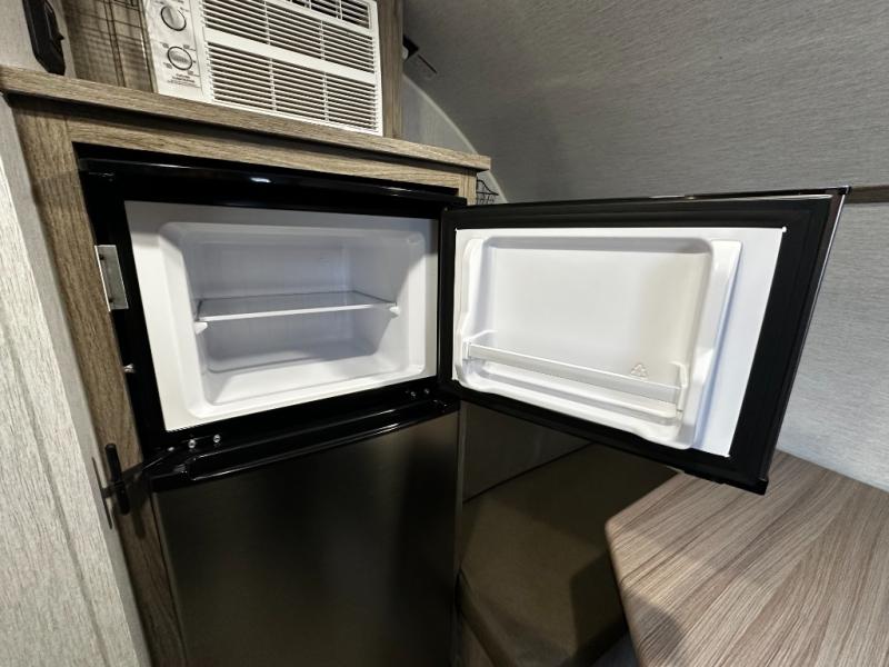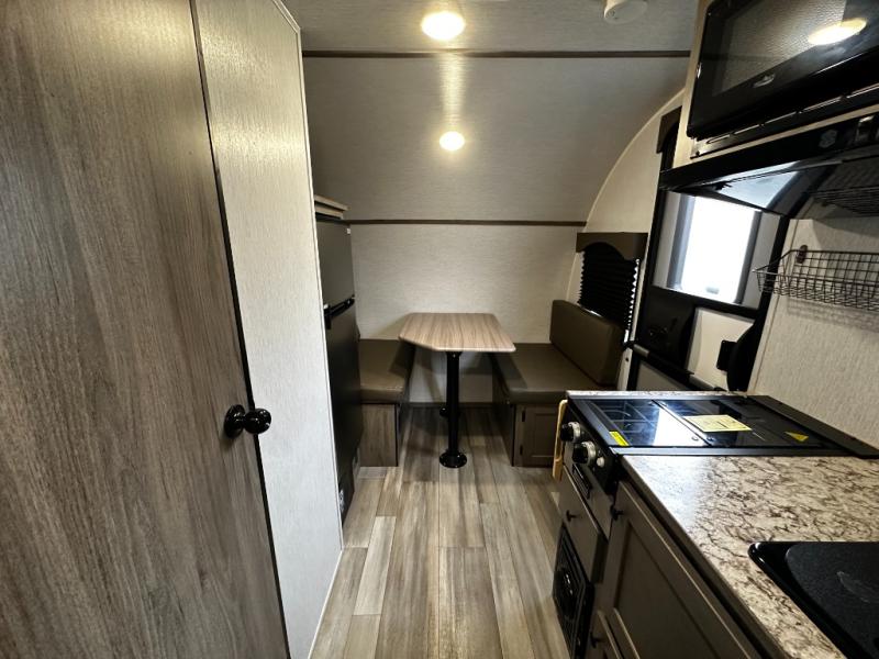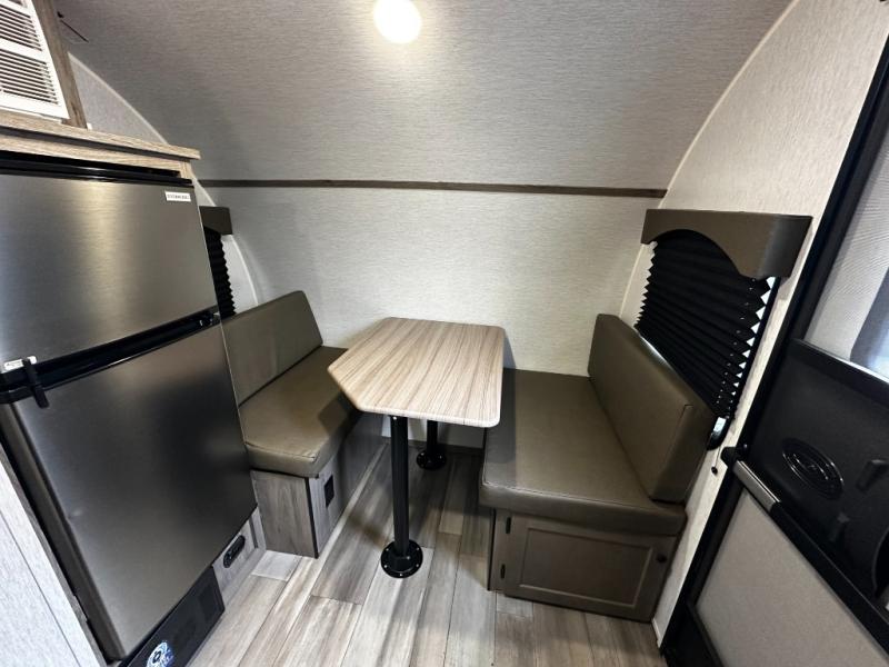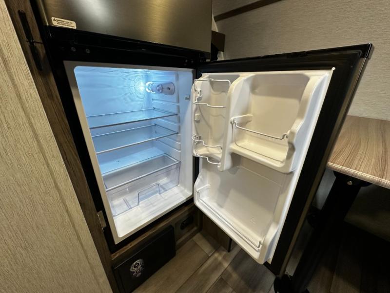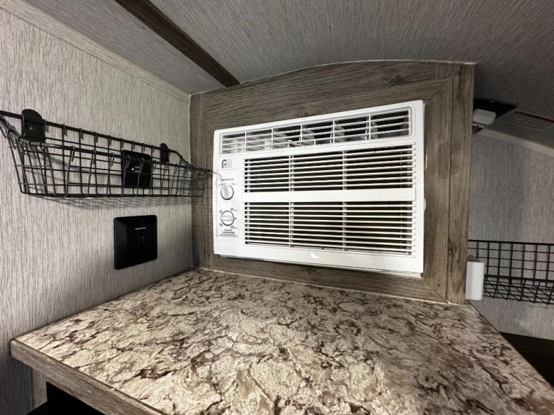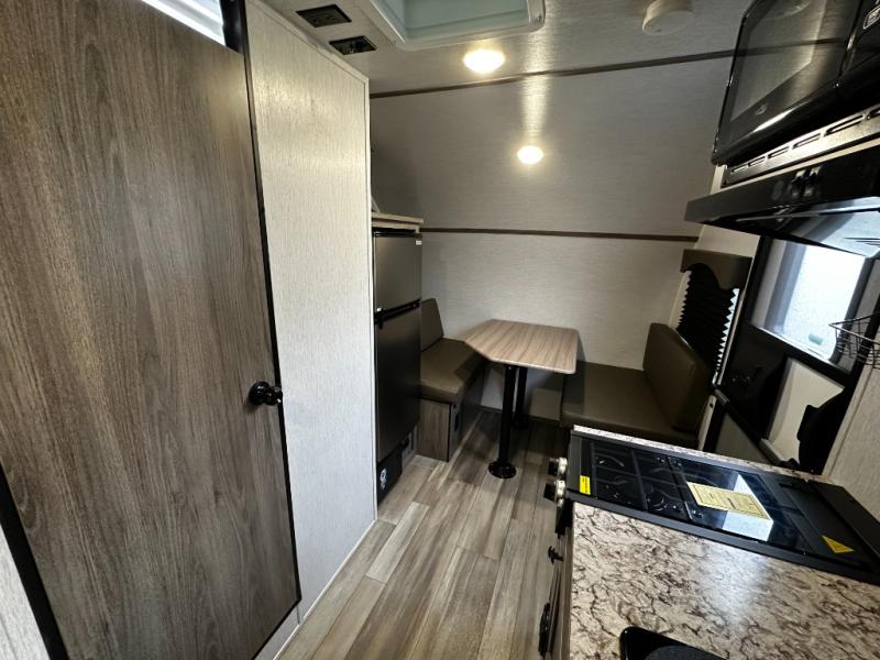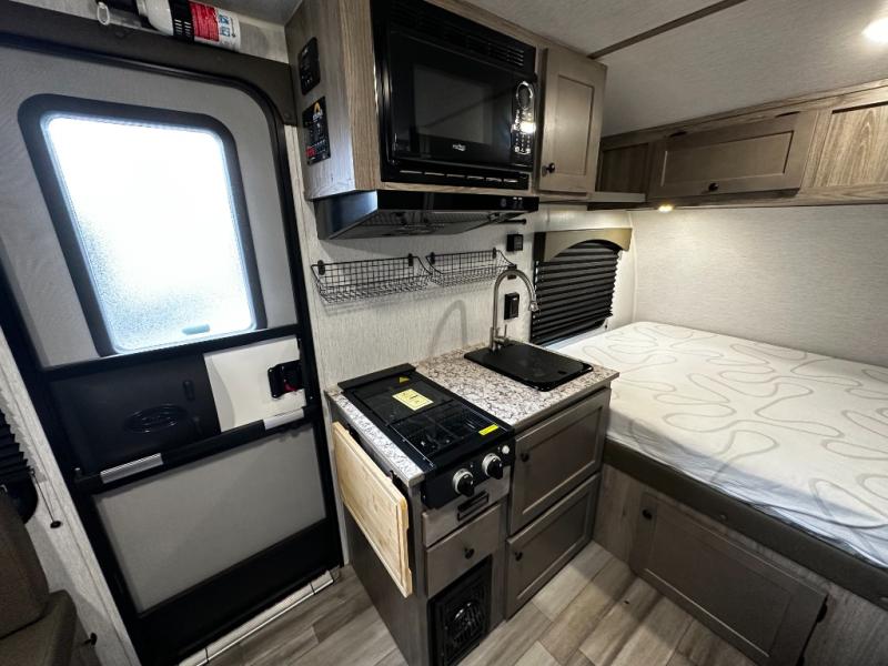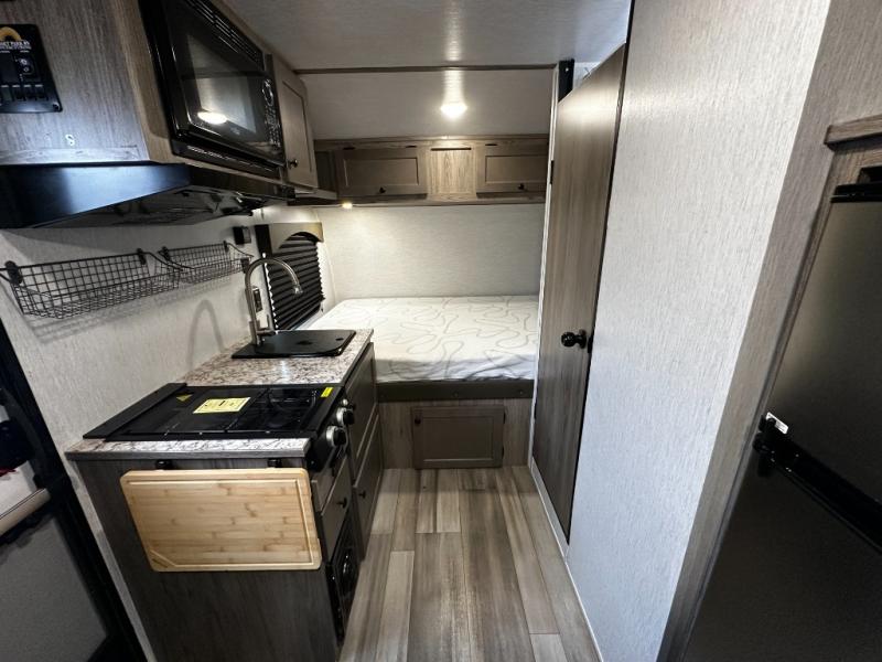 Inside, the SunRay 149 offers a surprisingly functional layout that maximizes space and comfort. A cozy rear sleeping area provides a comfortable place to rest after a day outdoors, while the front dinette easily converts into additional sleeping space for guests. The fully equipped kitchen includes a two-burner cooktop, microwave, refrigerator, and sink, making it easy to prepare meals wherever your travels take you.