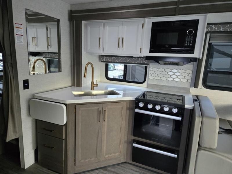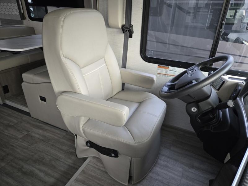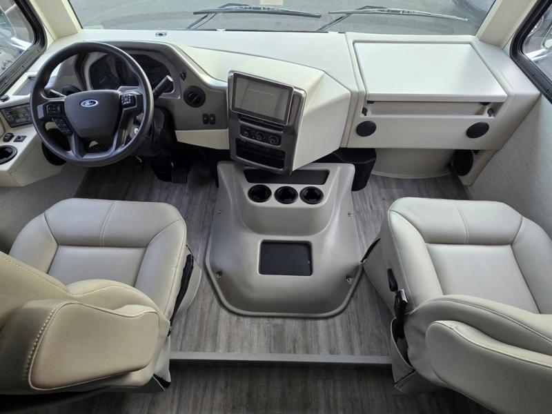 The A.C.E Class A gas motorhome is constructed with a welded tubular steel floor, vacu-bond laminated roof, walls and floor with block foam insulation, and a premium one-piece exterior roof for a coach made to last. You will love the pet-friendly features, like the Bird's Eye window, the Pet-Link multi-purpose tie-down and the Pull-Out Kibble Station with an FDS approved pet bowl liner. Each model includes an Onan RV QG 4,000 gas generator, a Winegard ConnecT Wi-Fi extender +4G, and are pre-wired for solar charging. Some of the other convenient amenities you will find on the A.C.E are framed windows, a basement pass-through storage, and an exterior LP connection. Head inside to find residential vinyl flooring, pressed laminate countertops, glass tile backsplash in the kitchen, and a wireless phone charger!