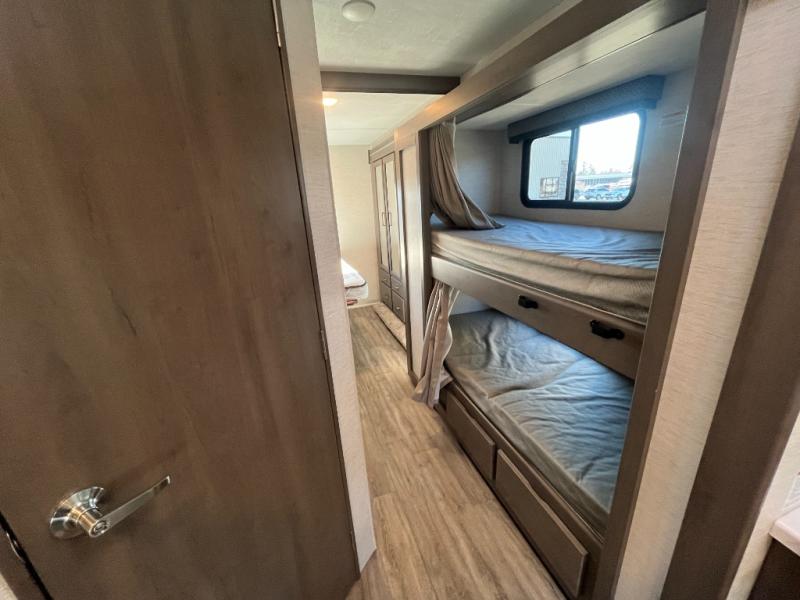 Planning a family vacation, a friend get-away or enjoy traveling with your partner? This coach offers a spacious interior thanks to the full-wall slide that stretches from behind the cab seats to the rear private bedroom. You can rest easy in your own queen bed with access to the double entry bathroom, your kids or guests will enjoy the bunk beds and cab over bunk to sleep on, plus the dream dinette and 68" jack-knife sofa offer even more sleeping space. And the kitchen amenities will impress anyone as they enter the mid-coach entrance. Everyone can watch the 40" mid-ship Smart TV in the living area, or head outside to relax under the power awning with integrated LED lighting. There is even an optional exterior TV if you want to watch the big game outdoors!