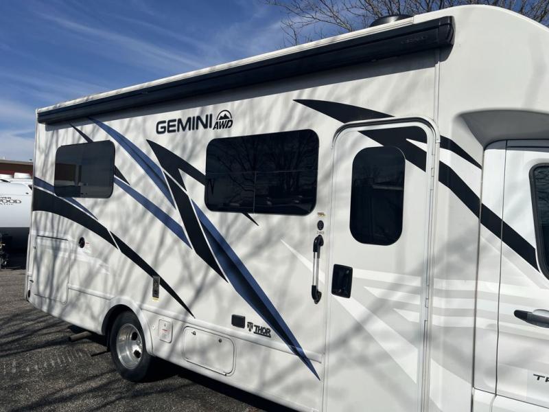 You have the ability to go anywhere with one of these Thor Motor Coach Gemini AWD Class B+ gas motorhomes! They have the perfect duo of an all-wheel-drive system and an AdvanceTrac with Roll Stability Control so you can feel safe navigating through the winding roads. Don't worry about getting lost either thanks to the AM/FM dash radio with SYNC 3, navigation, and an 8" color multi-function display. A 3.5L V6 EcoBoost turbo gas engine powers these units and a Ford Transit chassis holds them up. Stay connected with a Winegard ConnecT 2.0 with WiFi, a 4G hotspot, and even a TV antenna. You can even go off the grid with the 100-watt solar panel with a controller! Come find your favorite model today!