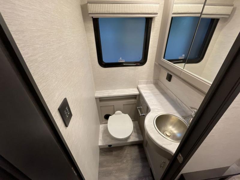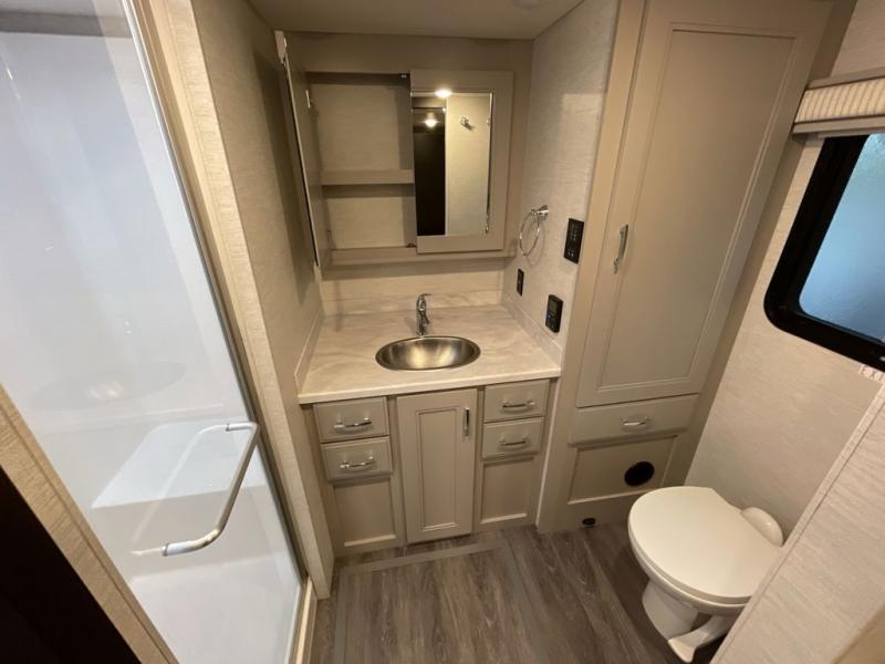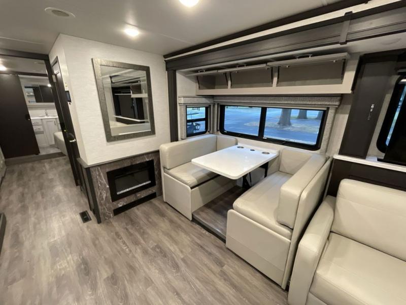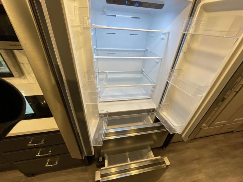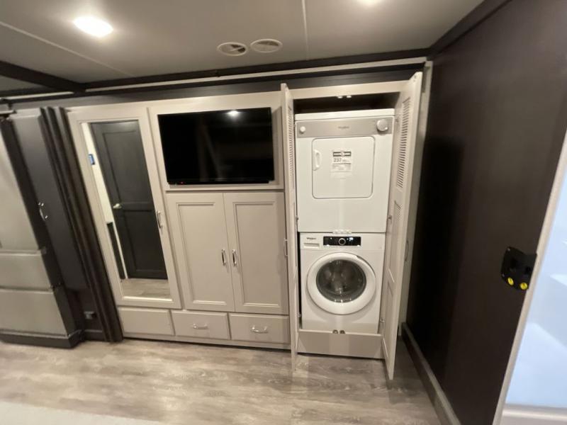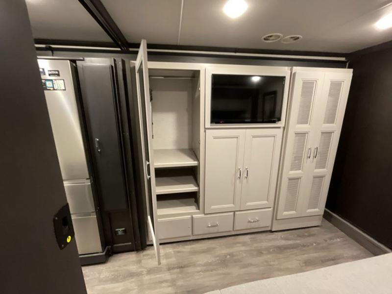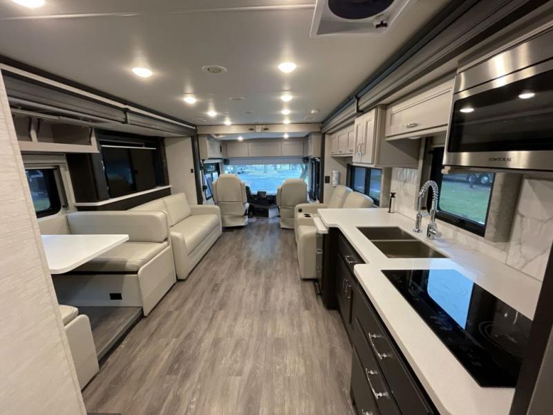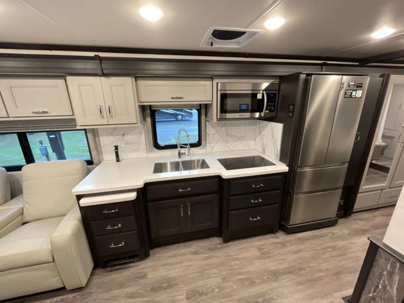 Dream of the places you'll go and sights you'll see in this spacious coach for six! There is a full-wall slide, plus two additional slides for maximum space and comfort. The little ones or your guests will love sleeping on the drop-down overhead bunk, while you take the king bed slide out in the rear private bedroom. There is also a large bedroom closet, a dresser, and your own 32" LED Smart TV here to watch a late-night show in bed. You will love to relax in the main living area on the reclining theater seating across from the 50" LED Smart TV, or you can all play a game at the 92" Dream Dinette slide. When everyone gets hungry, the chef of your group can whip up a hearty meals with the two burner electric induction cooktop or use the stainless steel over-the-range convection microwave, and there is a 15.7 cu. ft. French door residential refrigerator here for perishables!