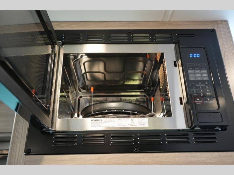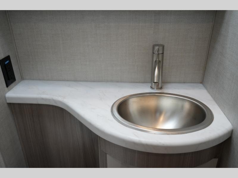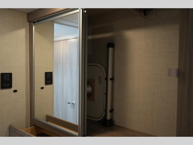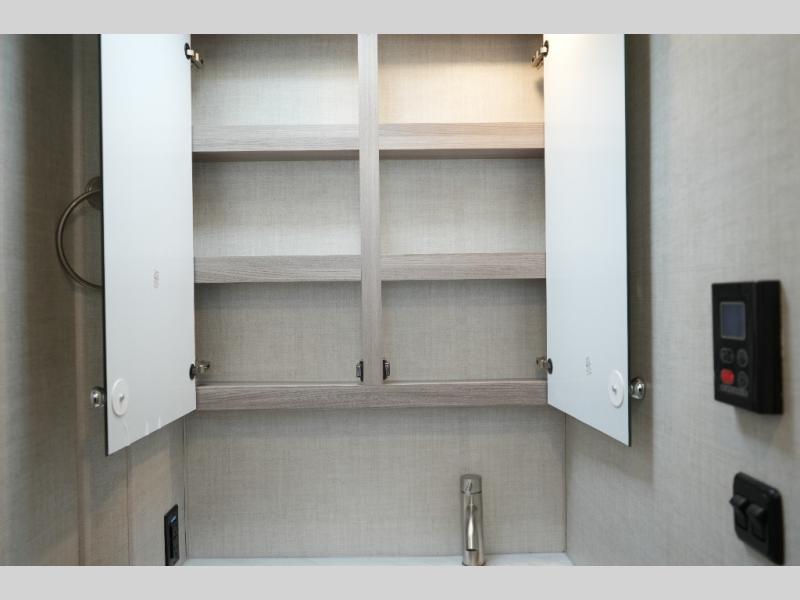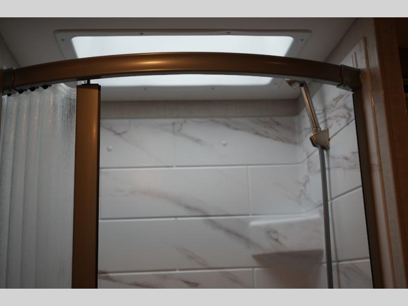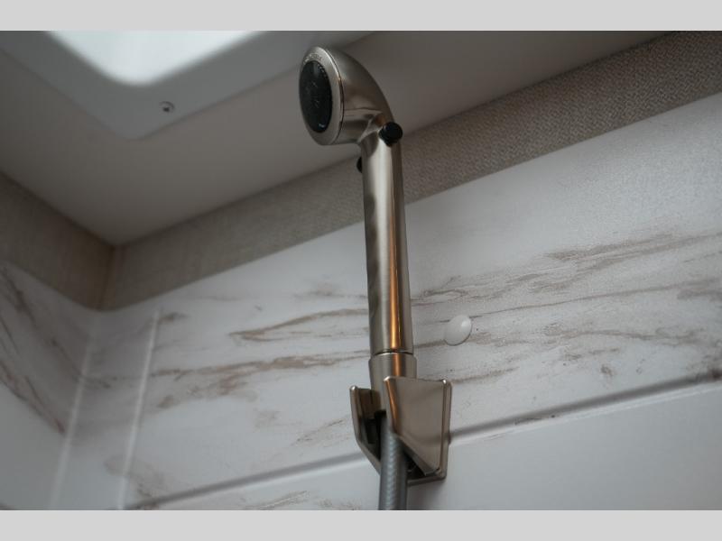 Enjoy the convenience of a split bathroom layout for simultaneous use – with a 24" x 32" shower on one side and toilet/vanity on the other. The kitchen comes equipped with a flip-up countertop extension for added prep space, and multiple smart touches throughout – including USB charging ports, privacy roller shades, and a telescoping ladder to access the overhead bunk.