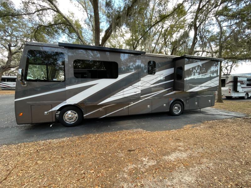 Pack your bags and load up into this motorhome for a luxurious adventure! The rear private bedroom has a king bed slide that can be switched for an optional queen bed, a bank of drawers next to a TV, a large closet, and a wardrobe that is prepped to add an optional washer and dryer so you can have clean clothes throughout your entire trip. The full bathroom has a shower skylight, gravity flush toilet, solid surface countertop, and a handheld shower head with a slide bar for added convenience. When you're ready to eat, just whip up a meal on the three burner propane cooktop or use the convection microwave. You can dine at the booth dinette, or maybe switch out the dinette for an optional dinette computer workstation with a lift TV! You can spend your evenings with a movie since there is a living area TV with an optional fireplace, or you can head outdoor to enjoy the exterior TV and Girard power awning with LED lights!