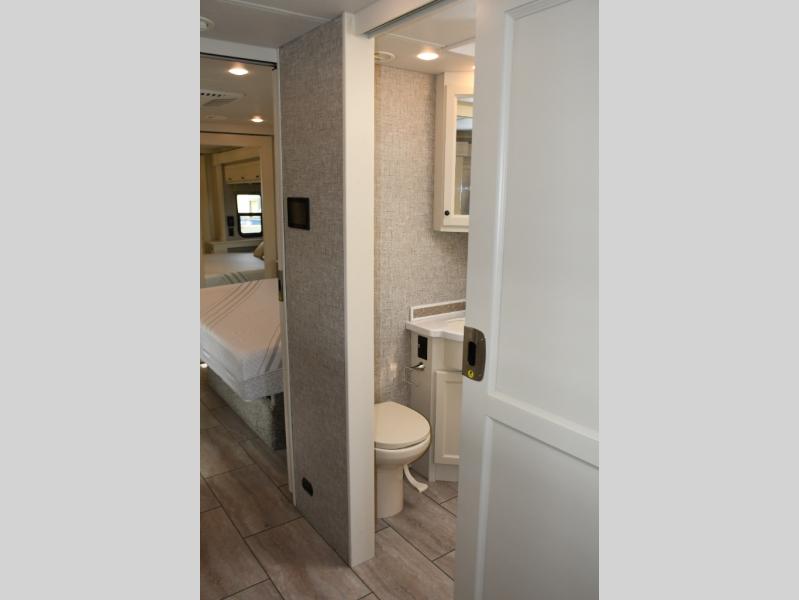 Step inside and you’ll immediately notice the thoughtful layout engineered for everyday comfort and convenience. With expansive panoramic windows, bright interior finishes, and premium furnishings, the Byway 38 BL makes every journey feel like home. The galley kitchen is well-appointed for meal preparation with quality appliances and plenty of counter space. Relaxation comes naturally in the generously sized living and dining area, while the master suite provides a private retreat with comfortable bedding and ample storage.