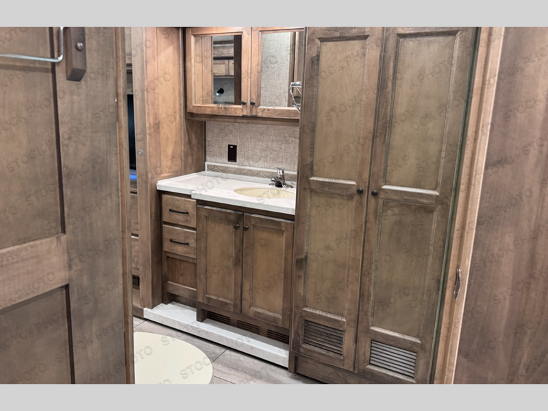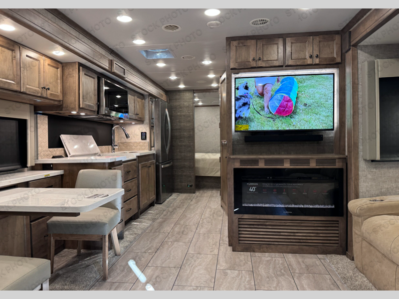 There are many standard luxurious features you will love about this motorhome! It also has many optional features you can add like the optional drop-down front bunk, the super sofa, the air coil sofa bed, or the theater seating. The king bed slide in the rear private bedroom offers a comfortable place to sleep, as well as the flip and fold sofa bed in the living area. You will love the dinette bar with a lift TV, a flip-up countertop, and two chairs that will make this the perfect place to get some work done while you're on the road. The kitchen includes everything you need to prepare meals each day, including a 1.7 cu. ft. smart convection microwave with an air fryer, a three burner liquid propane cooktop, and a 23 cu. ft. stainless steel residential refrigerator with French doors and a bottom freezer. Head to the rear master bedroom with a queen bed slide out, a large wardrobe, a cabinet with a TV and drawers below, plus a private entrance into the dual entry bath!