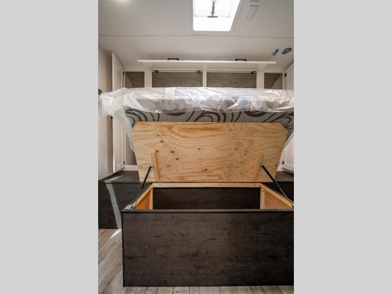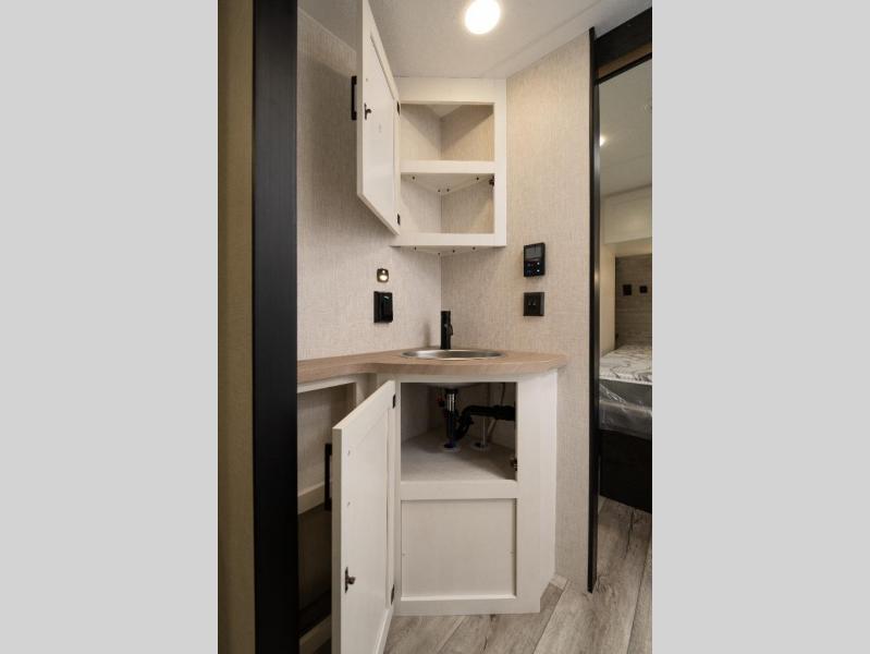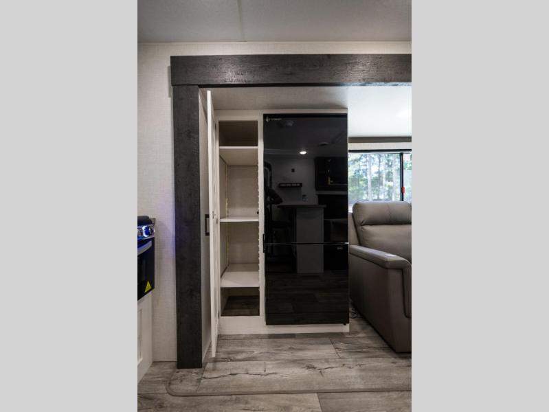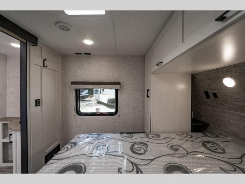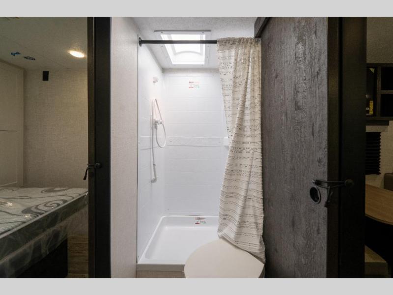 You'll love every minute spent in this dual entry travel trailer. The front master bedroom includes one of these doors, along with a Sleep Tight queen bed, dual wardrobes, and easy access into the walk-thru bath. Your crew can relax on the theater seating within the large slide out, play a game at the Sit N' Slide table with flipside reversible cushions, or dine at the bartop with stools. There is also a rear kitchen with ample counter space. Head outdoors to enjoy the 20' power awning in your camp chairs!