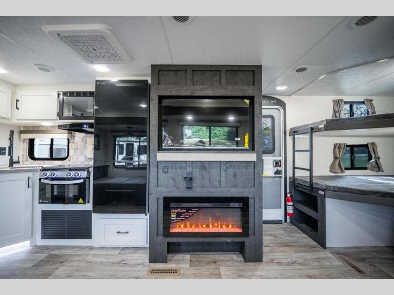 You'll love every minute spent in this bunkhouse travel trailer. The front private bedroom includes a Sleep Tight queen bed, dual wardrobes, and TV prep if you want the option to watch movies in bed. Your crew can relax on the sofa or Sit N' Slide table within the large slide out and watch a movie with the Smart TV. Since there is an outdoor griddle and refrigerator plus a 20' power awning, you may just find yourselves outside most days! When it's time to call it a night, there are double-size bunks in the rear corner for your guests, and the full bath is right next to the bunks for easy nighttime use. This unit also includes an entryway pantry with washer and dryer prep, making it easier to go full-time if you choose!