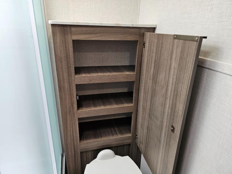 Linen storage in two locations for towels and toiletries