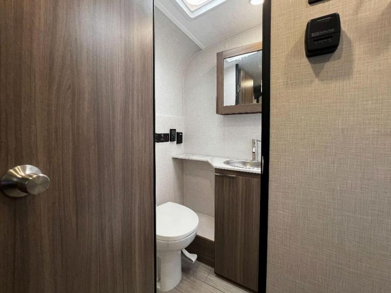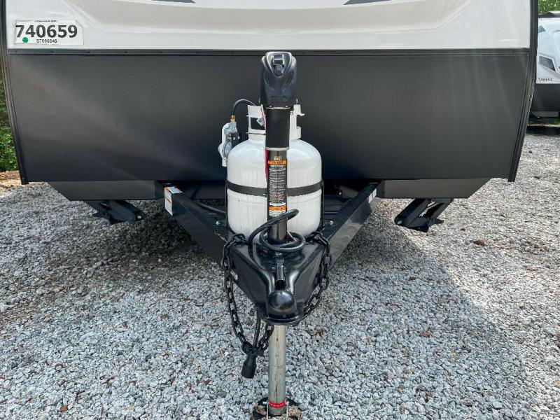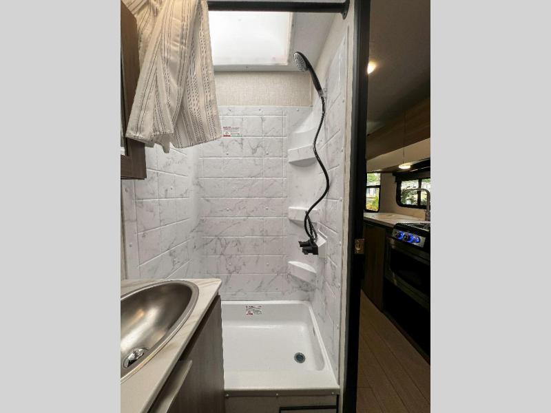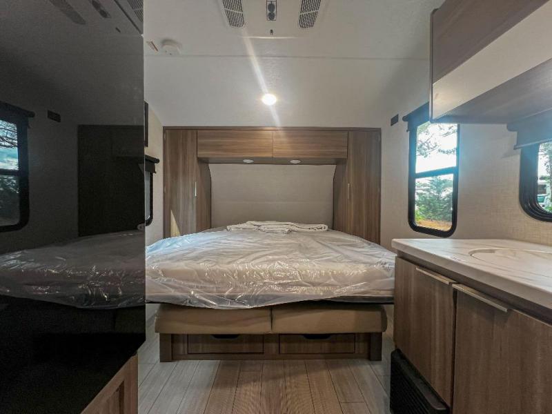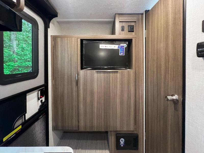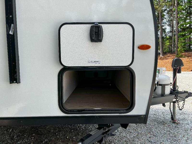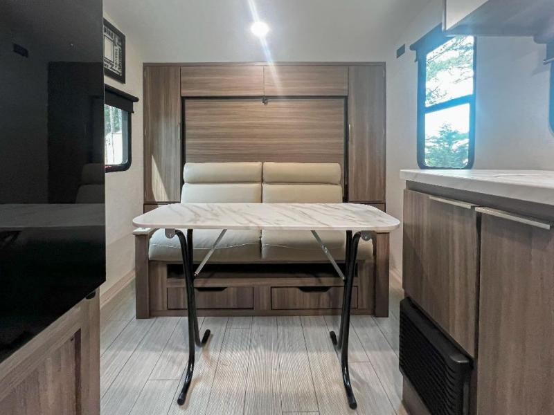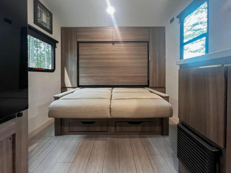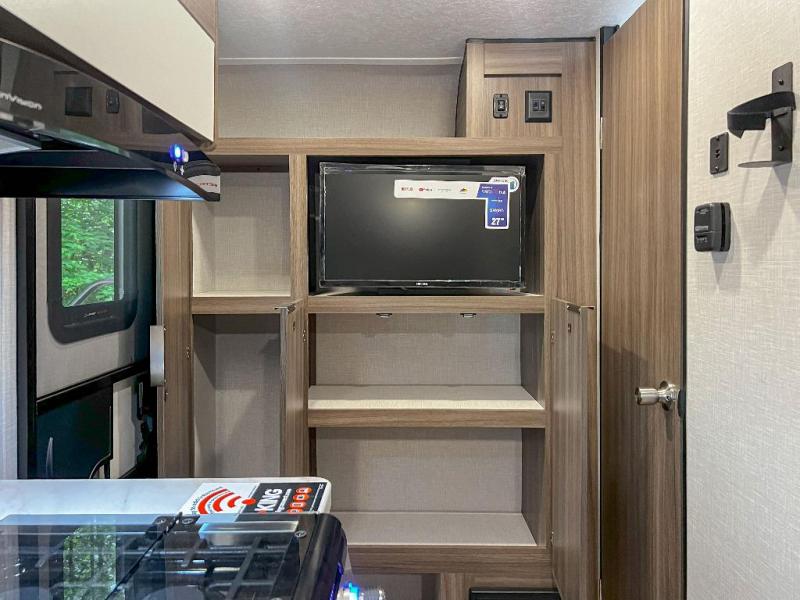 Light-weight, easy to tow and setup, and comfortable for one or two, this trailer is perfect for a couple or a person that enjoys the great outdoors with inside comforts nearby! The Murphy RV queen bed promotes versatile living by giving you a sofa to relax on during the day and a bed to sleep on at night with StorMore bedside nightstands including USB charging. The removable table is handy for dining when you are inside, plus you might decide to take it outside to relax under the 11' power awning. The full bathroom in the back corner allows you to skip the public facilities. And you will find storage throughout for clothing, dishes, and food including in the pantry/closet and the overhead cabinets, plus outside in the exterior pass-through storage area which includes a motion-activated light!