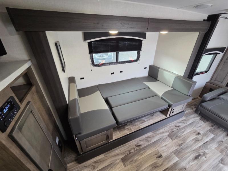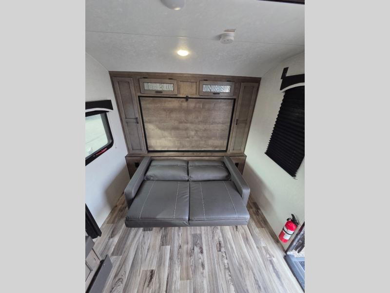 A cook will love this trailer with the choice to make meals inside with full amenities including an 8 cu. ft. refrigerator and a pantry, or outside while using the campfire cafe which offers a griddle and refrigerator, plus counter space to prepare and serve meals. There is sleeping space for four when you utilize the U-shaped dinette slide out that also provides more interior floor space along with the versatile Murphy bed and sofa up front. You will also find a privacy curtain that will section off this area that also features StorMore bedside nightstands with a 110V outlet and USB charging, and two wardrobes.