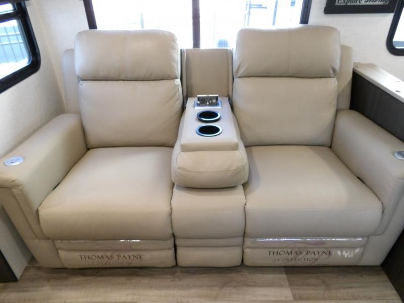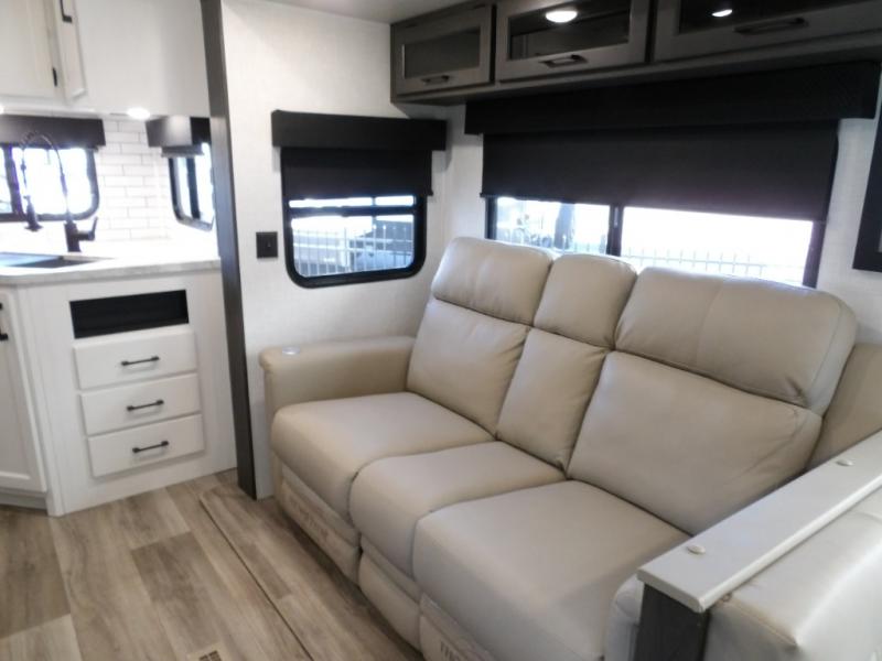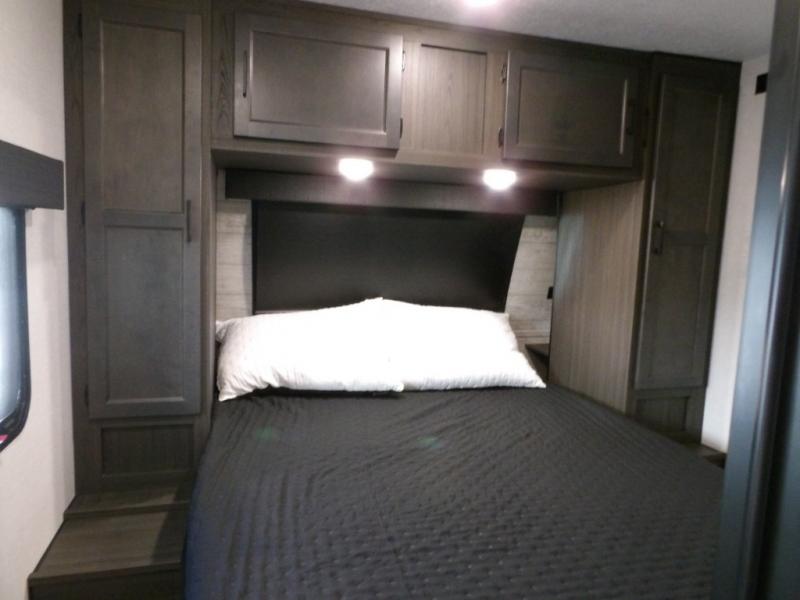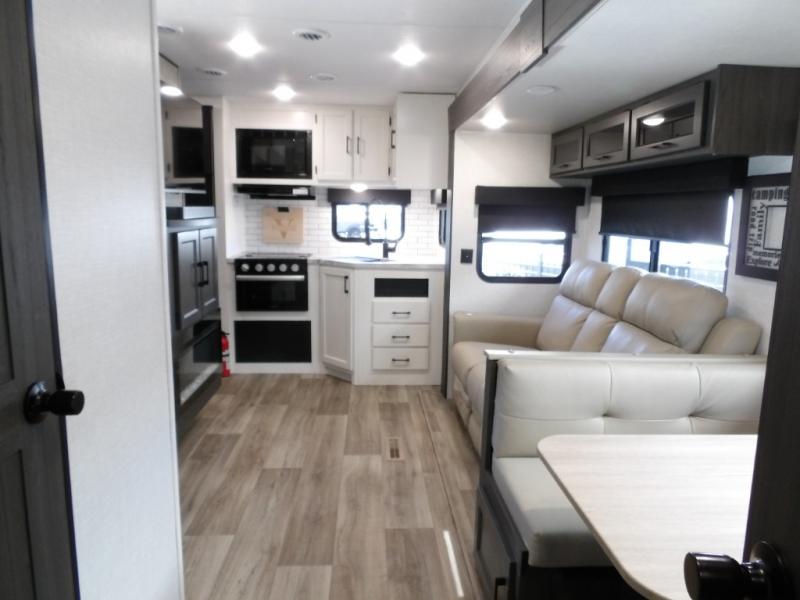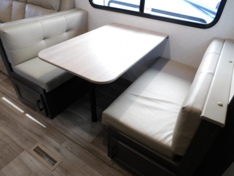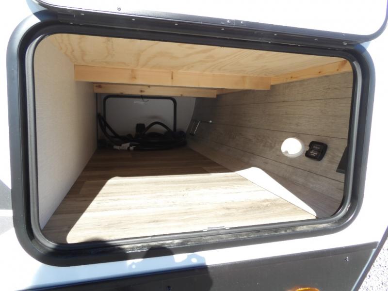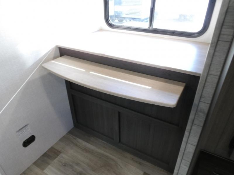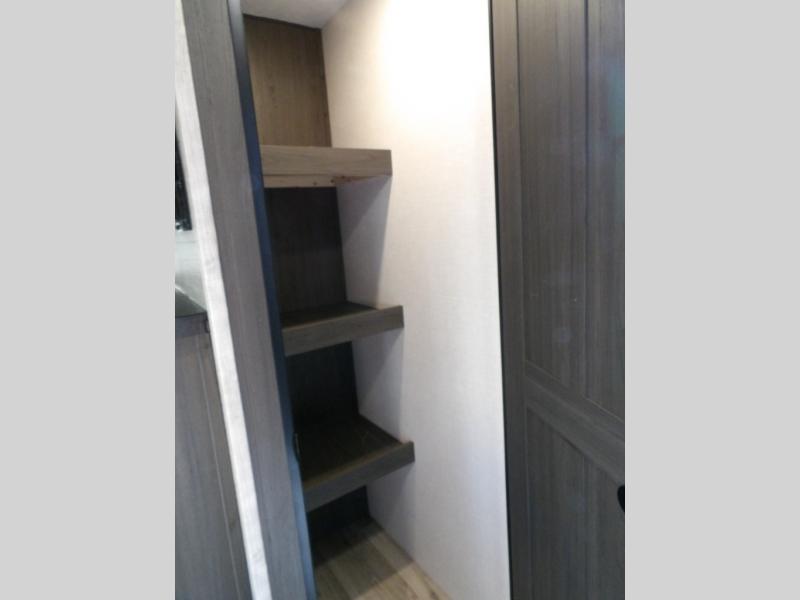 The chef will love the open rear kitchen area of this travel trailer! The 10 cu. ft. 12V refrigerator is big enough to hold your perishables and the flip countertop area is the perfect place for a coffee bar. You can even cook outside with the campfire café that has a refrigerator, a sink, and a griddle to grill some burgers while breathing in fresh air. Just be sure to grab your coat hanging on the coat hooks in the walk-in pantry before heading out the door. A 70" sofa and Sit N' Slide table adds more interior space, as well as comfortable places to eat, relax, and even sleep once converted. Everyone can freshen up in the full bathroom with the 34" radius shower and even have their towel close by thanks to the linen closet next to it!