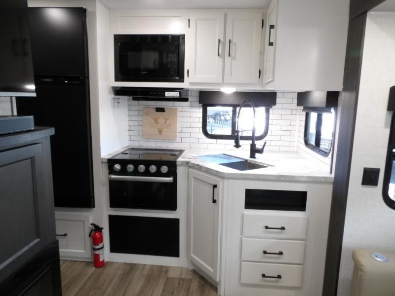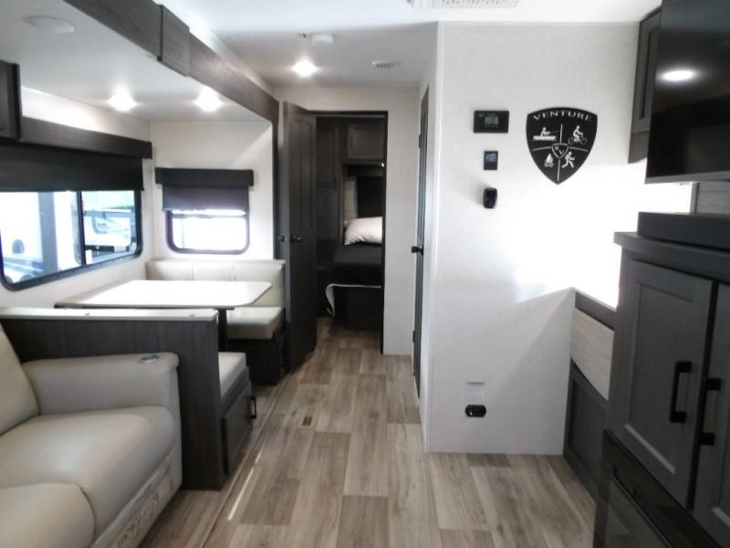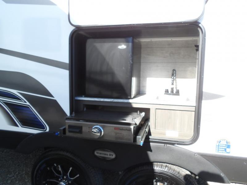 Every Venture RV SportTrek lightweight travel trailer is constructed to offer peace of mind and the comforts of home! Their purposeful residential kitchens are packed with handy features like a Furrion oven and three burner cooktop, a large stainless steel sink with a cover and dish drying rack, plus a 12V refrigerator. You will find plenty of storage throughout, including Safe-Tek hidden storage with a charging center and StorMore nightstands on either side of the bed behind the full-length closets. And the magnetic slam-latch baggage doors and spacious pass-through storage area will hold your outdoor gear in place. They even come with a hot and cold exterior shower and SporTrek's Weather Shield which includes a forced air heated and enclosed underbelly, high output A/C ducting, and more features that will let you extend your camping season. You will also love the new residential upgraded furniture, Serta memory foam mattress, barn style passage doors, and many more comforts!