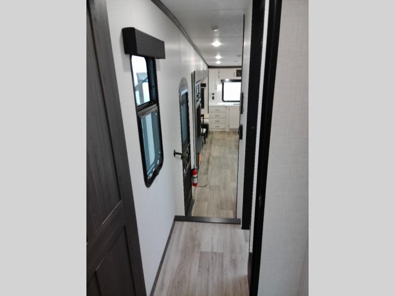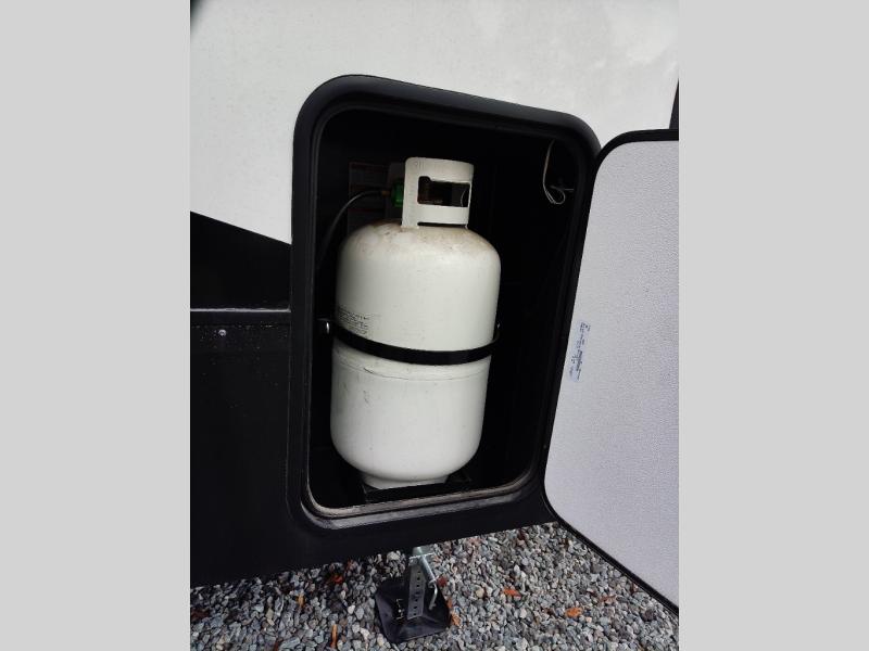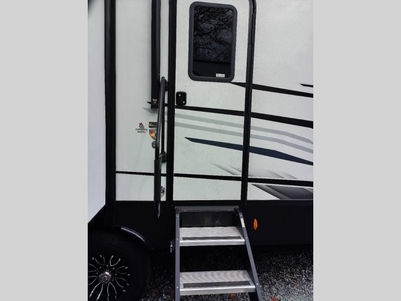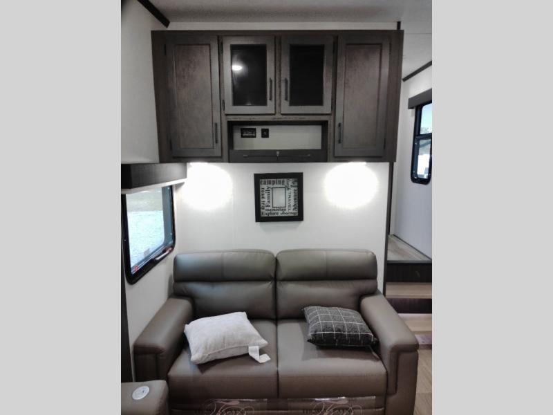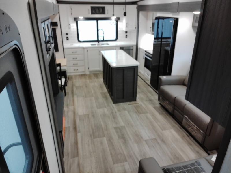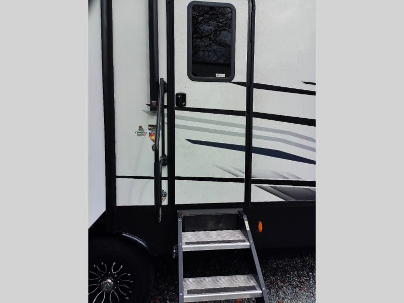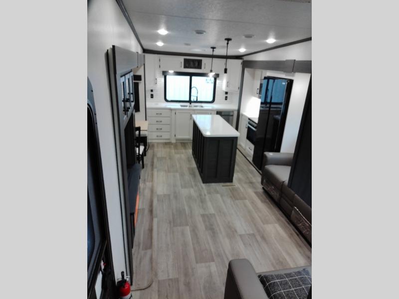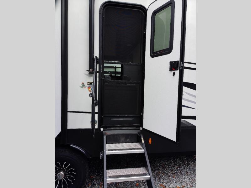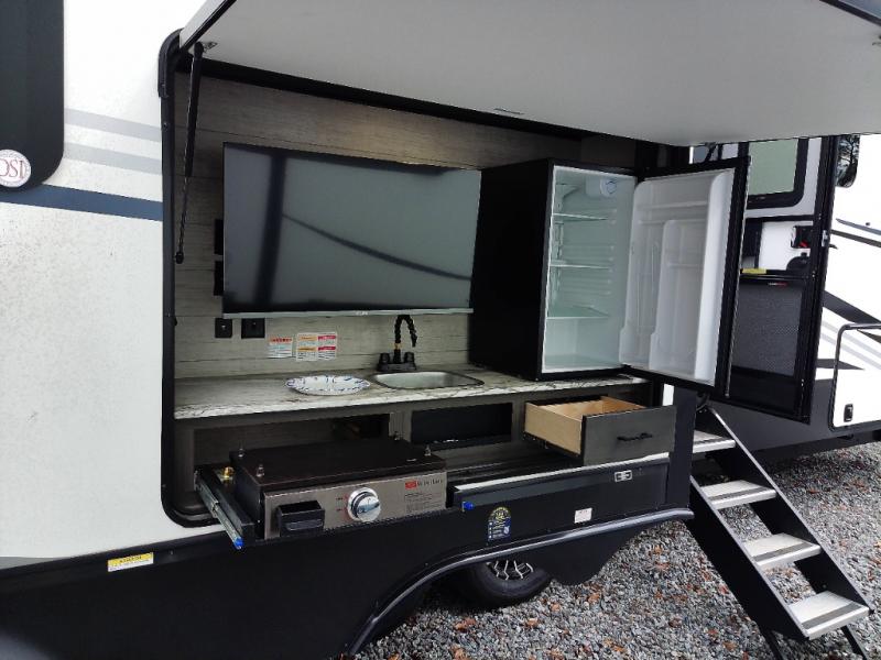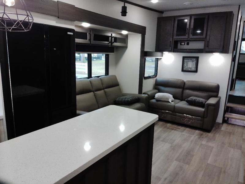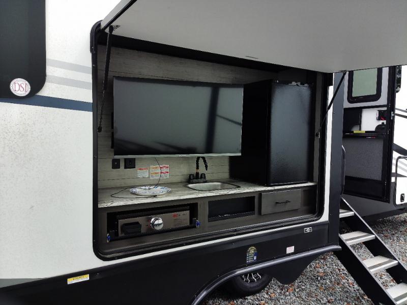 The chef will love cooking in the rear kitchen of this fifth wheel! The front private bedroom has a Serta king mattress to lay your head on at night, a window seat to comfortably read a book while enjoying the 5,000 BTU fireplace, a shelf storage closet, and a prepped area for a washer and dryer. Freshen up each morning with the 48" fiberglass shower with a seat in the full bathroom then head down the floating steps with shoe storage to whip up a delicious breakfast. The fully equipped kitchen even comes with a 18" GE stainless steel dishwasher at the rear sink with countertops on either side for easy clean up. Enjoy your meals at the table with two chairs and two Versa benches. You could even cook at the outside campfire cafe with the griddle. Inside the middle living area, you will find a tri-fold sofa with overhead cabinets and theater seating with USB charging across from the entertainment center with a 5,000 BTU fireplace!