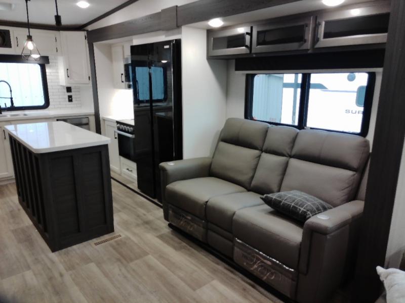 An elegant design and new features come with every one of these Venture RV SportTrek Touring Edition fifth wheels! The NXG Huck bolt frame holds these units together and Tufflex PVC roofing covers them. Heads will turn down the highway and at the campsite with the frameless tinted windows and high gloss fiberglass front cap with automotive paint. The exterior pass-through storage area has slam latch baggage doors with magnetic catches so you don't have to worry about them closing on you and LED lighting on the electric awning so you can see clearly even at night. Luxury abounds throughout these units, especially with the two fireplaces, solid surface kitchen countertops, blackout roller shades, and maximum storage designs. Come find your favorite model today!