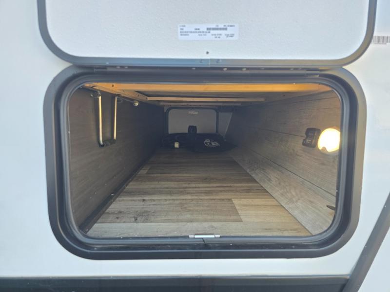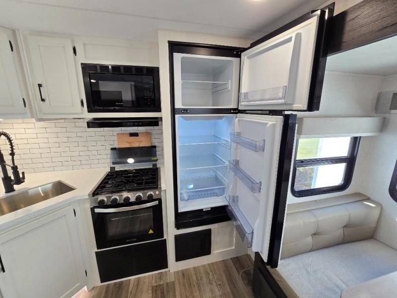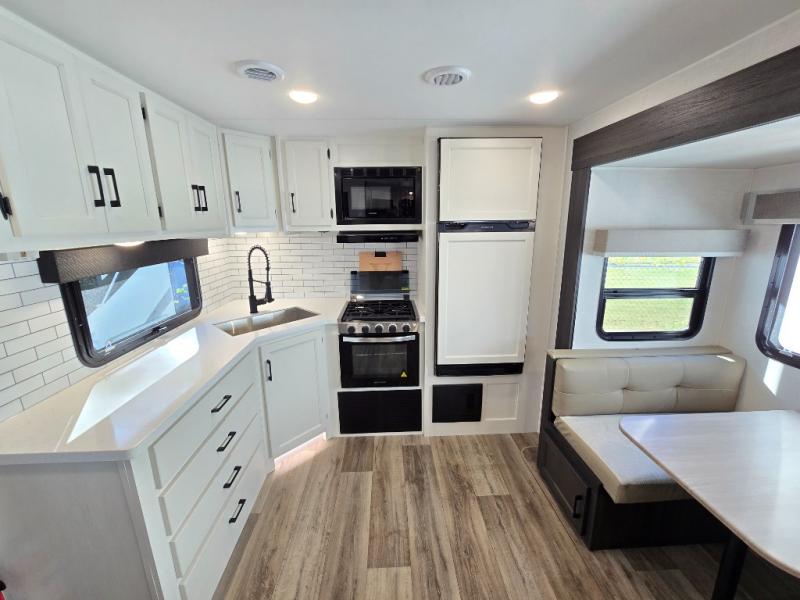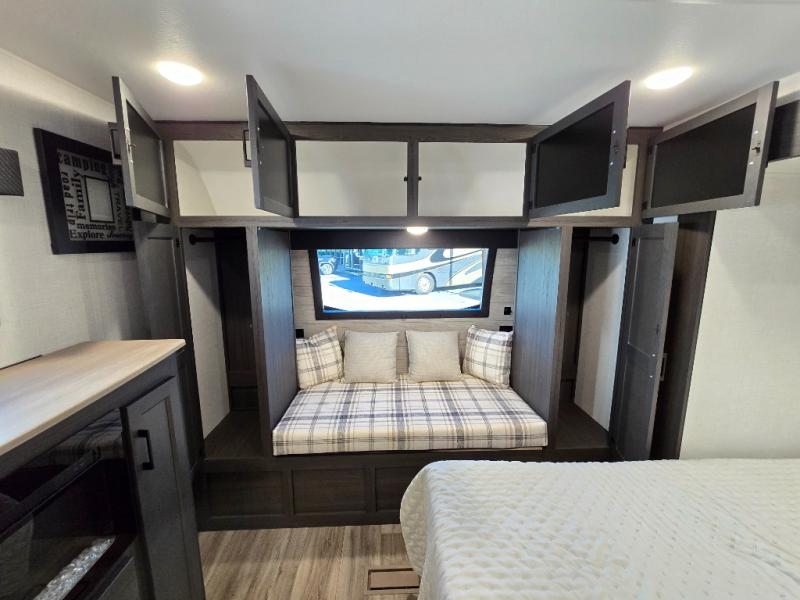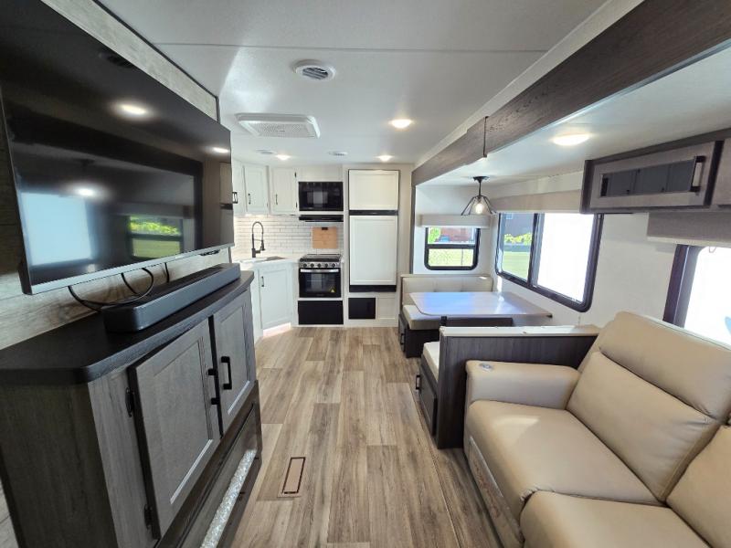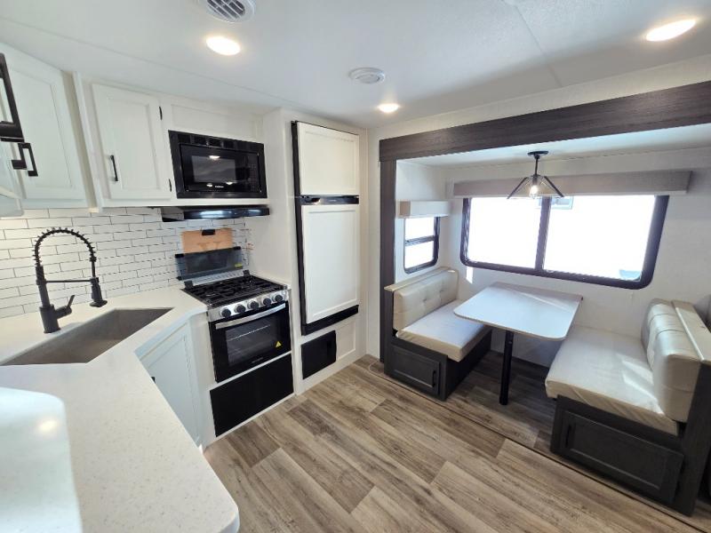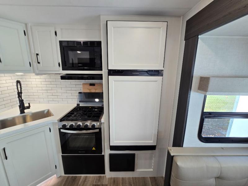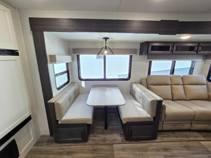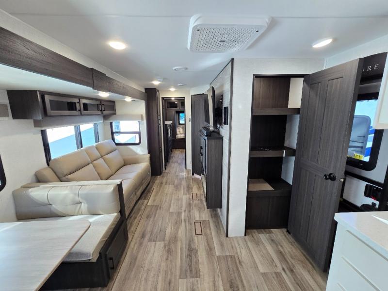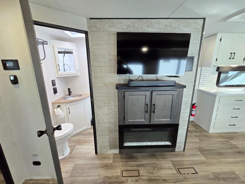 This travel trailer is perfect for two people who want to escape from everyday life! The front private bedroom has a 70" x 80" Sleep Tight king bed slide for more interior space, a dresser with a 30" frameless fireplace and TV, and a window seat to read a book with a view. Freshen up each morning in the full bathroom with the 30" x 36" shower then head to the rear kitchen to fry up some eggs on the three burner cooktop. The Sit N' Slide table offers a comfortable place to enjoy your meals, play card games, and even transform into an extra sleeping space. Grab a snack from the walk-in pantry and relax on the 70" tri-fold sofa across from the entertainment center with a 30" frameless fireplace!