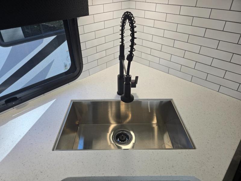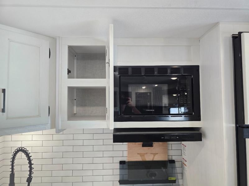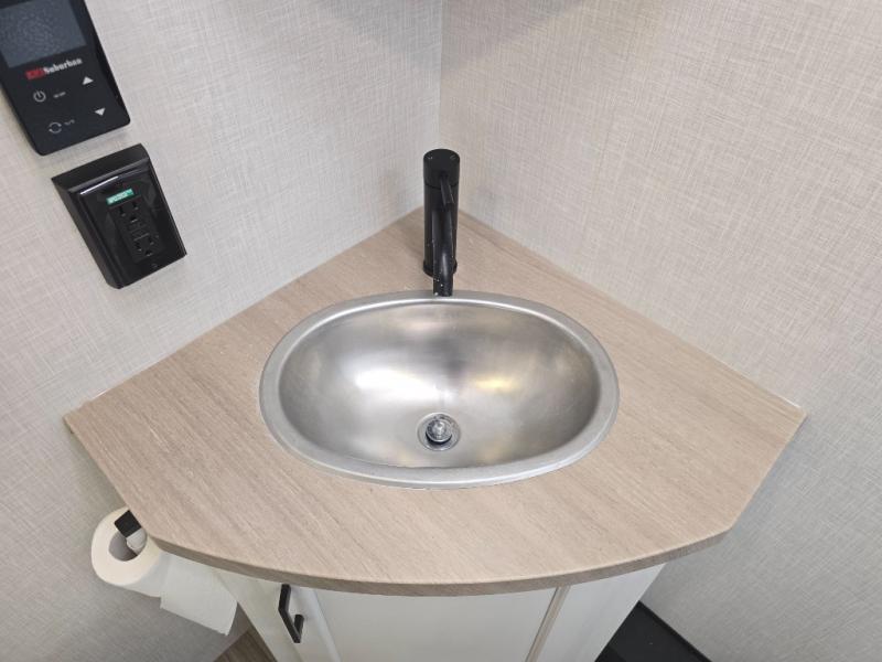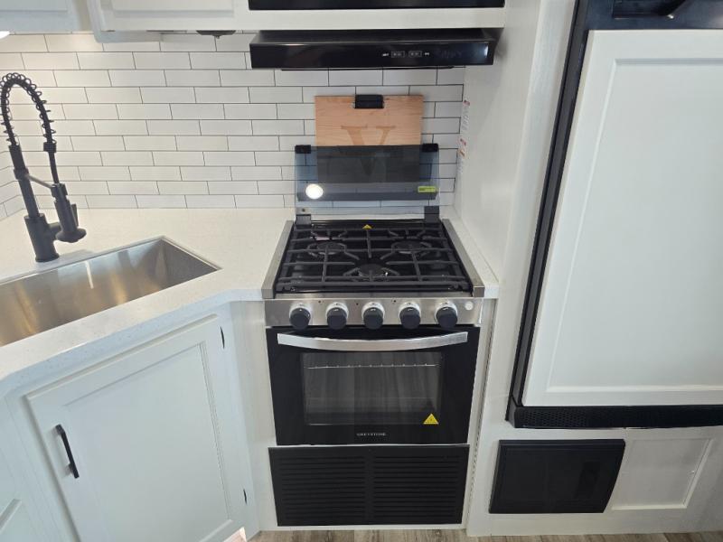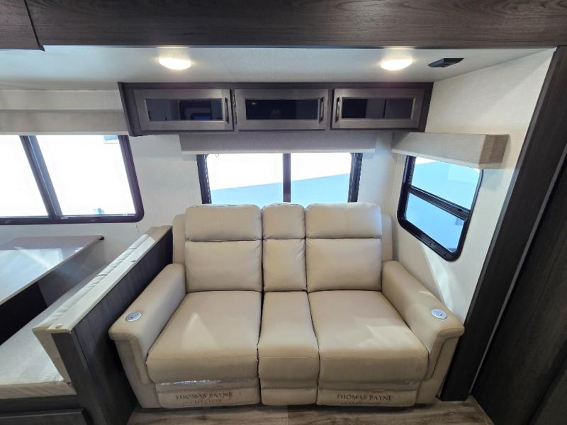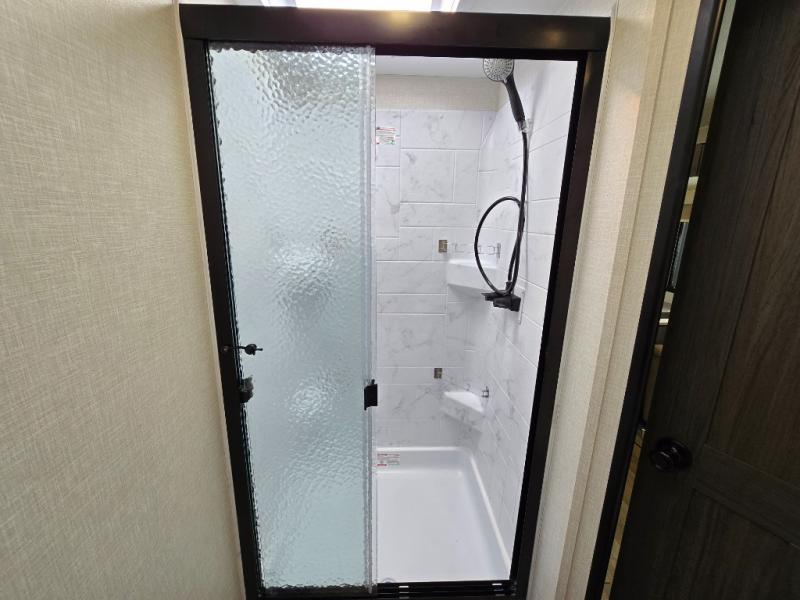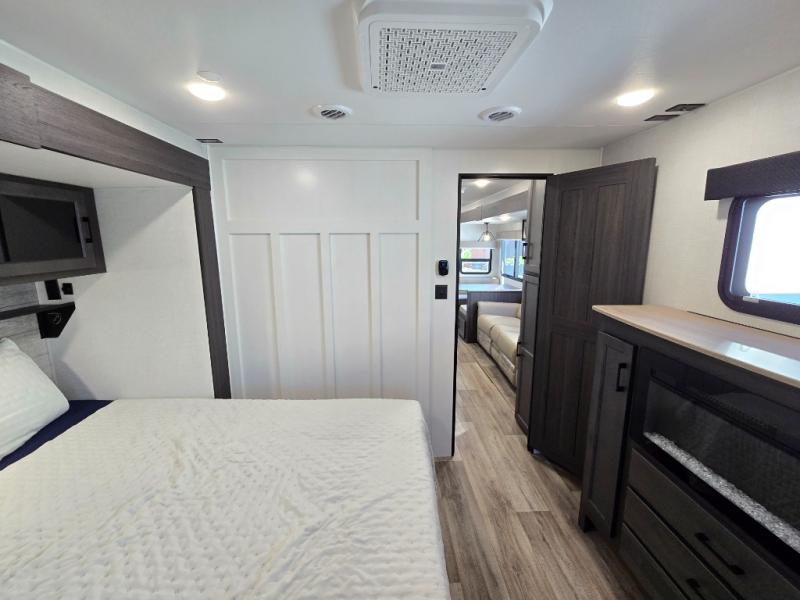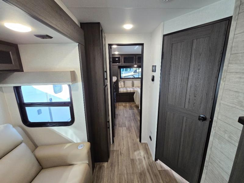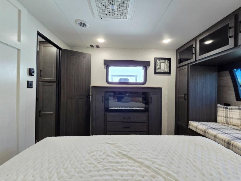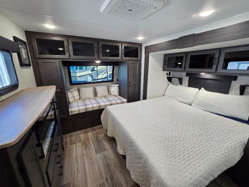 This travel trailer is perfect for two people who want to escape from everyday life! The front private bedroom has a 70" x 80" Sleep Tight king bed slide for more interior space, a dresser with a 30" frameless fireplace and TV, and a window seat to read a book with a view. Freshen up each morning in the full bathroom with the 30" x 36" shower then head to the rear kitchen to fry up some eggs on the three burner cooktop. The Sit N' Slide table offers a comfortable place to enjoy your meals, play card games, and even transform into an extra sleeping space. Grab a snack from the walk-in pantry and relax on the 70" tri-fold sofa across from the entertainment center with a 30" frameless fireplace!