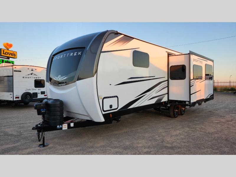 An elegant design and new features come with every one of these Venture RV SportTrek Touring Edition travel trailers! The NXG Huck bolt frame holds these units together and a walkable roof covers them. Heads will turn down the highway and at the campsite with an upgraded graphics package and a painted fiberglass front cap with integrated LED light. The exterior pass-through storage area has slam latch baggage doors with magnetic catches so you don't have to worry about them closing on you and a motion activated light to see your items clearly even at night. Luxury abounds throughout these units, especially with the mandatory Interior Luxury package which comes with solid surface kitchen countertops, designer valances with fabric nightshades, two 30" frameless fireplaces, and Beauflor wood plank flooring that is easy to clean. Come find your favorite model today!