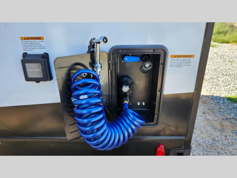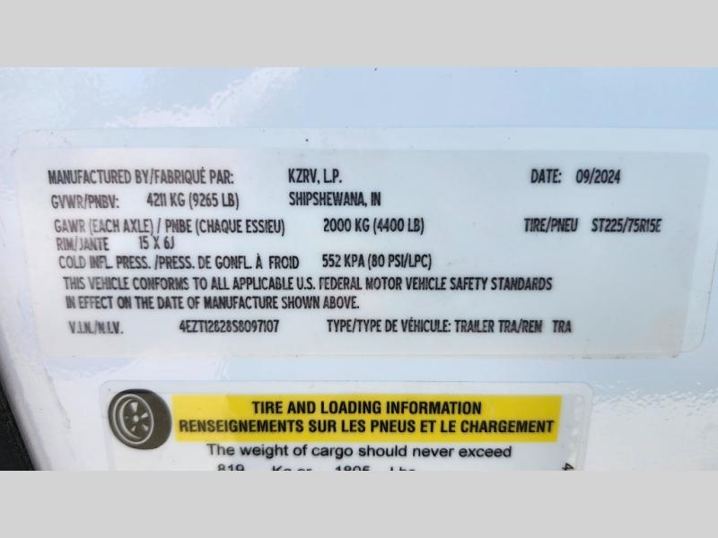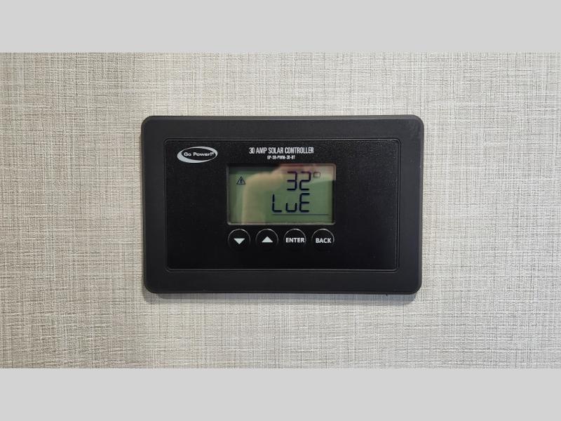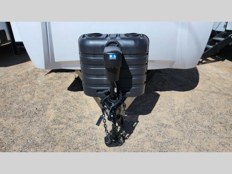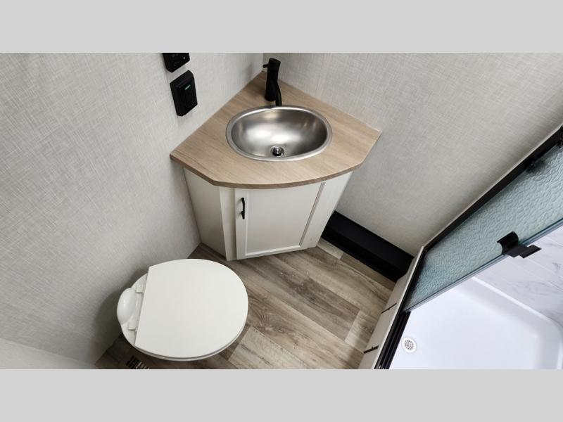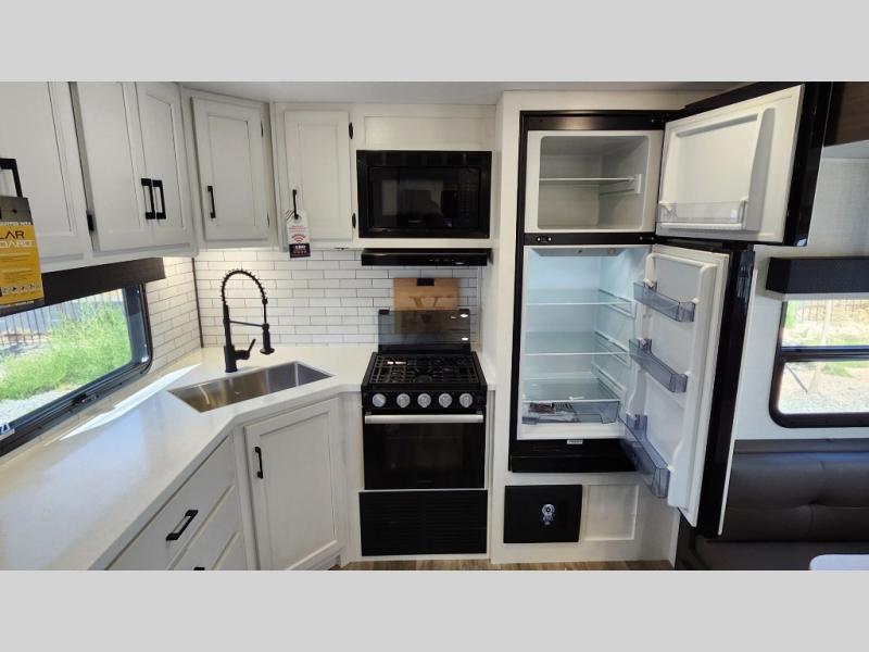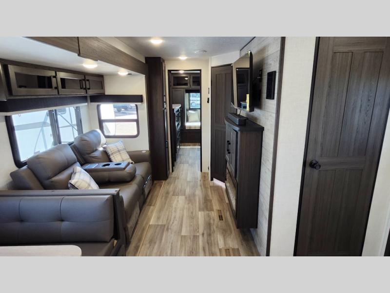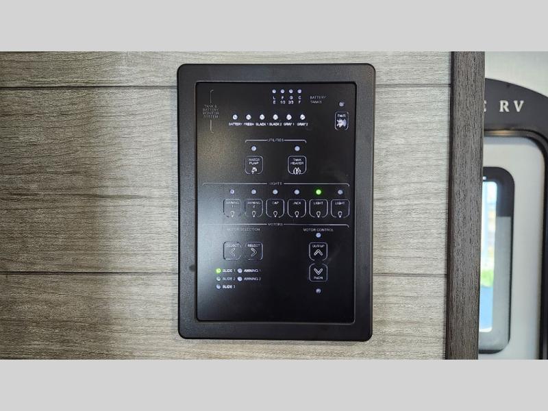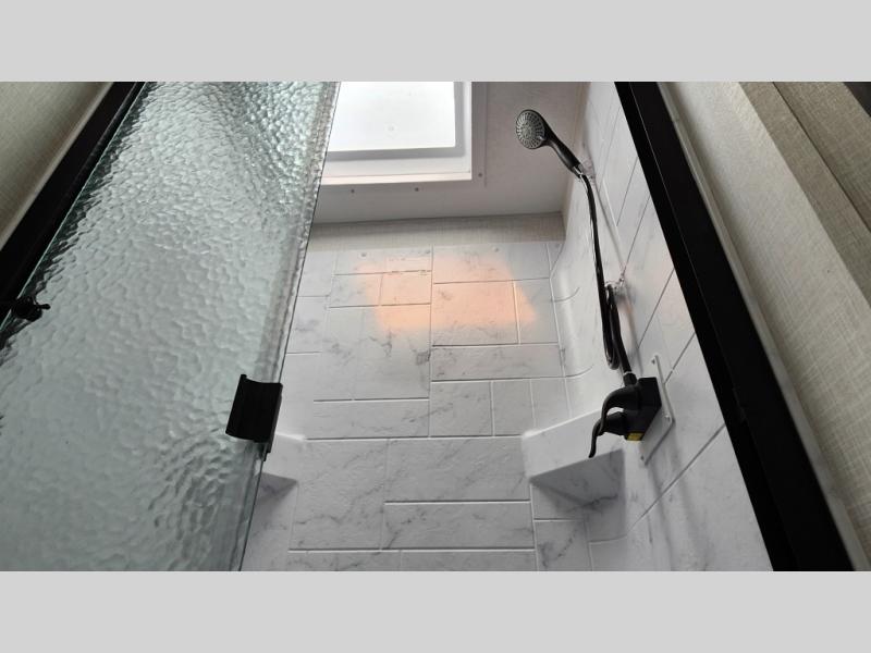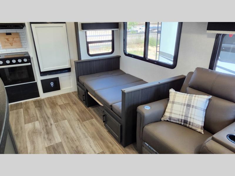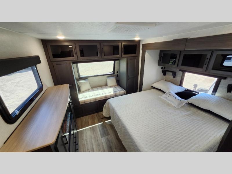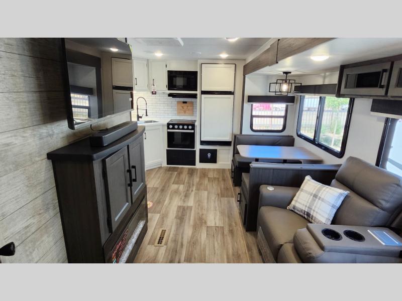 This travel trailer is perfect for two people who want to escape from everyday life! The front private bedroom has a 70" x 80" Sleep Tight king bed slide for more interior space, a dresser with a 30" frameless fireplace and TV, and a window seat to read a book with a view. Freshen up each morning in the full bathroom with the 30" x 36" shower then head to the rear kitchen to fry up some eggs on the three burner cooktop. The Sit N' Slide table offers a comfortable place to enjoy your meals, play card games, and even transform into an extra sleeping space. Grab a snack from the walk-in pantry and relax on the 70" tri-fold sofa across from the entertainment center with a 30" frameless fireplace!