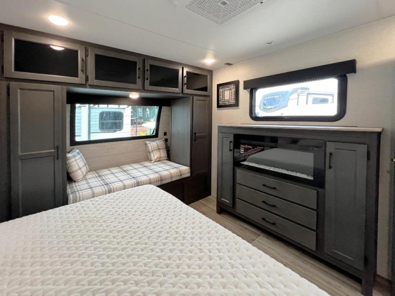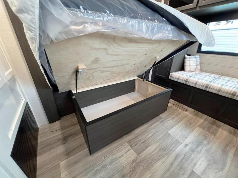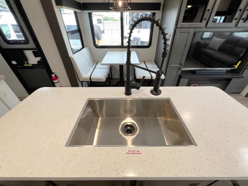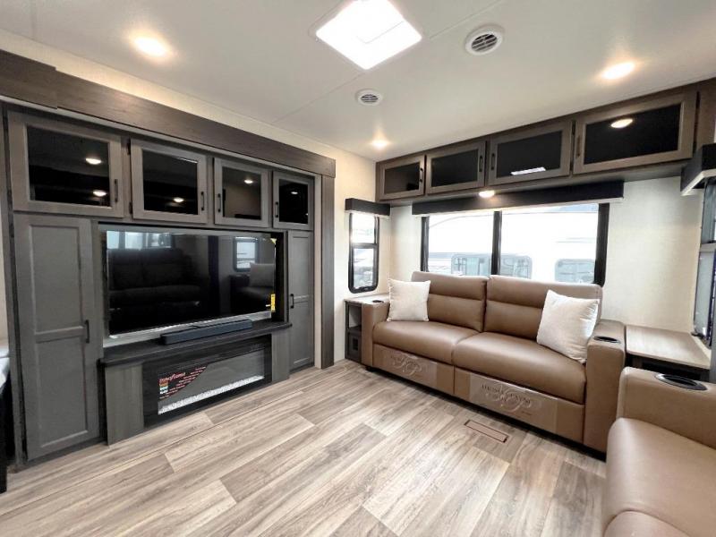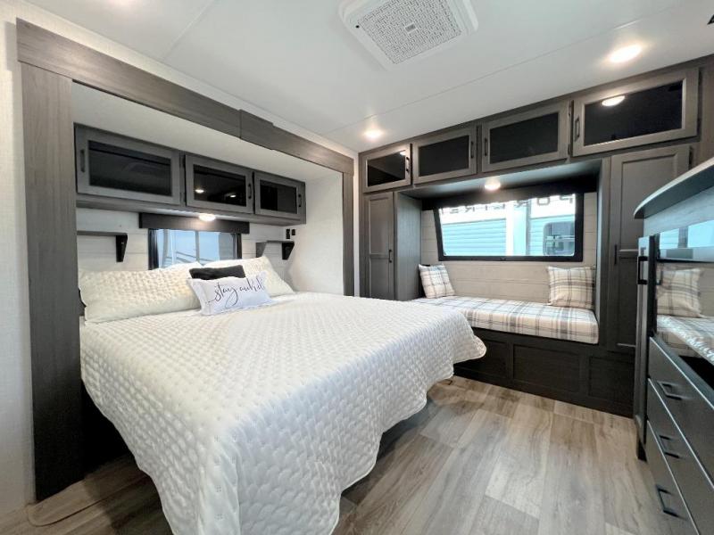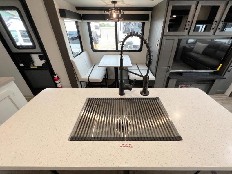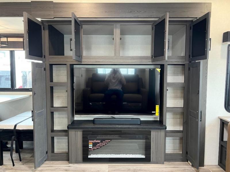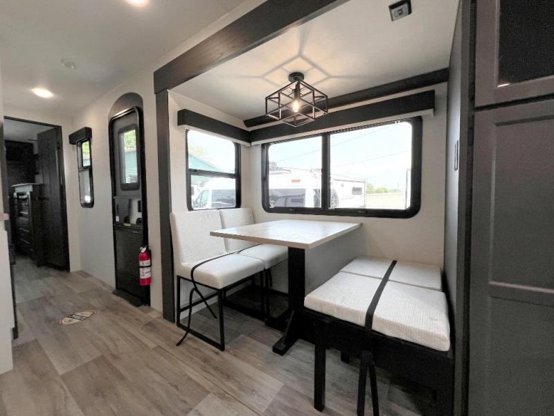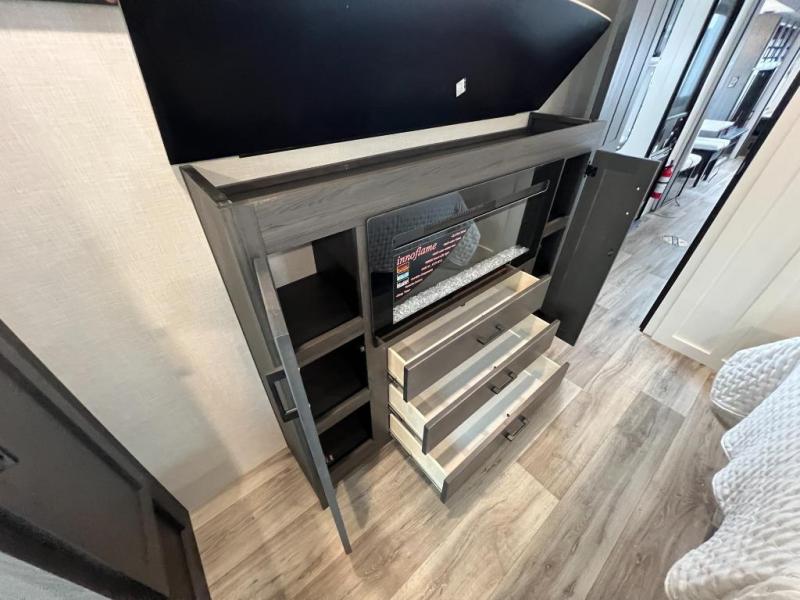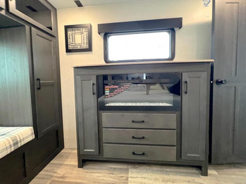 Pack your bags and hitch up this travel trailer for a great weekend camping trip! The front private bedroom has a 70" x 80" Sleep Tight king bed slide to lay your head at night, a dresser with a 30" frameless fireplace, a window seat with shelves on either side for your books, and a wardrobe with washer and dryer prep. Freshen up each morning in the full bathroom with the 30" x 36" shower then head to the kitchen to fry up some eggs on the three burner cooktop and pour a cold glass of orange juice stored in the 10 cu. ft. refrigerator. The kitchen island will make your meal prepping easier and the table and chairs offer a comfortable place to enjoy your meals or play card games. You could even cook your meals at the exterior campfire café and set up a table underneath one of the two power awnings!