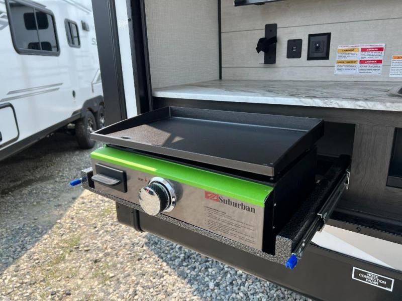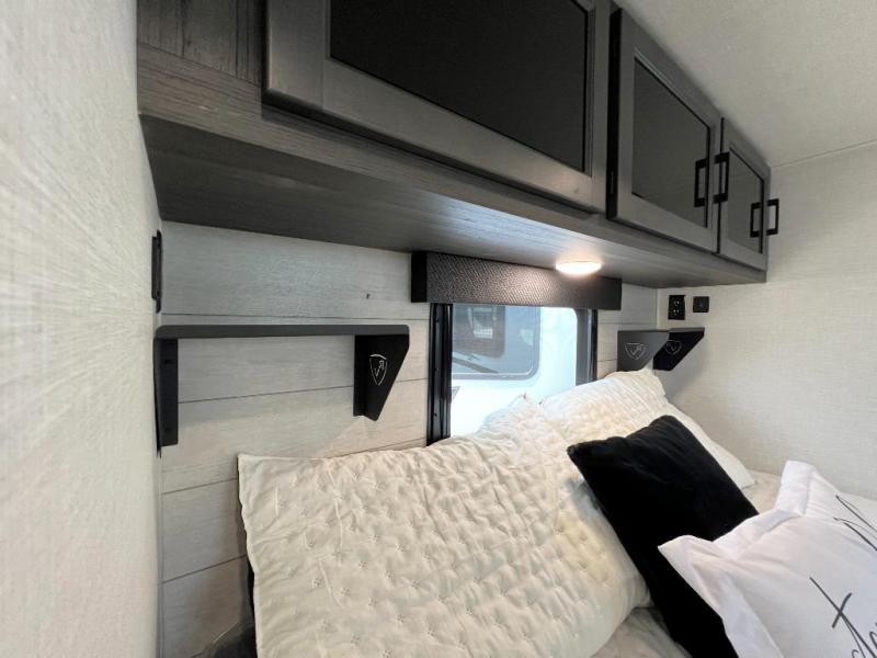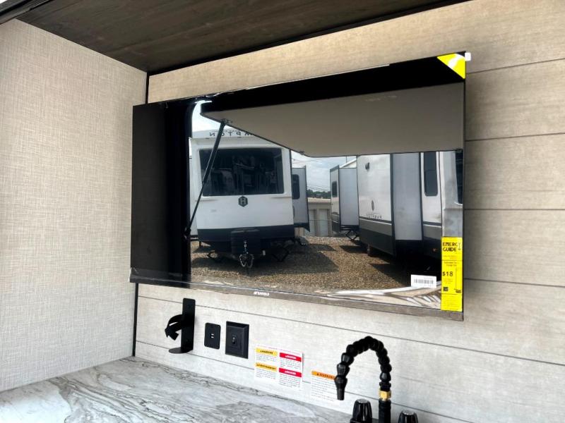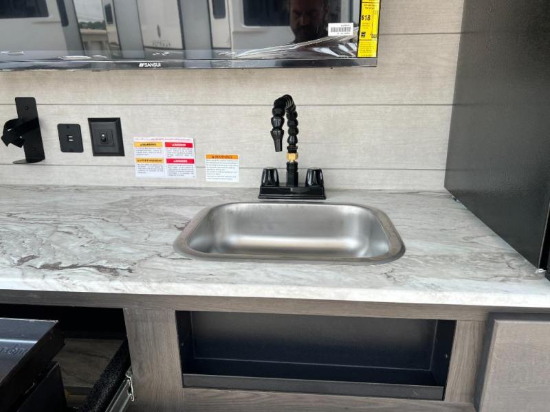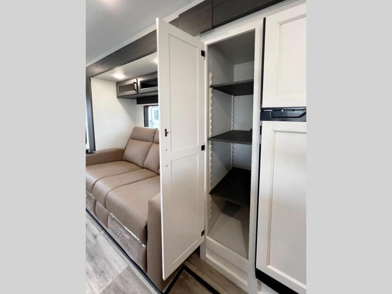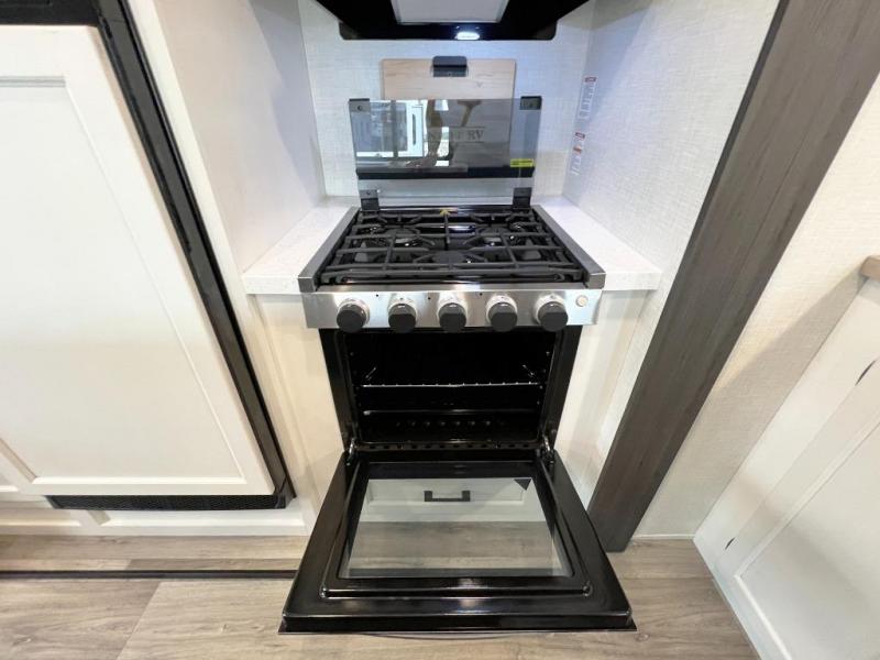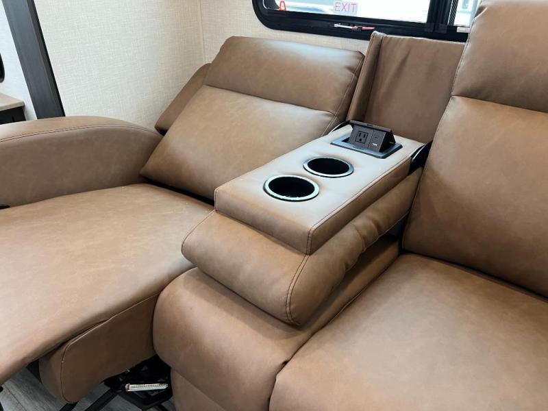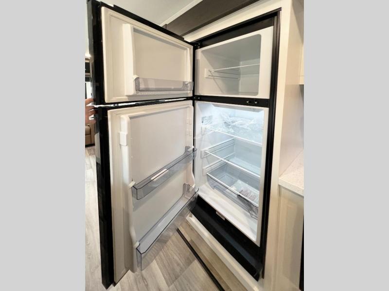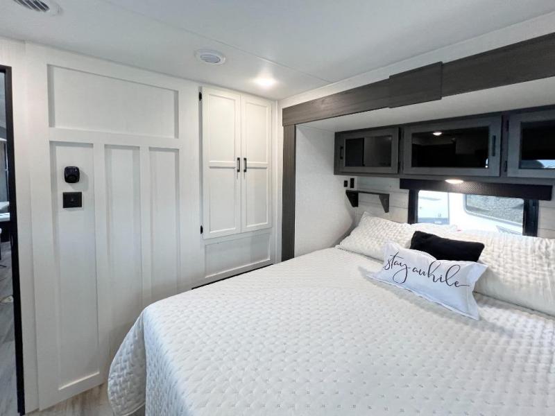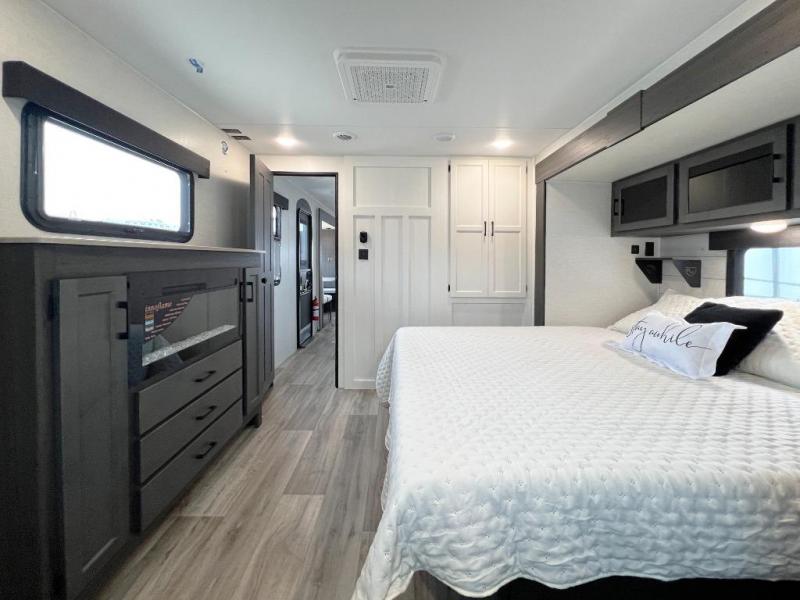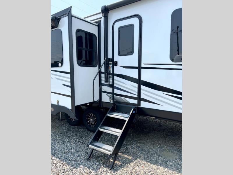 Pack your bags and hitch up this travel trailer for a great weekend camping trip! The front private bedroom has a 70" x 80" Sleep Tight king bed slide to lay your head at night, a dresser with a 30" frameless fireplace, a window seat with shelves on either side for your books, and a wardrobe with washer and dryer prep. Freshen up each morning in the full bathroom with the 30" x 36" shower then head to the kitchen to fry up some eggs on the three burner cooktop and pour a cold glass of orange juice stored in the 10 cu. ft. refrigerator. The kitchen island will make your meal prepping easier and the table and chairs offer a comfortable place to enjoy your meals or play card games. You could even cook your meals at the exterior campfire café and set up a table underneath one of the two power awnings!