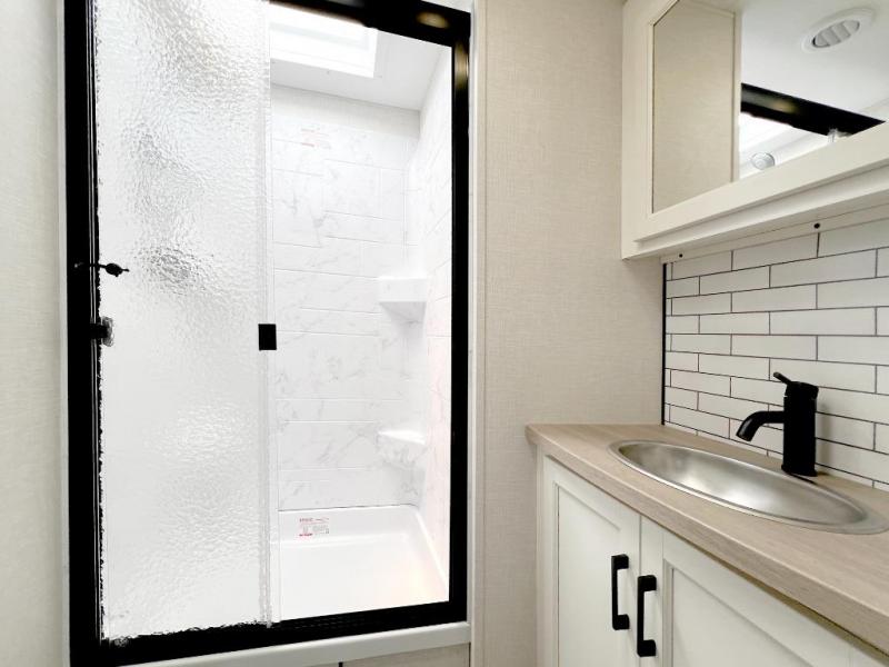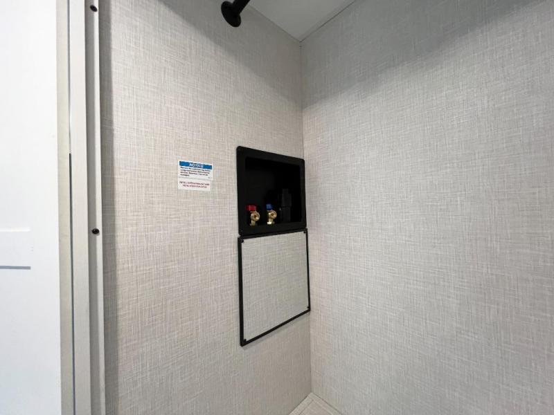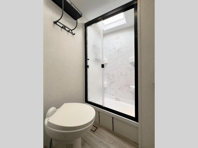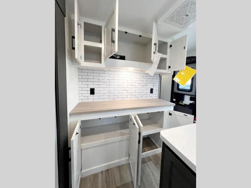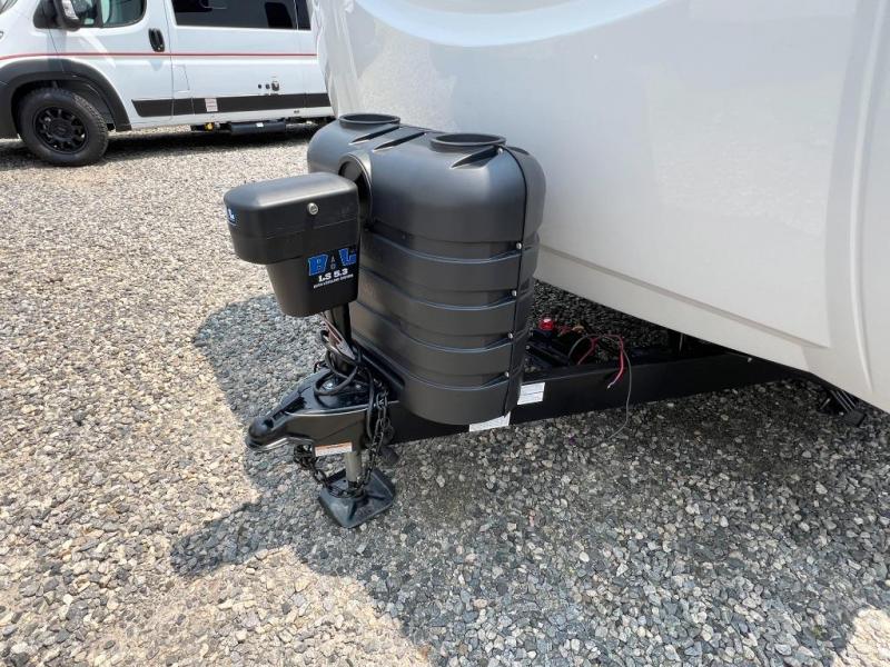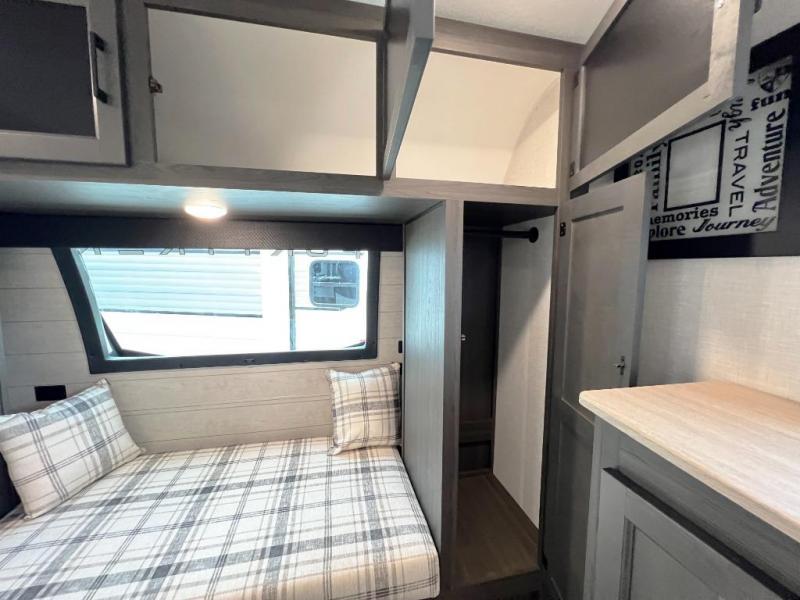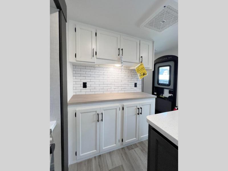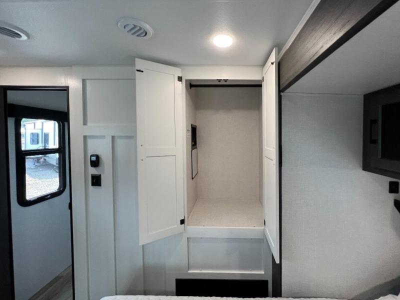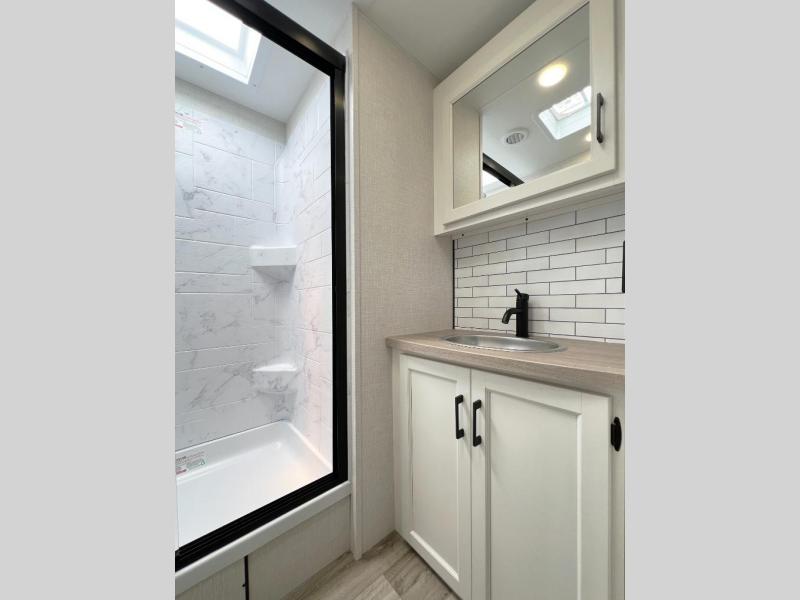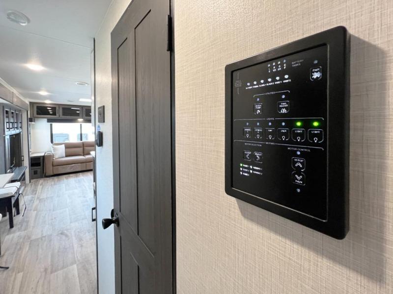 Pack your bags and hitch up this travel trailer for a great weekend camping trip! The front private bedroom has a 70" x 80" Sleep Tight king bed slide to lay your head at night, a dresser with a 30" frameless fireplace, a window seat with shelves on either side for your books, and a wardrobe with washer and dryer prep. Freshen up each morning in the full bathroom with the 30" x 36" shower then head to the kitchen to fry up some eggs on the three burner cooktop and pour a cold glass of orange juice stored in the 10 cu. ft. refrigerator. The kitchen island will make your meal prepping easier and the table and chairs offer a comfortable place to enjoy your meals or play card games. You could even cook your meals at the exterior campfire café and set up a table underneath one of the two power awnings!