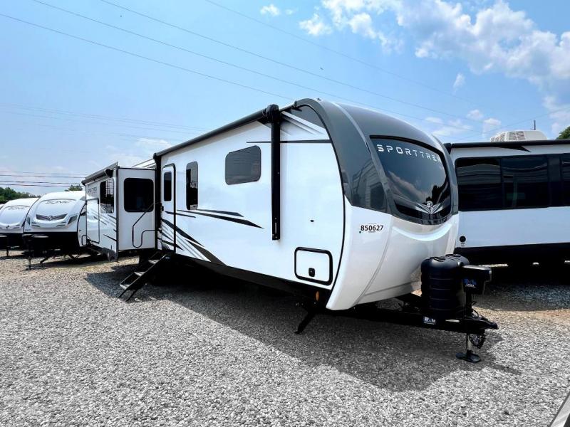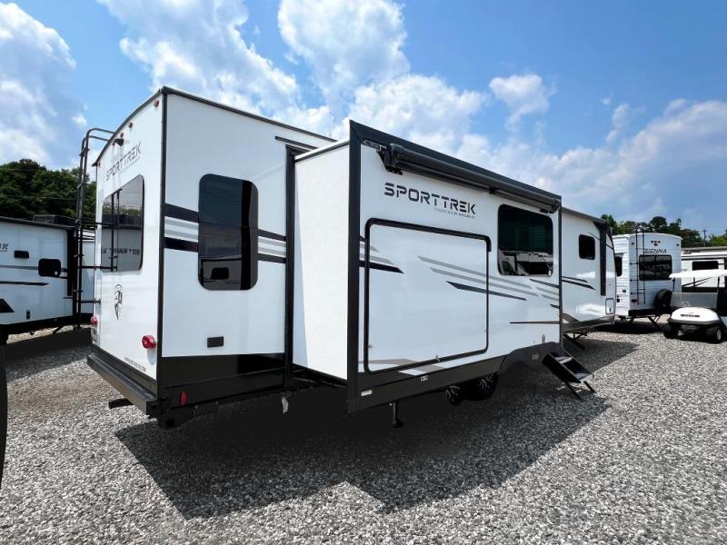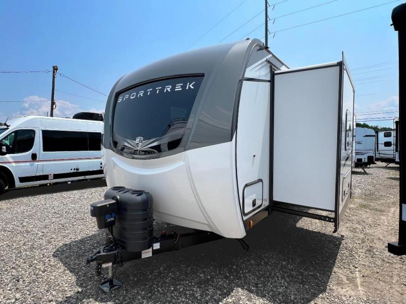 An elegant design and new features come with every one of these Venture RV SportTrek Touring Edition travel trailers! The NXG Huck bolt frame holds these units together and a walkable roof covers them. Heads will turn down the highway and at the campsite with an upgraded graphics package and a painted fiberglass front cap with integrated LED light. The exterior pass-through storage area has slam latch baggage doors with magnetic catches so you don't have to worry about them closing on you and a motion activated light to see your items clearly even at night. Luxury abounds throughout these units, especially with the mandatory Interior Luxury package which comes solid surface kitchen countertops, designer valances with fabric nightshades, two 30" frameless fireplaces, and Beauflor wood plank flooring that is easy to clean. Come find your favorite model today!