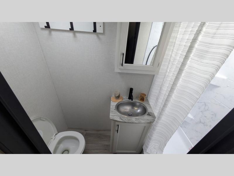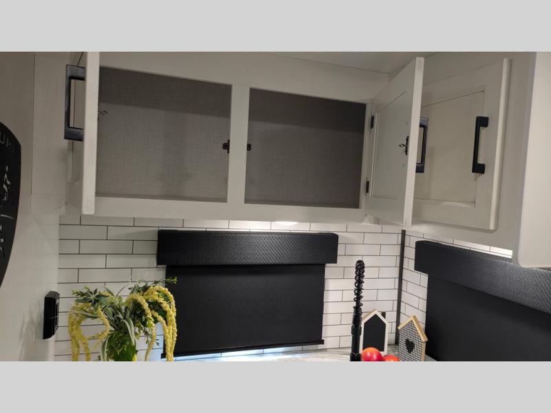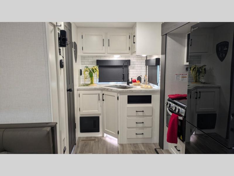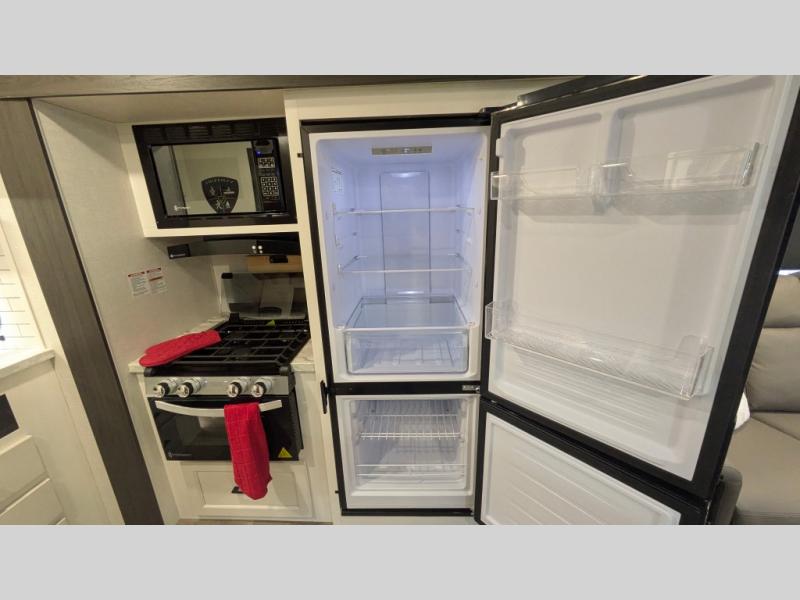 You and your spouse will have a good time at the campground in this travel trailer! The front sleep tight queen bed has shelves and overhead cabinets to keep your items close by but out of the way. Grab some eggs from the 10 cu. ft. refrigerator to fry them up on the three burner cooktop then enjoy them at the 88" x 42" U-shaped dinette which has an entertainment center above it. After a fun, long day at the beach you can freshen up in the rear corner bathroom in the 30" x 36" shower then relax on the theater seating with USB ports and cupholders!