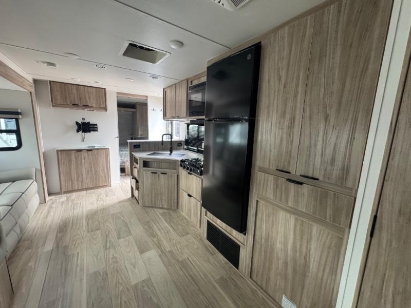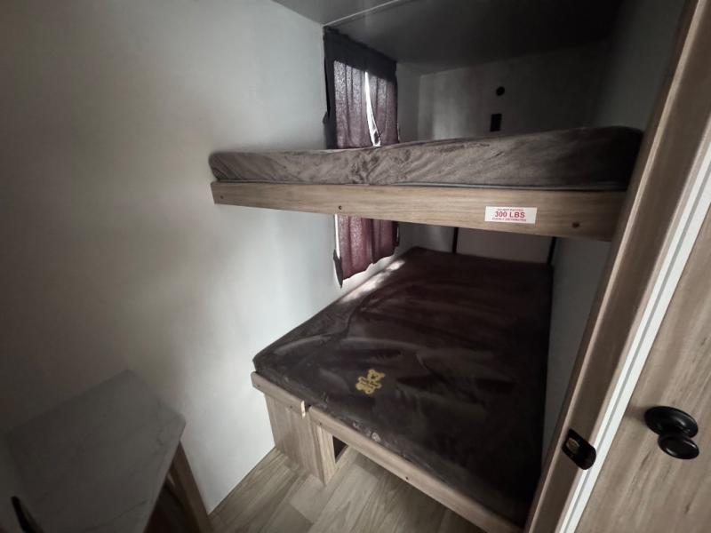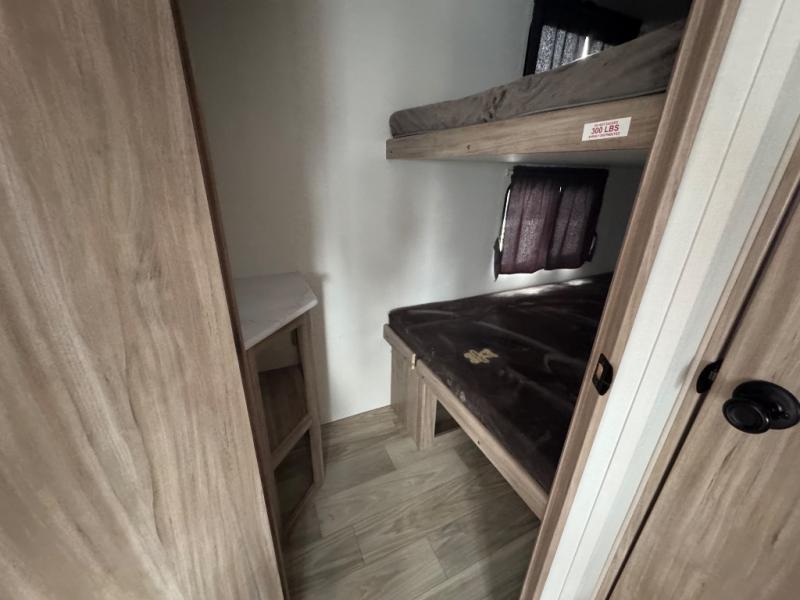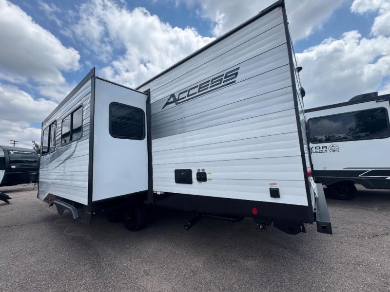 Your family of seven will enjoy camping in this Access camper. You will have the choice of cooking both inside and out with the accessible outdoor kitchen featuring a pull-out griddle and 1.6 cu. ft. refrigerator for drinks. On the inside, a three burner cooktop, pantry for dry goods, and a 10 cu. ft. refrigerator make creating meals and snacks easy. For sleeping, your family will find comfort in a set of 44" x 74" bunks located in a private bunk room with storage cubbies for your belongings, a booth dinette that can also be transformed into sleeping for one or two at night depending on size, plus the front private bedroom which features a queen bed. Besides the dinette for seating, you also have theater seating for two inside. Add an optional TV for movie watching when the weather doesn't cooperate outdoors for fun activities. On the exterior, you will find a convenient Pack-N-Play door beneath the bunks, plus an exterior pass through storage compartment up front for lawn chairs, outdoor games, and so much more.