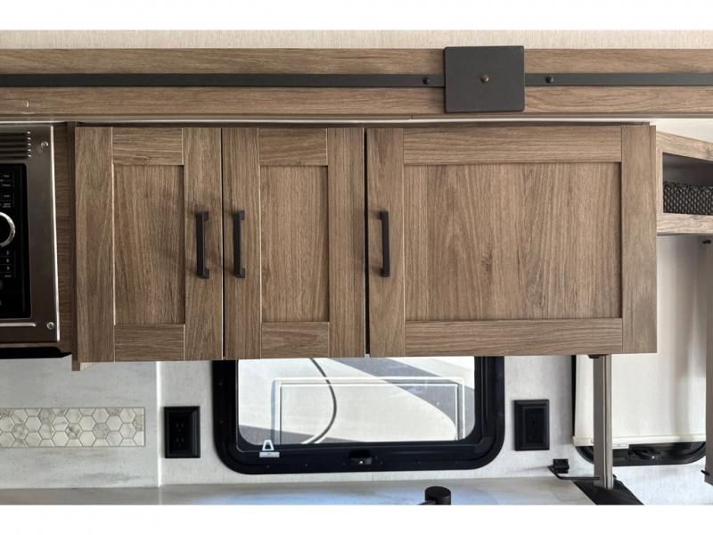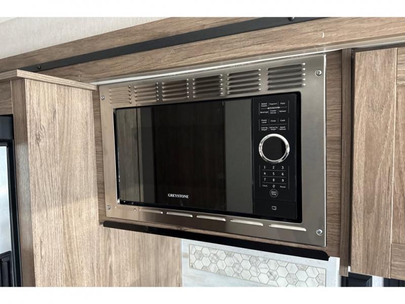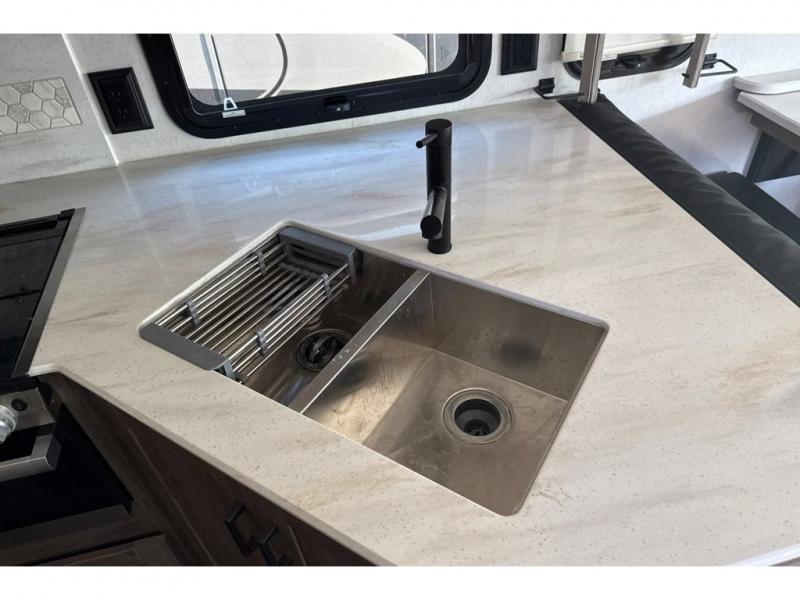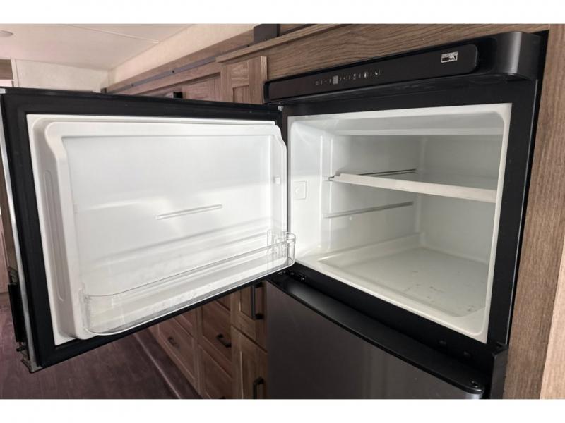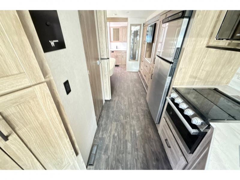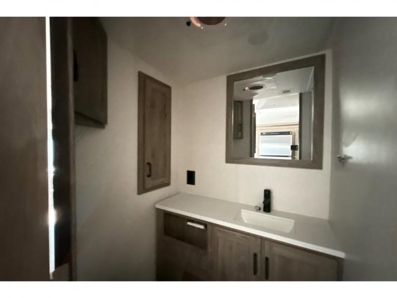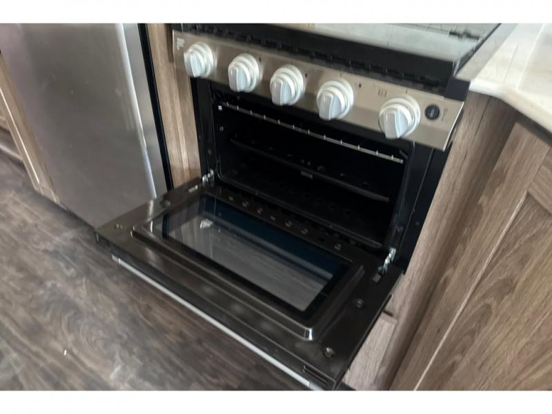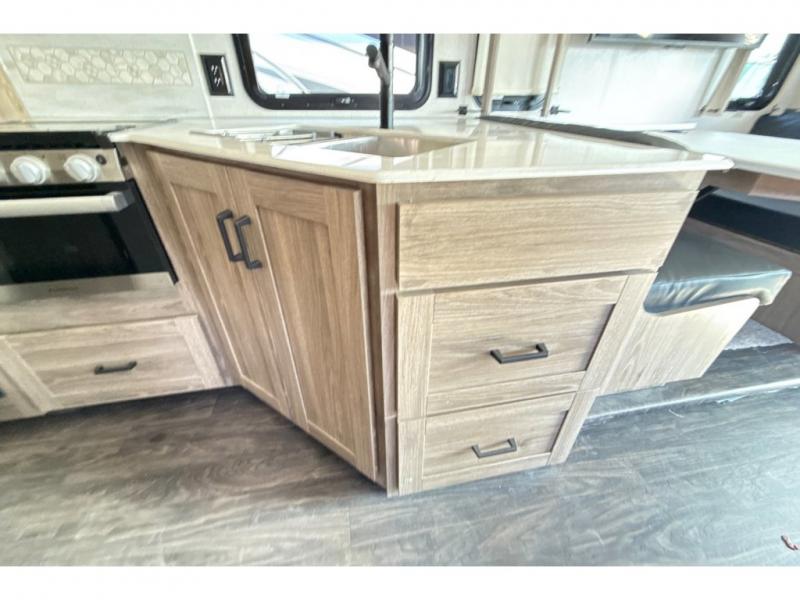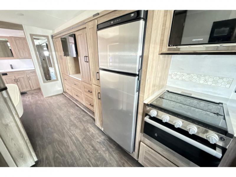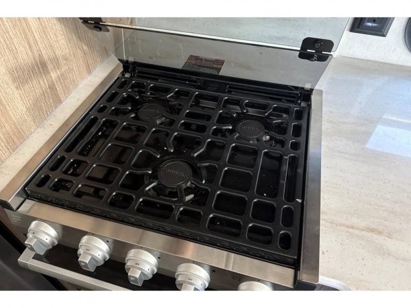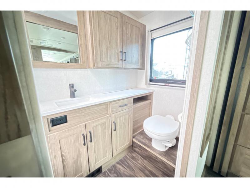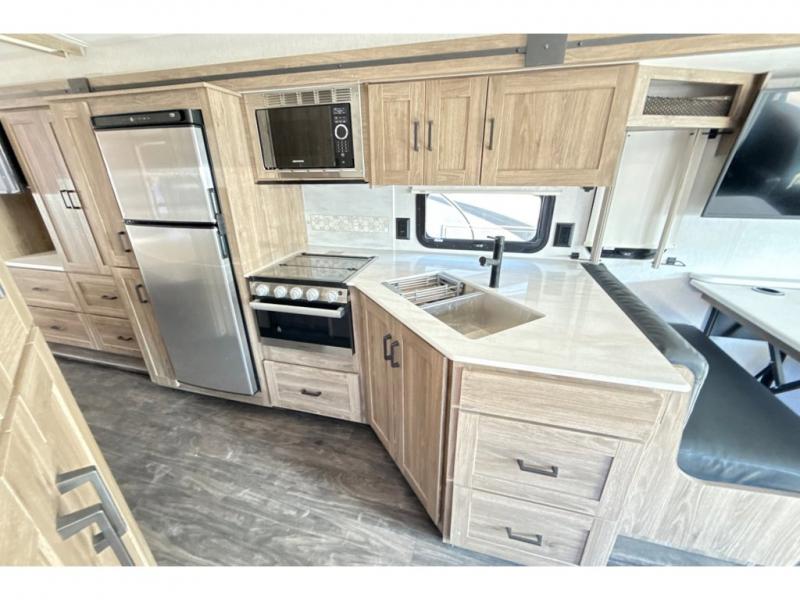This Class A Vista from Winnebago has tons of great features. You'll love the private bedroom that includes a king bed, dual wardrobes, and a full rear bath with a 36" x 36" shower. An additional half bath is convenient for guests or when you have a big group travelling together. There are plenty of places to sleep, with a standard sofa bed and an optional StudioLoft drop-down bed that is designed to accommodate two additional guests with a generous 600-lb. capacity. The well-equipped kitchen has a three-burner cooktop, stainless steel double sink, 10 cu. ft. refrigerator, and two pantries. An additional coat closet by the door plus exterior lighted storage compartments means there's plenty of room for all your gear.