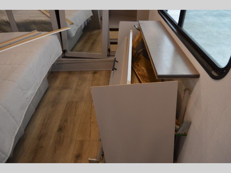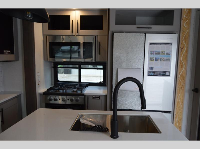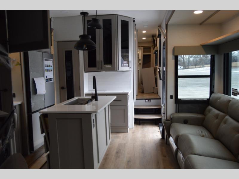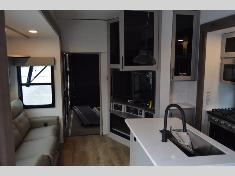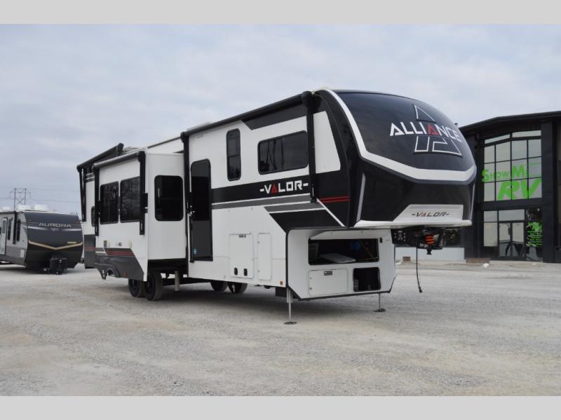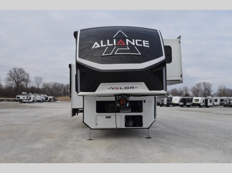 You can bring your toys with you wherever you go with any one of these Alliance RV Valor toy hauler fifth wheels! They are adventure-ready with a quality build from the walk on roof with seamless PVC roof covering to the commercial grade vinyl flooring and MorRyde CRE3000 suspension system. The Performance Running Gear package comes with a 101" wide-body benchmark chassis platform, Dexter axles, and a space enhancing drop frame storage compartment to pack in all your riding gear. You can even go off-gridding thanks to the Off the Grid Pack that has two 400-watt solar panels, generator prep, a 60-amp charge controller, and a 100-amp hour lithium iron phosphate battery. Some of the interior comforts you will enjoy are the hardwood cabinet doors and drawers, solid surface kitchen countertops, and commercial grade vinyl flooring with no carpet to make clean up a breeze. The Valor toy haulers are also the Masters of 12 Volt with USB charging station throughout, a 12V refrigerator, and more 12-volt features to make camping hassle-free!